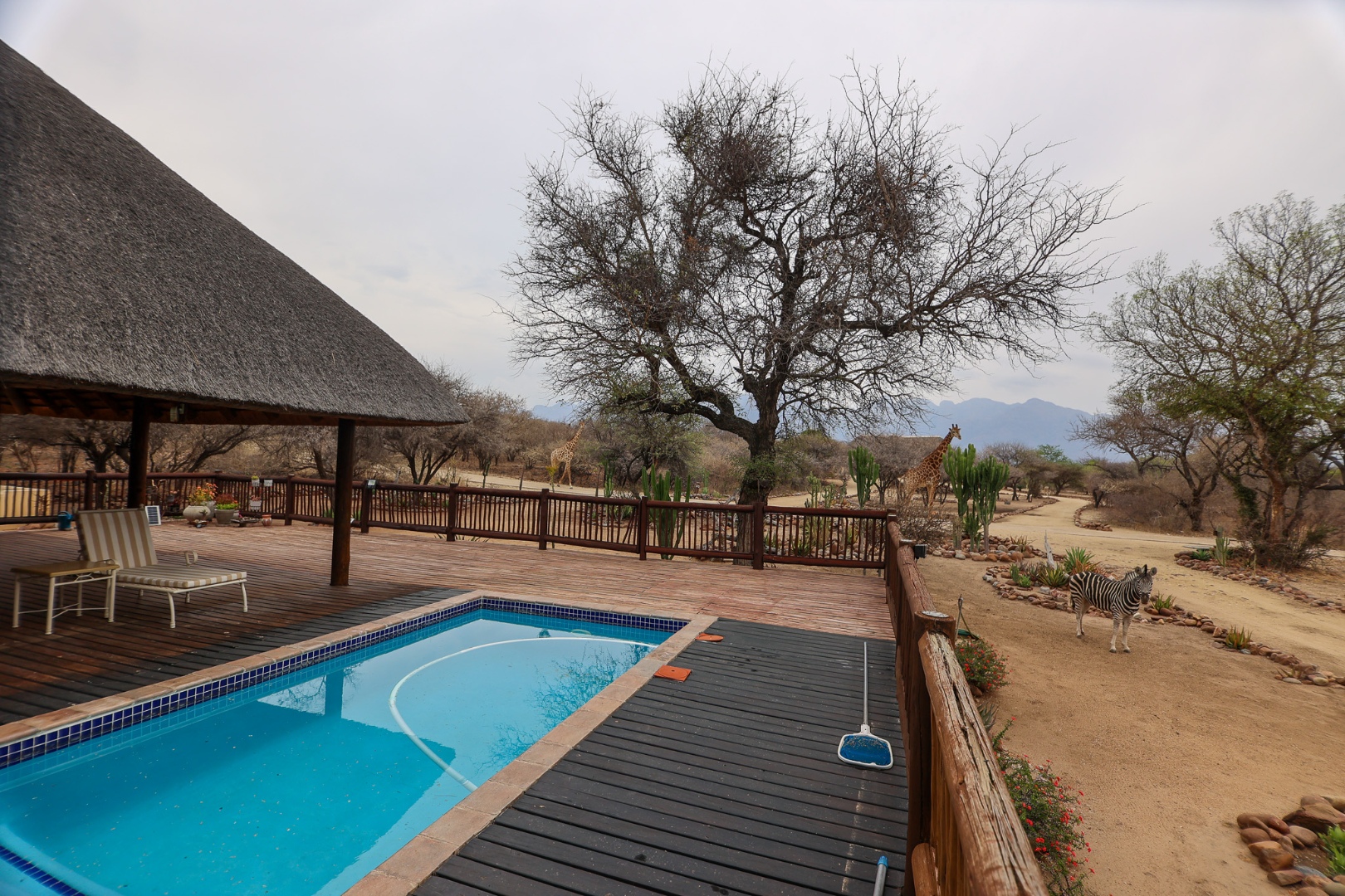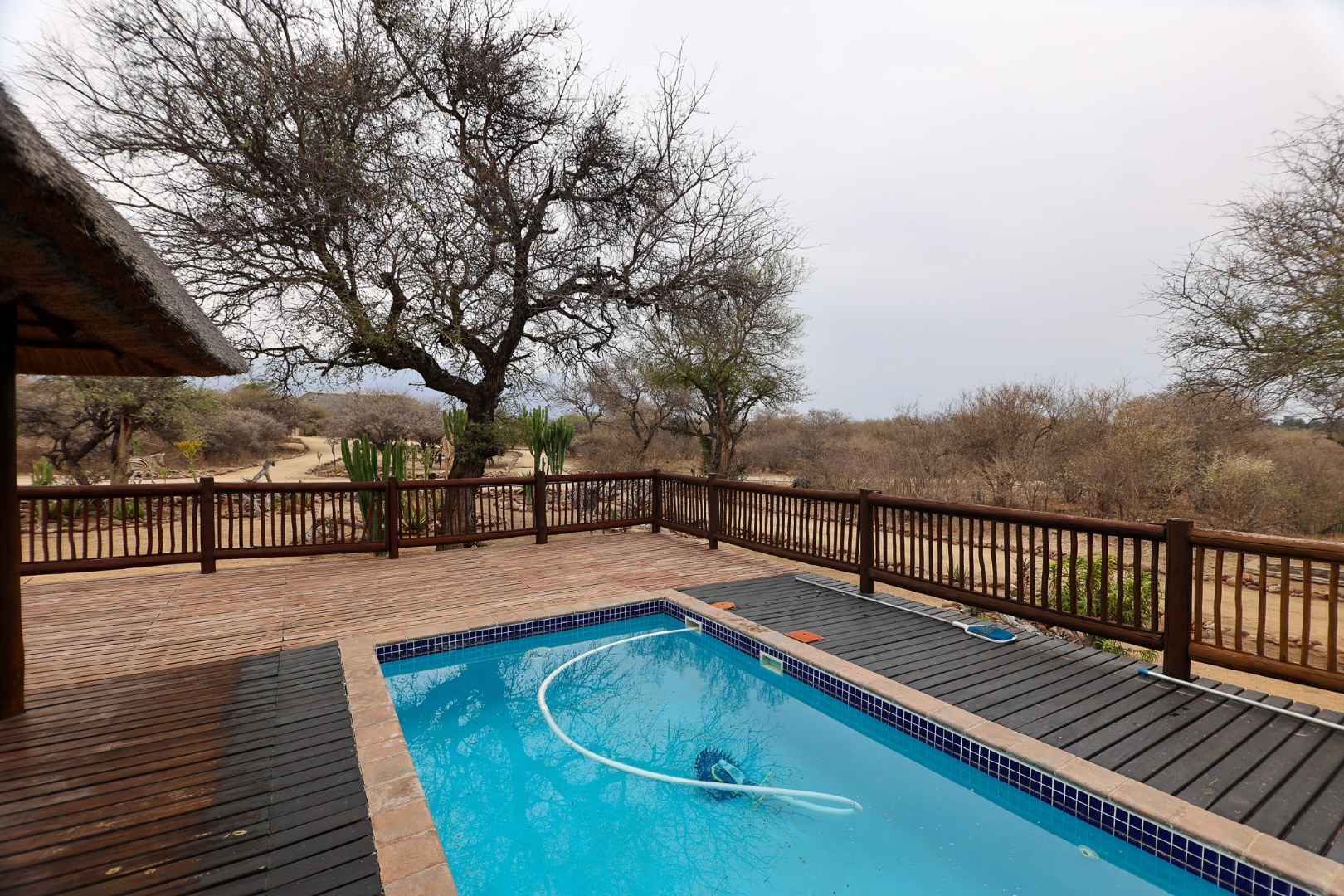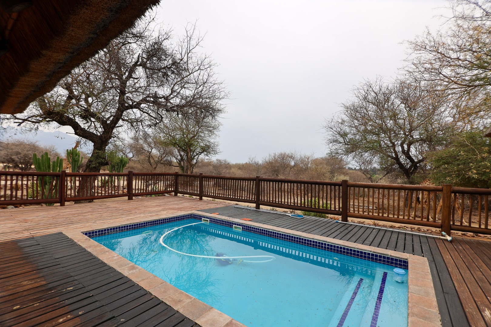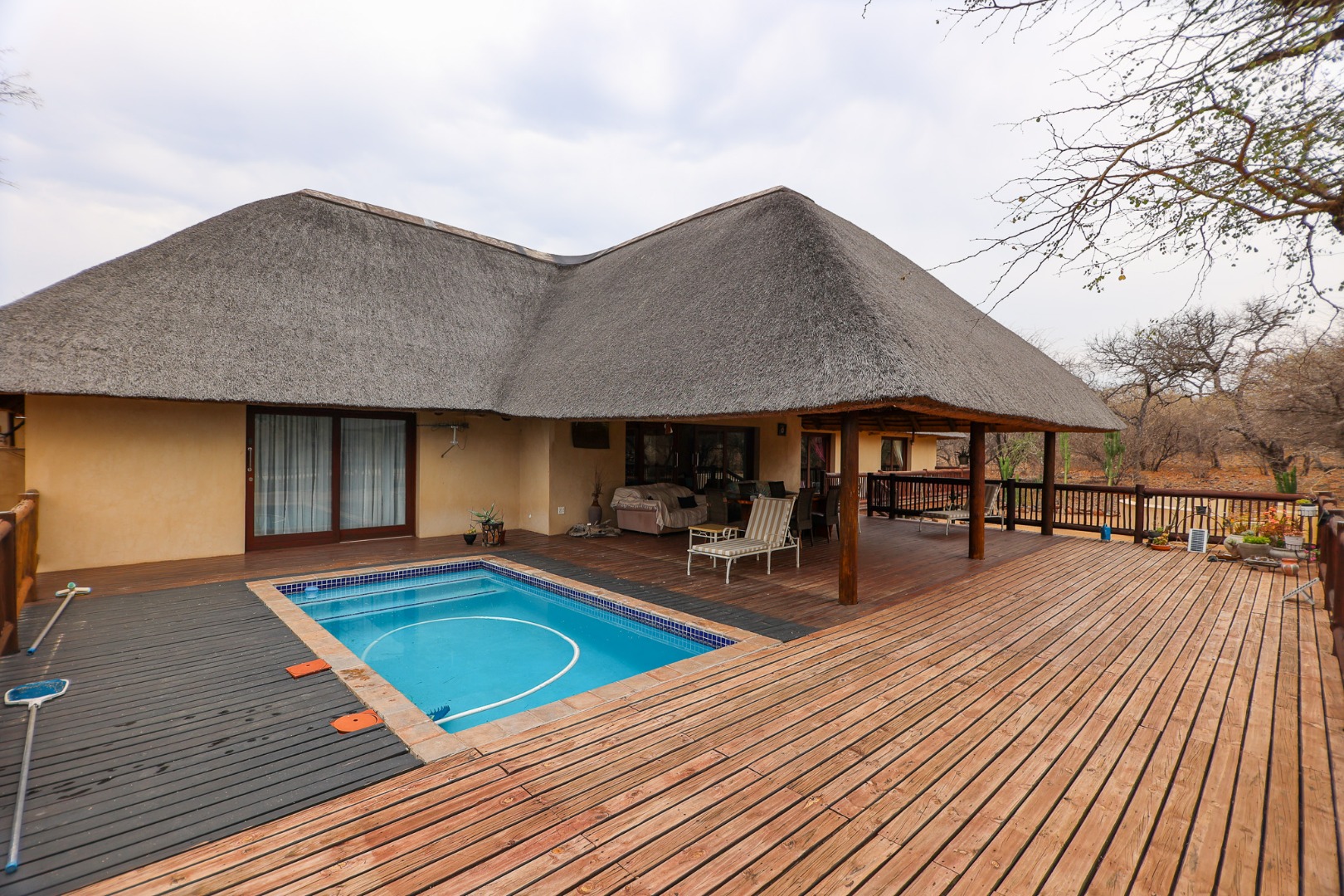 Outdoor living is a central feature of this home. The wooden deck and swimming pool are perfectly positioned for privacy and views, while a boma area invites evenings under the stars in true Lowveld style. The paved driveway leads to a garage, covered parking, and staff accommodation, completing the property’s thoughtful layout.
