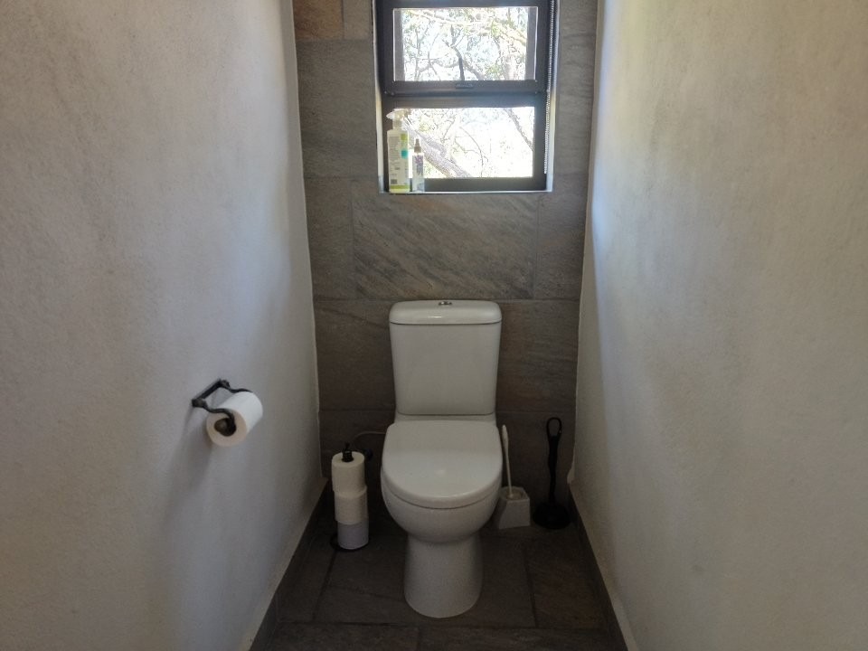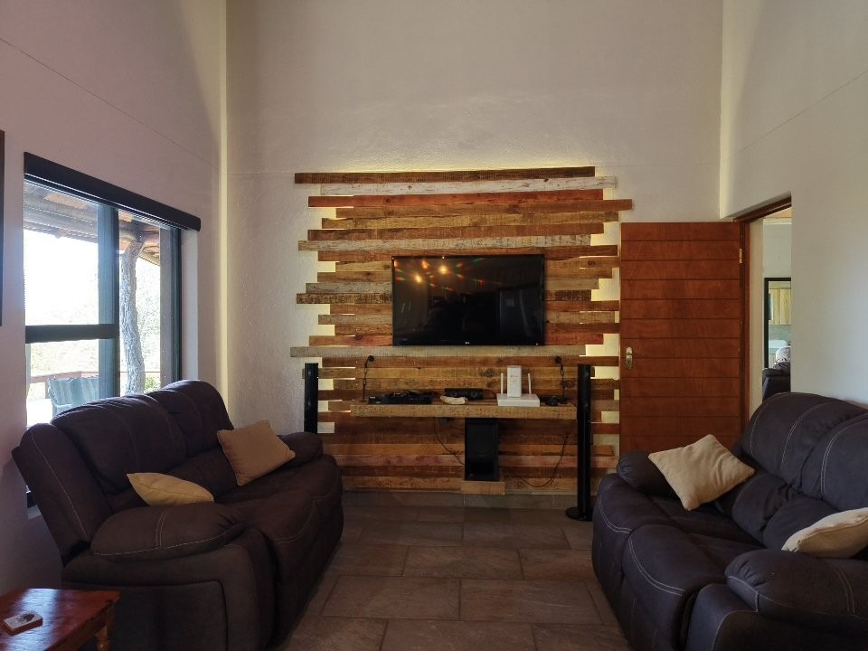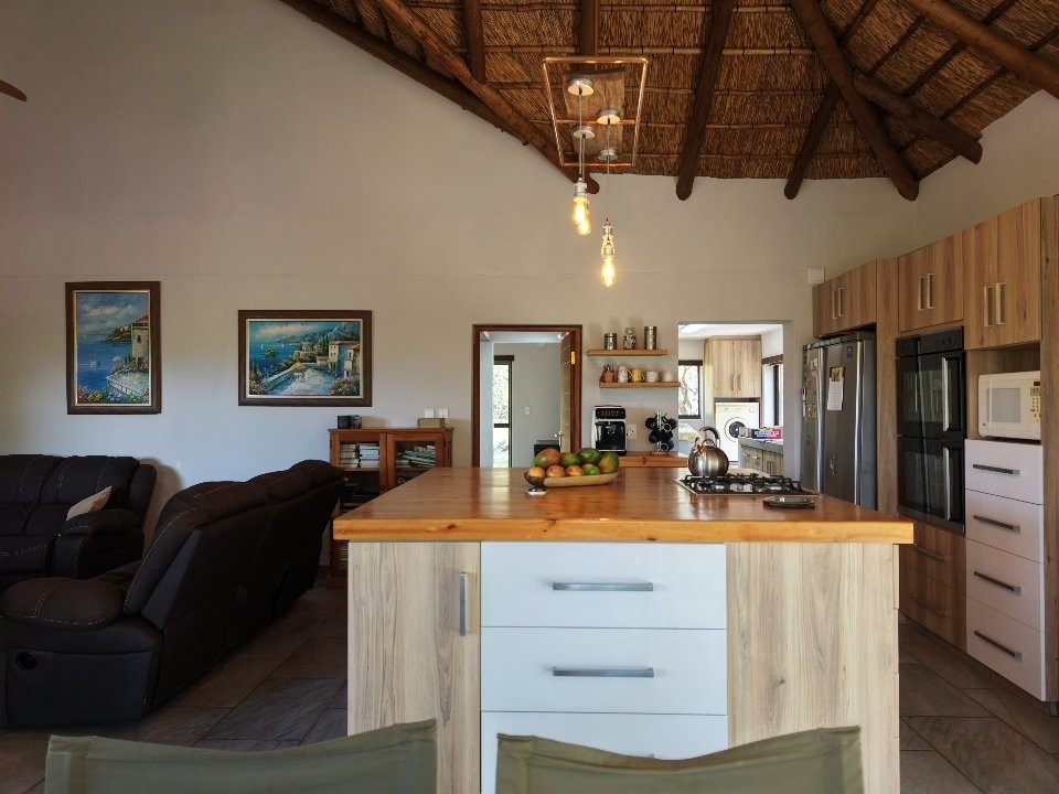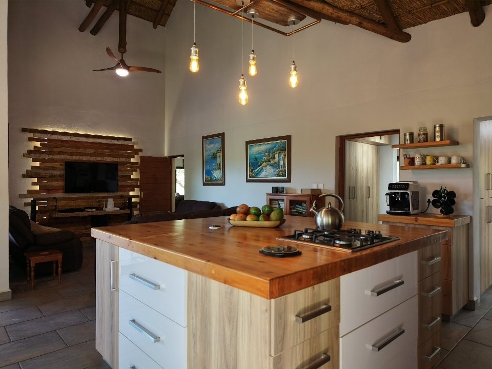 The living areas are designed to embrace the bush setting. A welcoming TV lounge and dining area flow seamlessly onto a large wrap-around patio deck — the perfect space for entertaining or simply enjoying the uninterrupted mountain views. The modern kitchen, complete with a central counter, gas stove, and separate scullery and wash area, is both efficient and well laid out, making it ideal for permanent living.