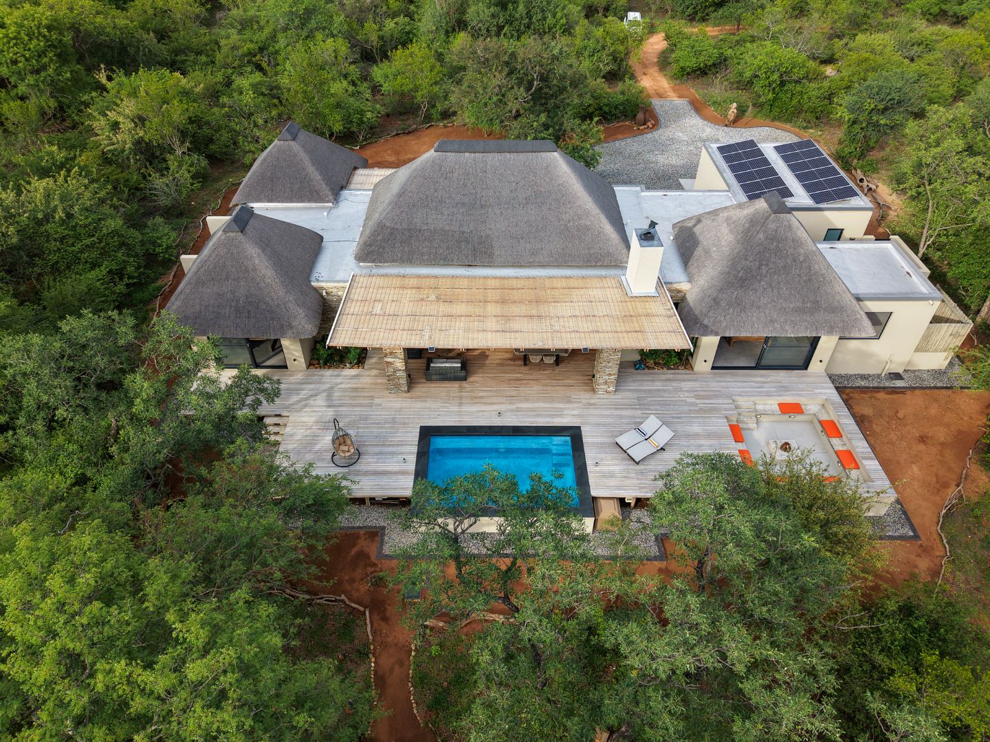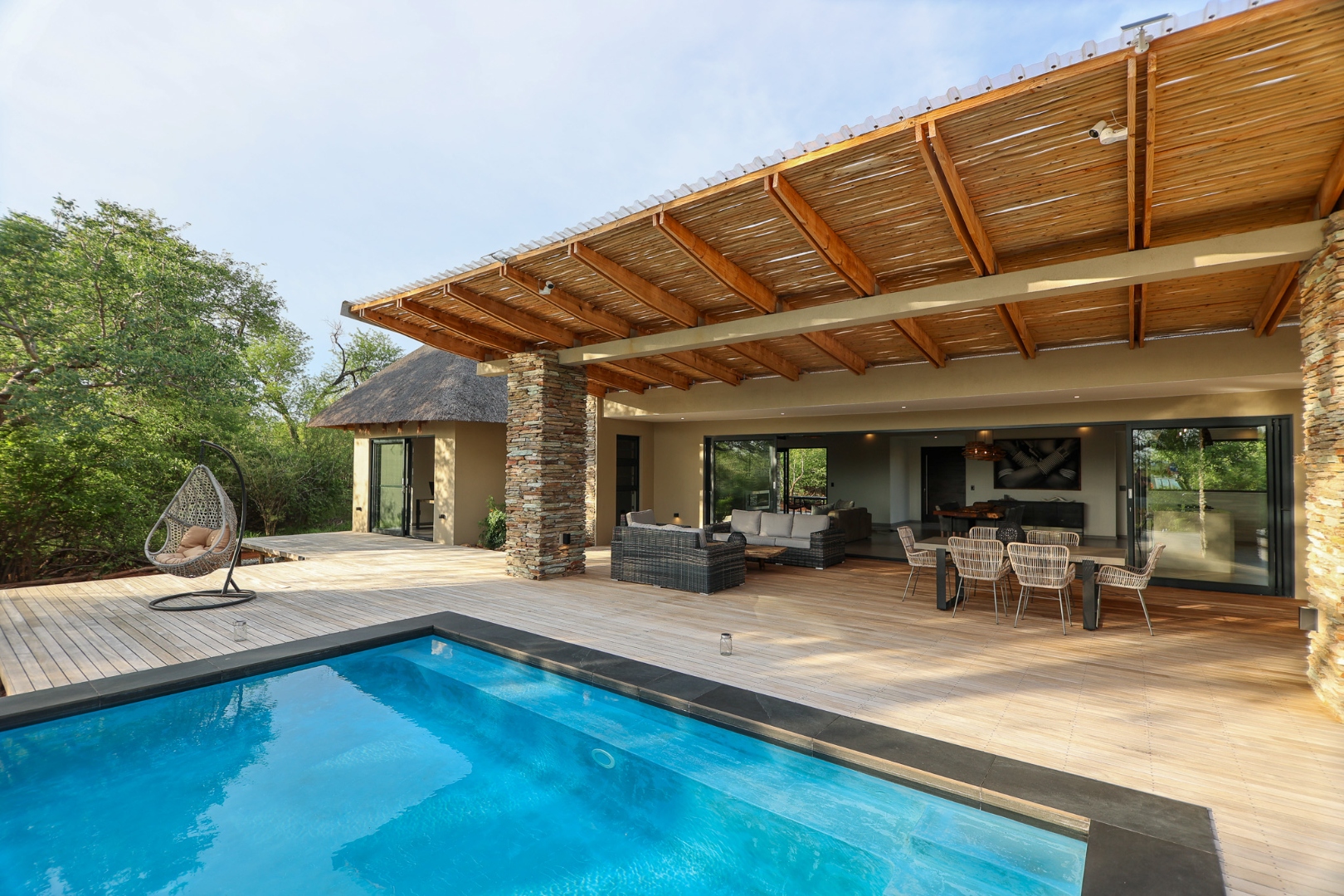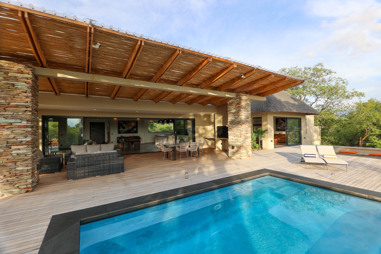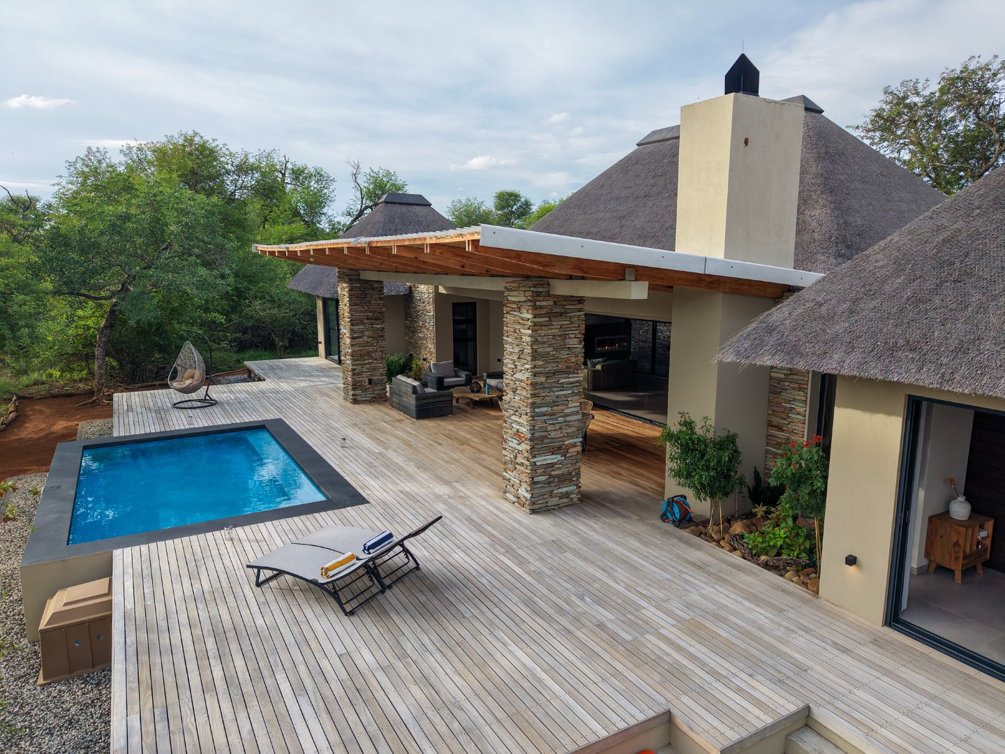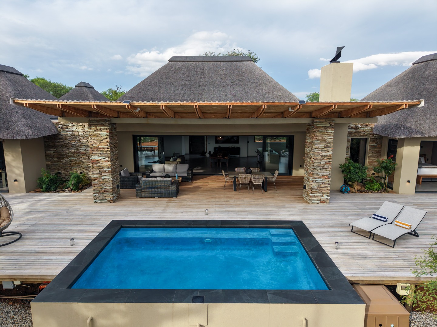 The Home is Sold Fully Furnished. This exceptional 3-bedroom residence, nestled within the prestigious Zandspruit Bush & Aero Estate, offers a harmonious blend of modern design and natural bushveld aesthetics. Characterised by striking thatched roofs, stone pillars, and extensive wood, the property exudes sophisticated safari-style charm, creating an inviting kerb appeal.