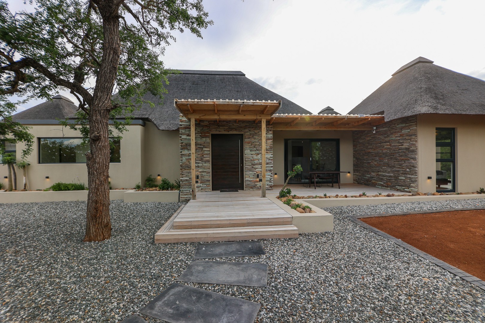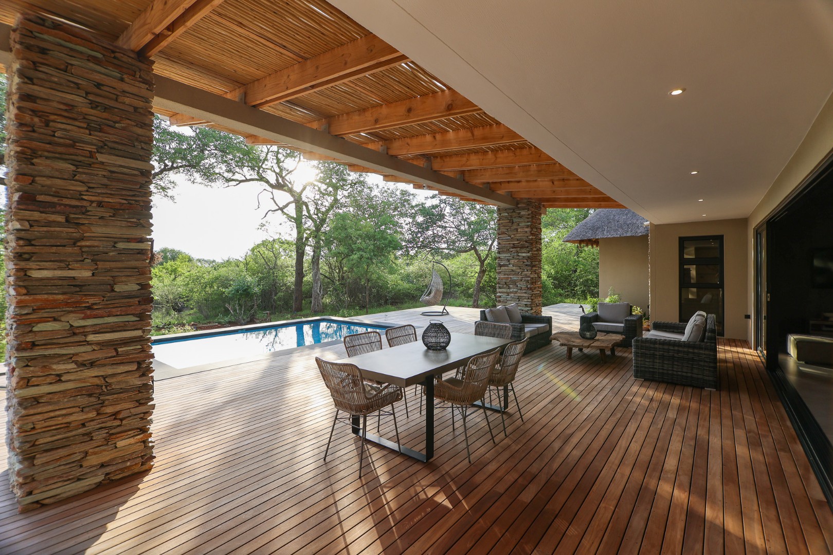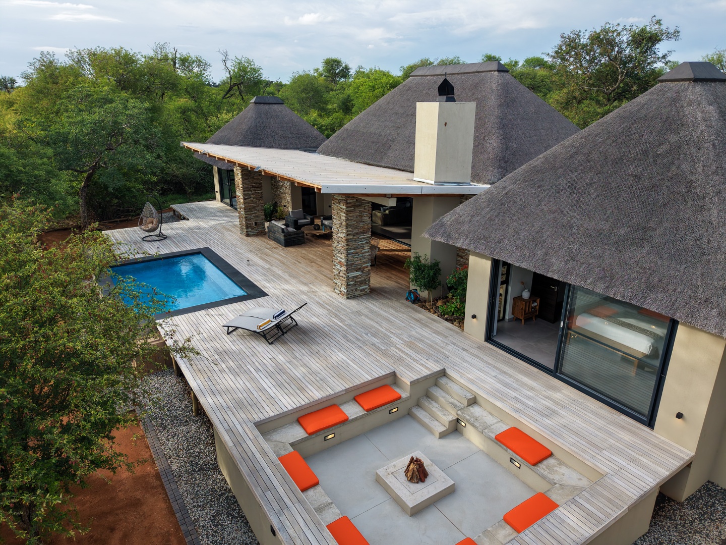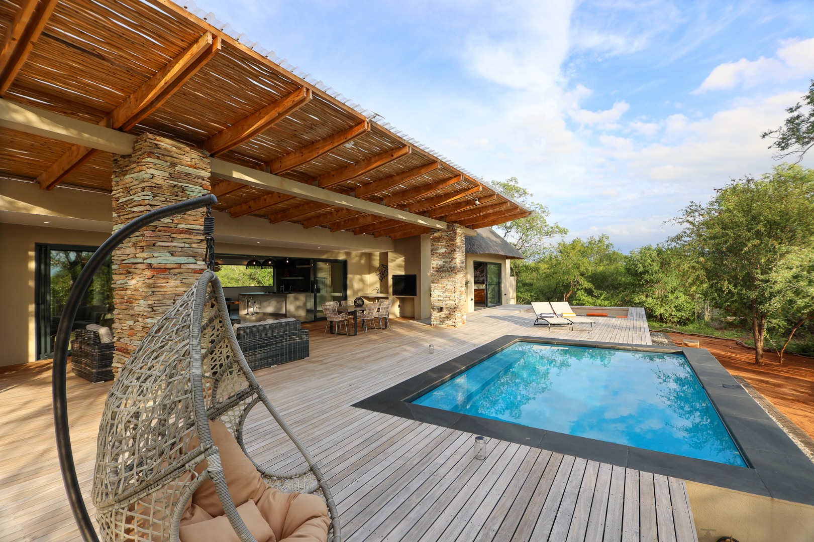 The Home is Sold Fully Furnished. This exceptional 3-bedroom residence, nestled within the prestigious Zandspruit Bush & Aero Estate, offers a harmonious blend of modern design and natural bushveld aesthetics. Characterised by striking thatched roofs, stone pillars, and extensive wood, the property exudes sophisticated safari-style charm, creating an inviting kerb appeal.