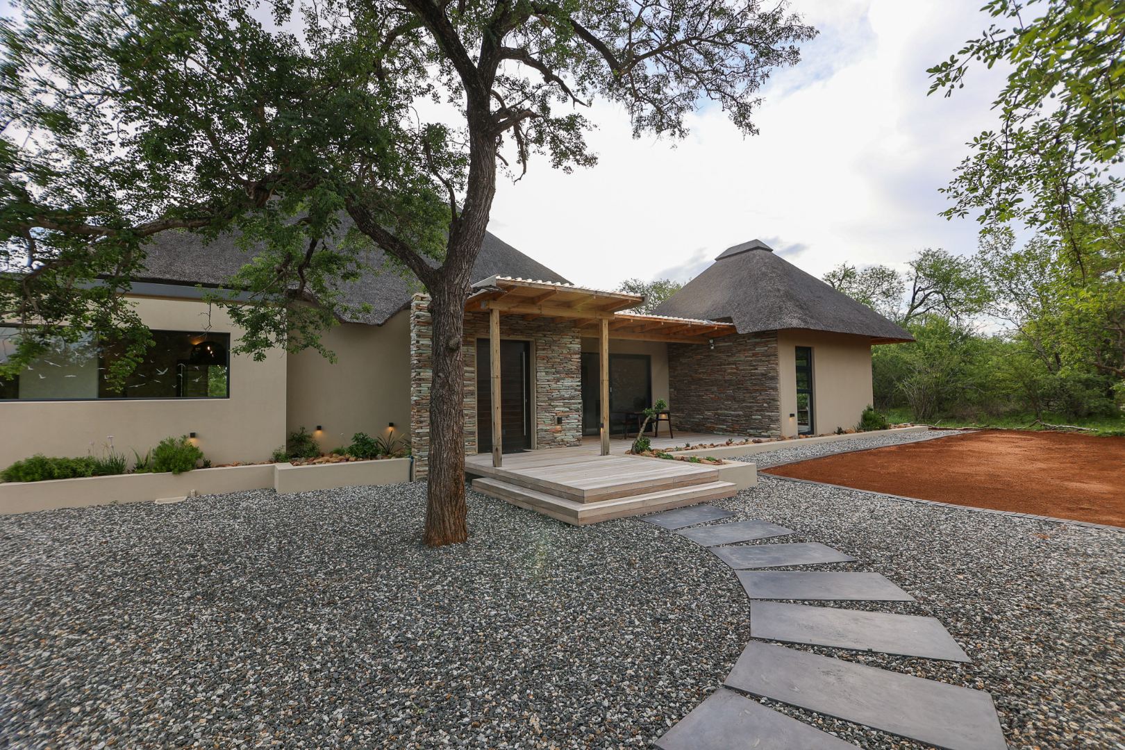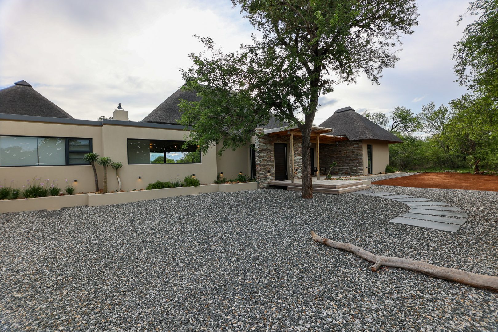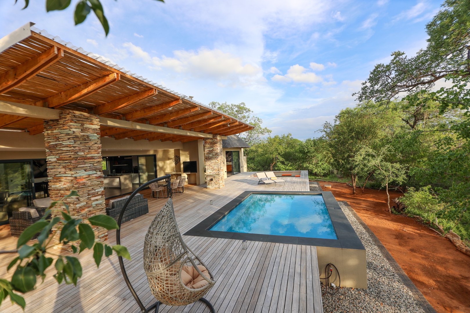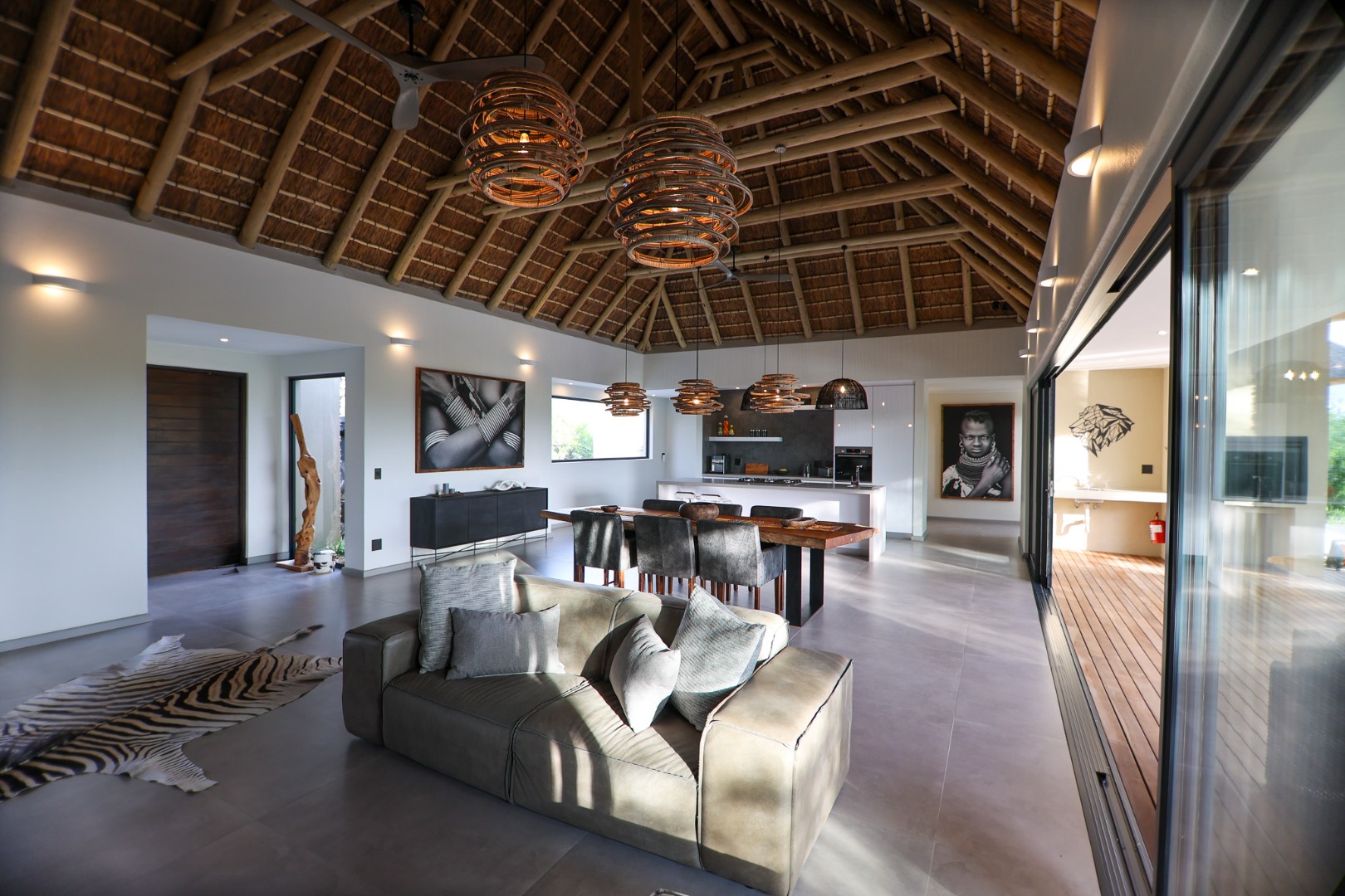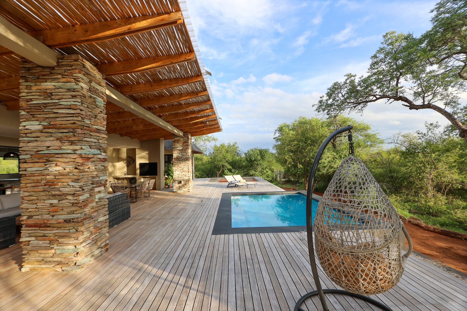 The Home is Sold Fully Furnished. This exceptional 3-bedroom residence, nestled within the prestigious Zandspruit Bush & Aero Estate, offers a harmonious blend of modern design and natural bushveld aesthetics. Characterised by striking thatched roofs, stone pillars, and extensive wood, the property exudes sophisticated safari-style charm, creating an inviting kerb appeal.