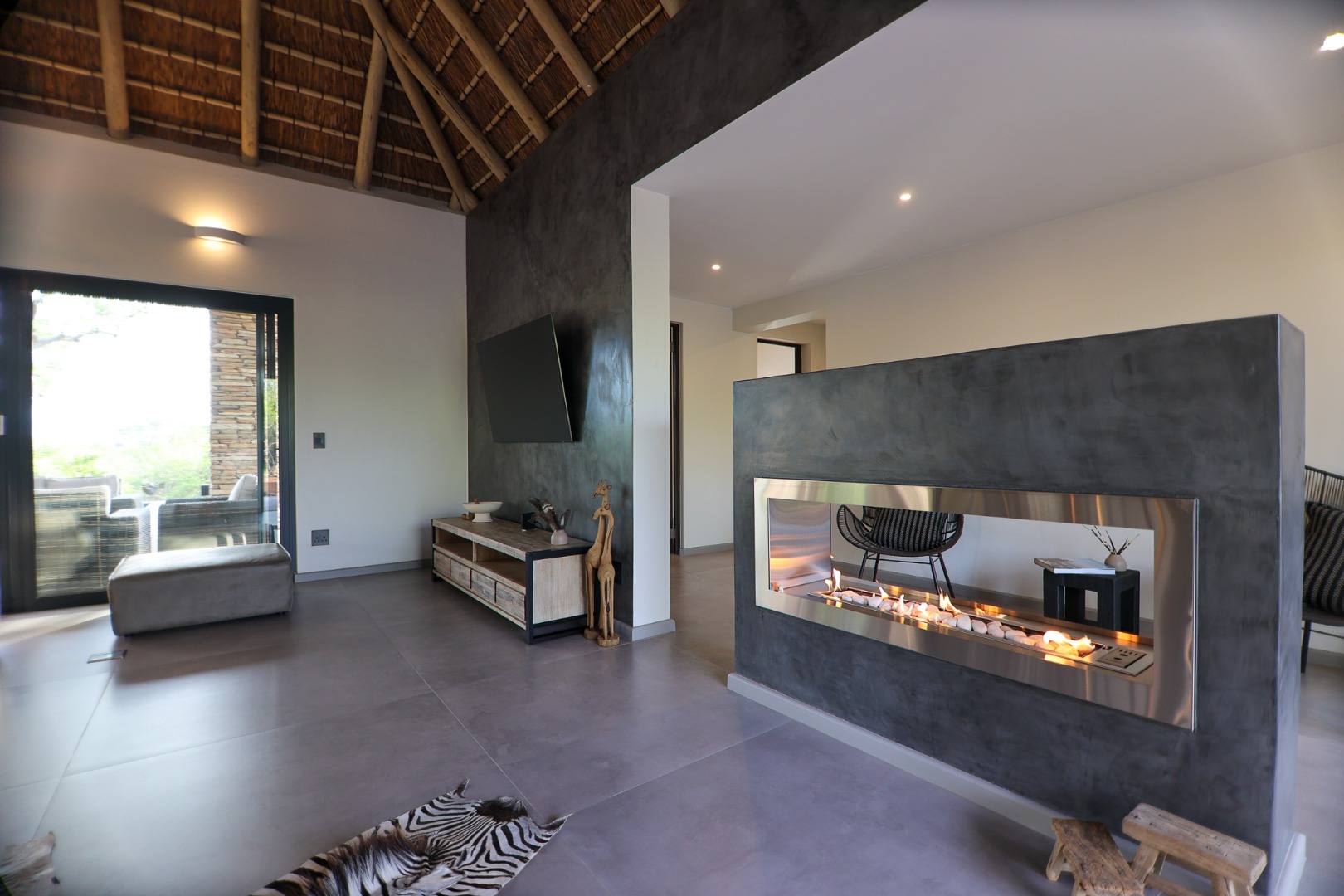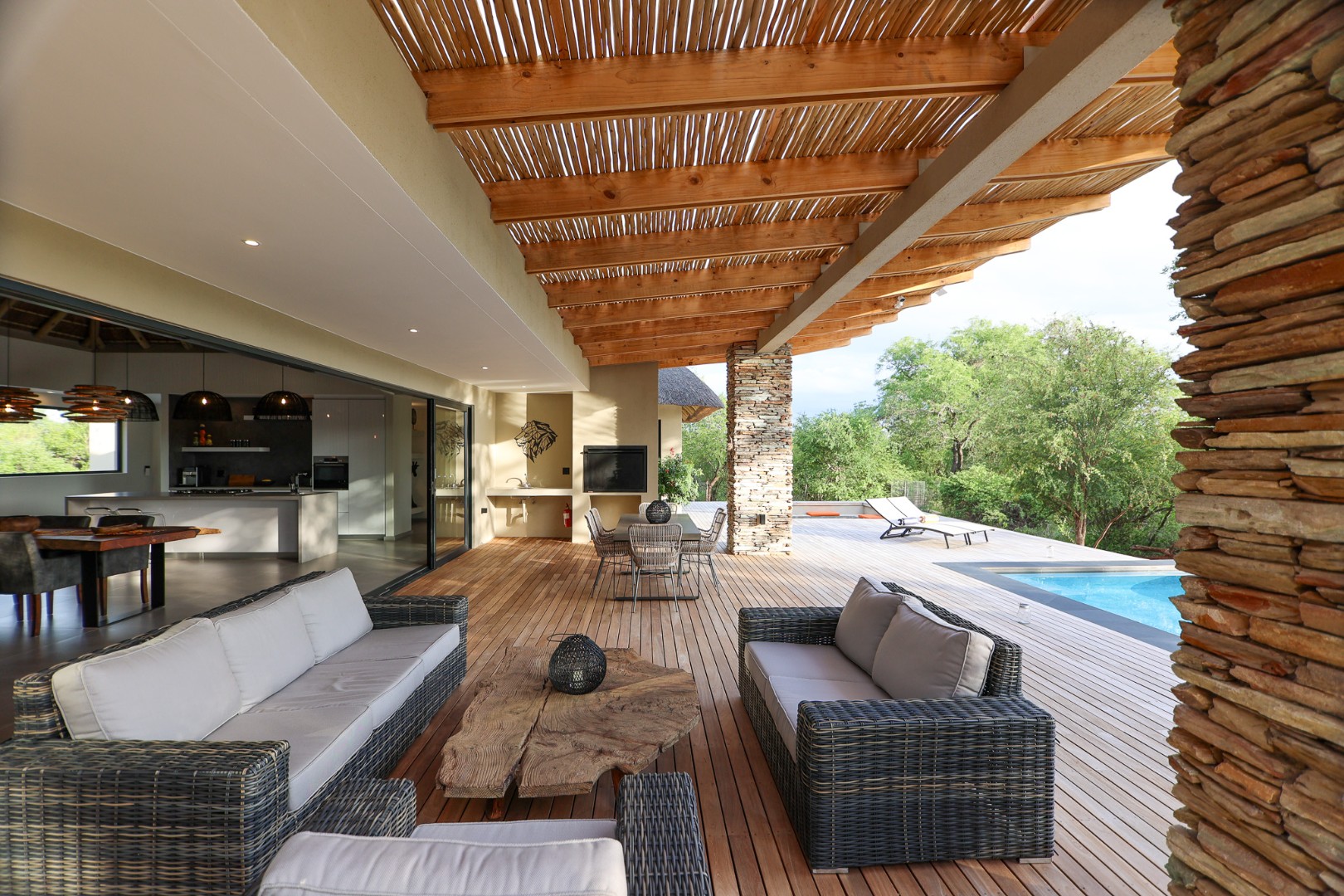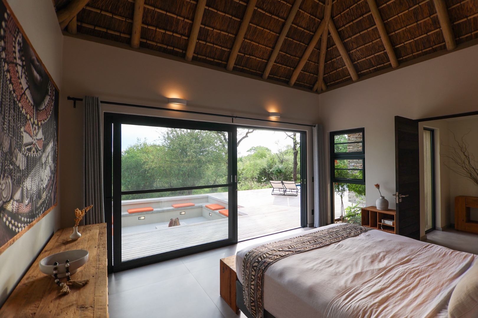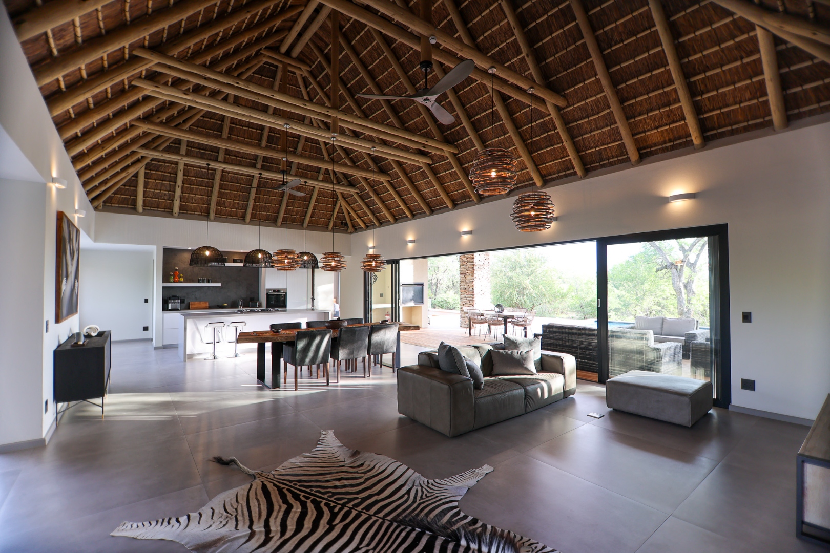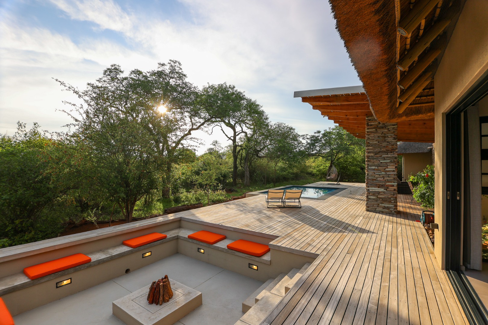 The Home is Sold Fully Furnished. This exceptional 3-bedroom residence, nestled within the prestigious Zandspruit Bush & Aero Estate, offers a harmonious blend of modern design and natural bushveld aesthetics. Characterised by striking thatched roofs, stone pillars, and extensive wood, the property exudes sophisticated safari-style charm, creating an inviting kerb appeal.