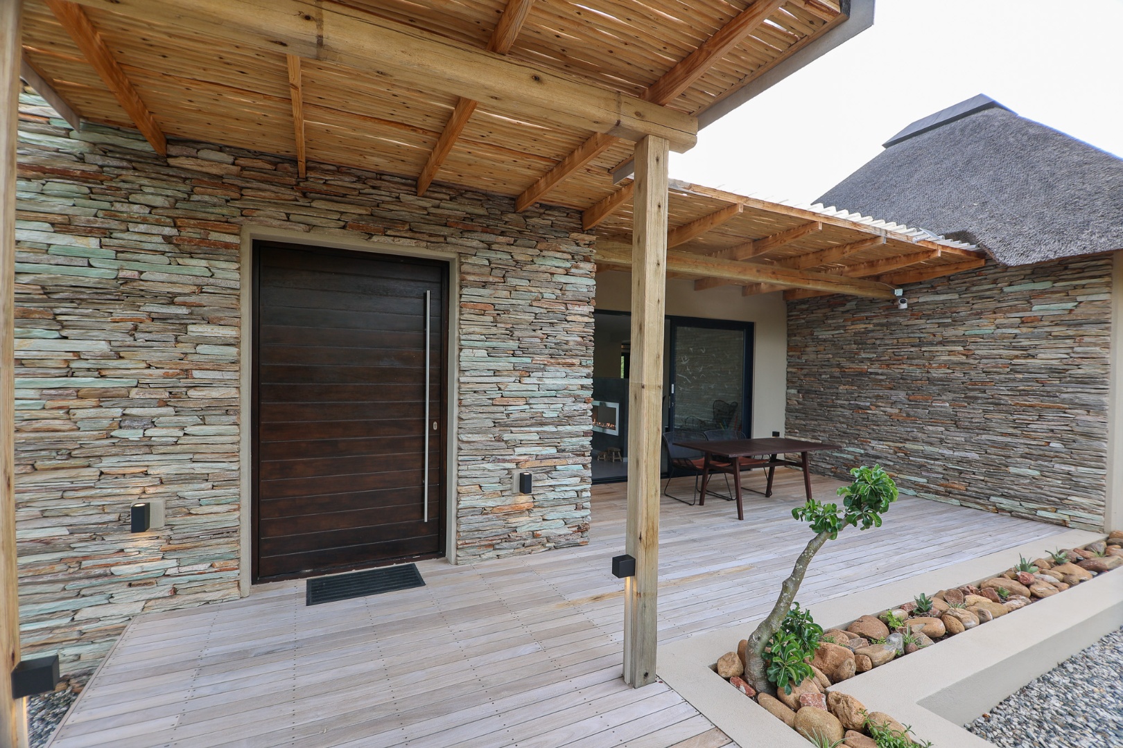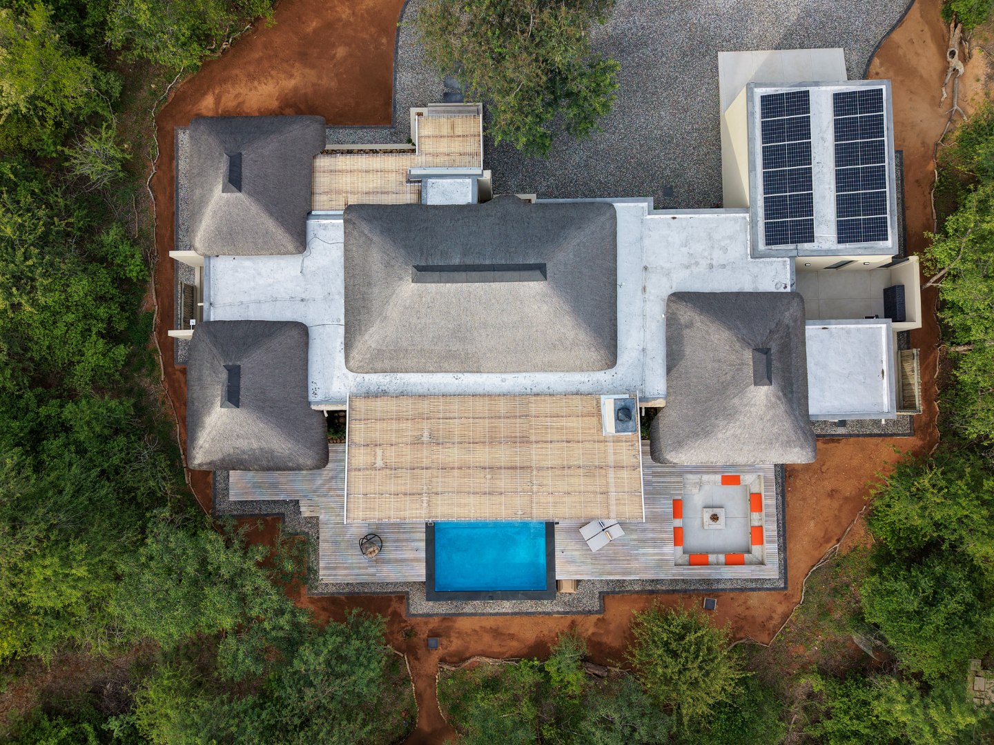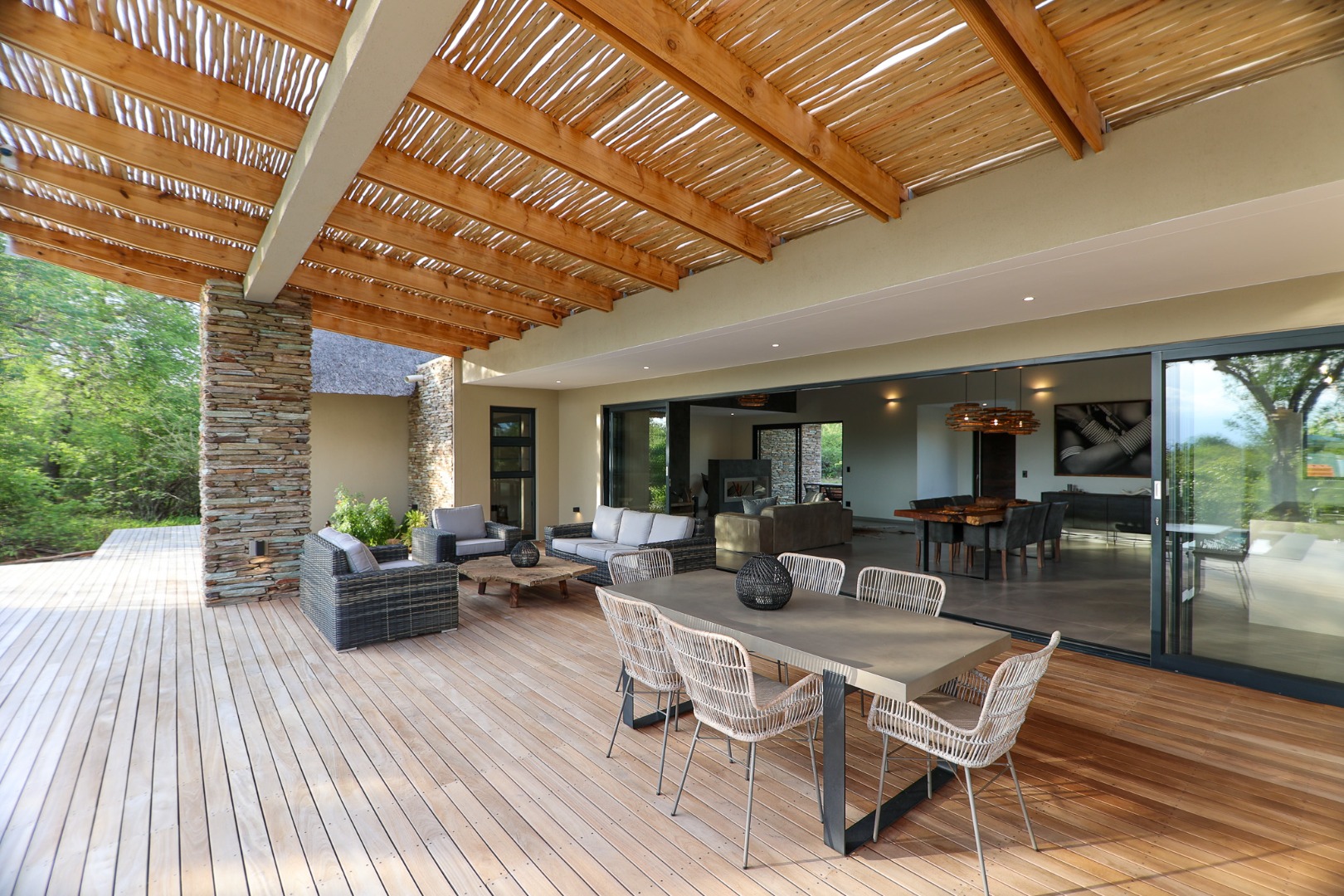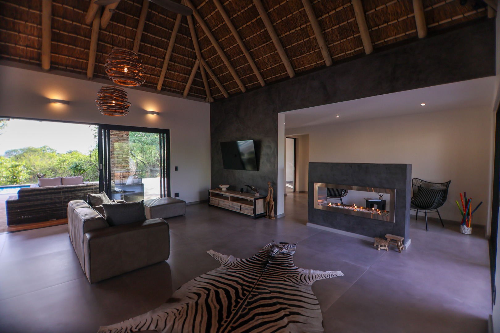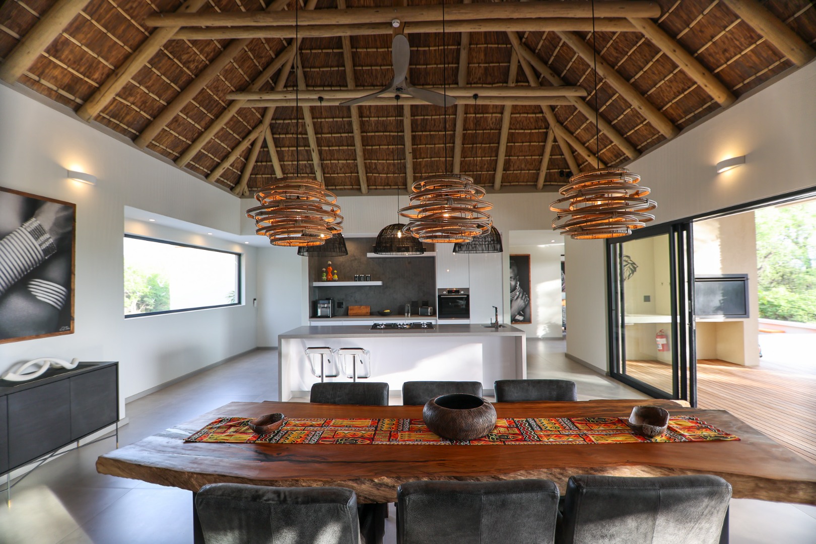 The Home is Sold Fully Furnished. This exceptional 3-bedroom residence, nestled within the prestigious Zandspruit Bush & Aero Estate, offers a harmonious blend of modern design and natural bushveld aesthetics. Characterised by striking thatched roofs, stone pillars, and extensive wood, the property exudes sophisticated safari-style charm, creating an inviting kerb appeal.