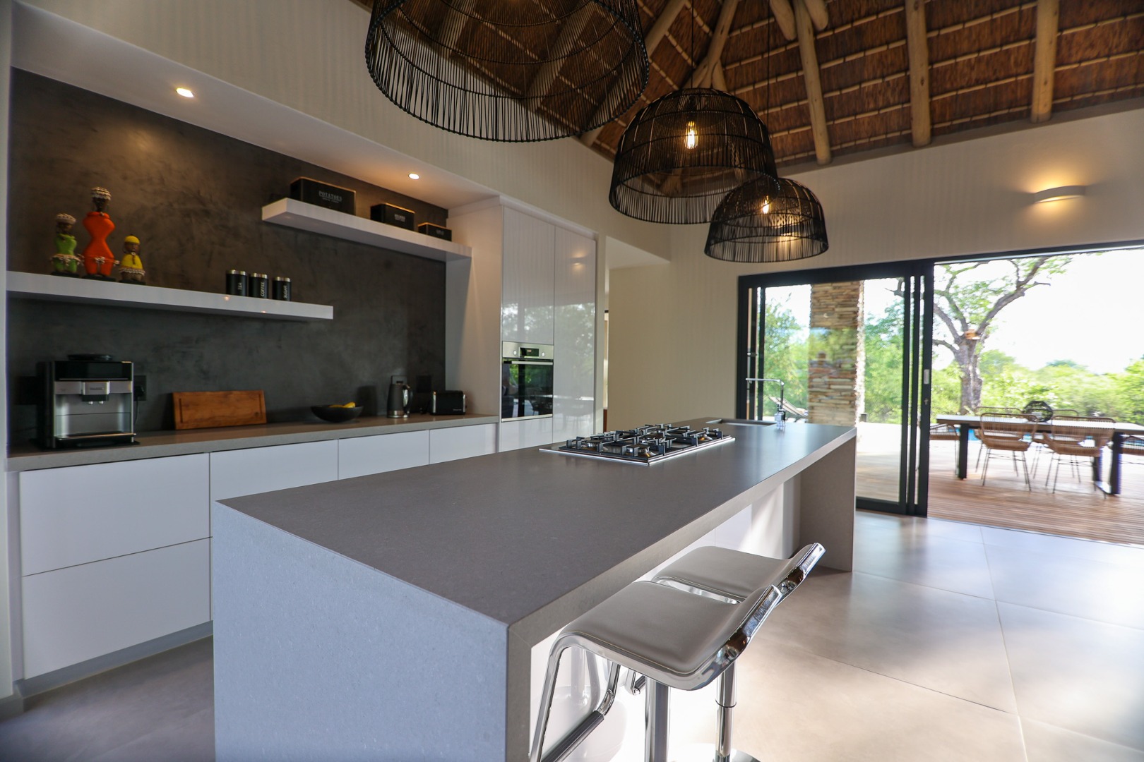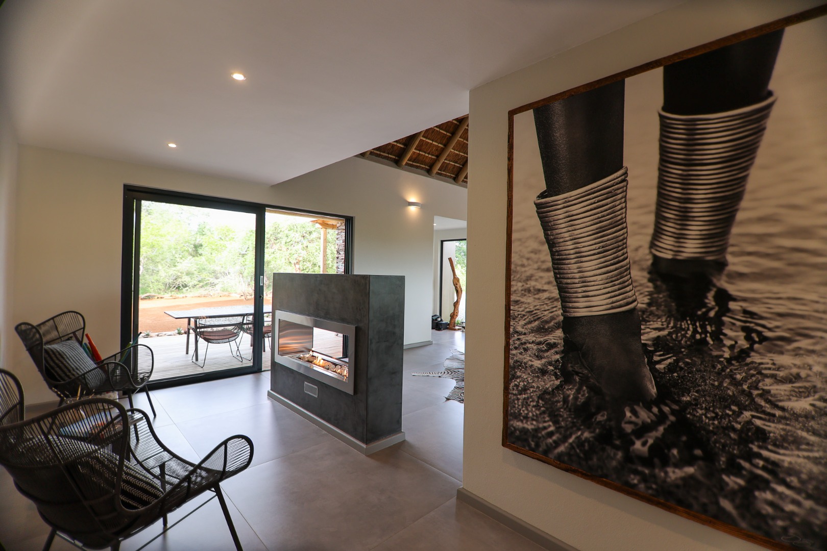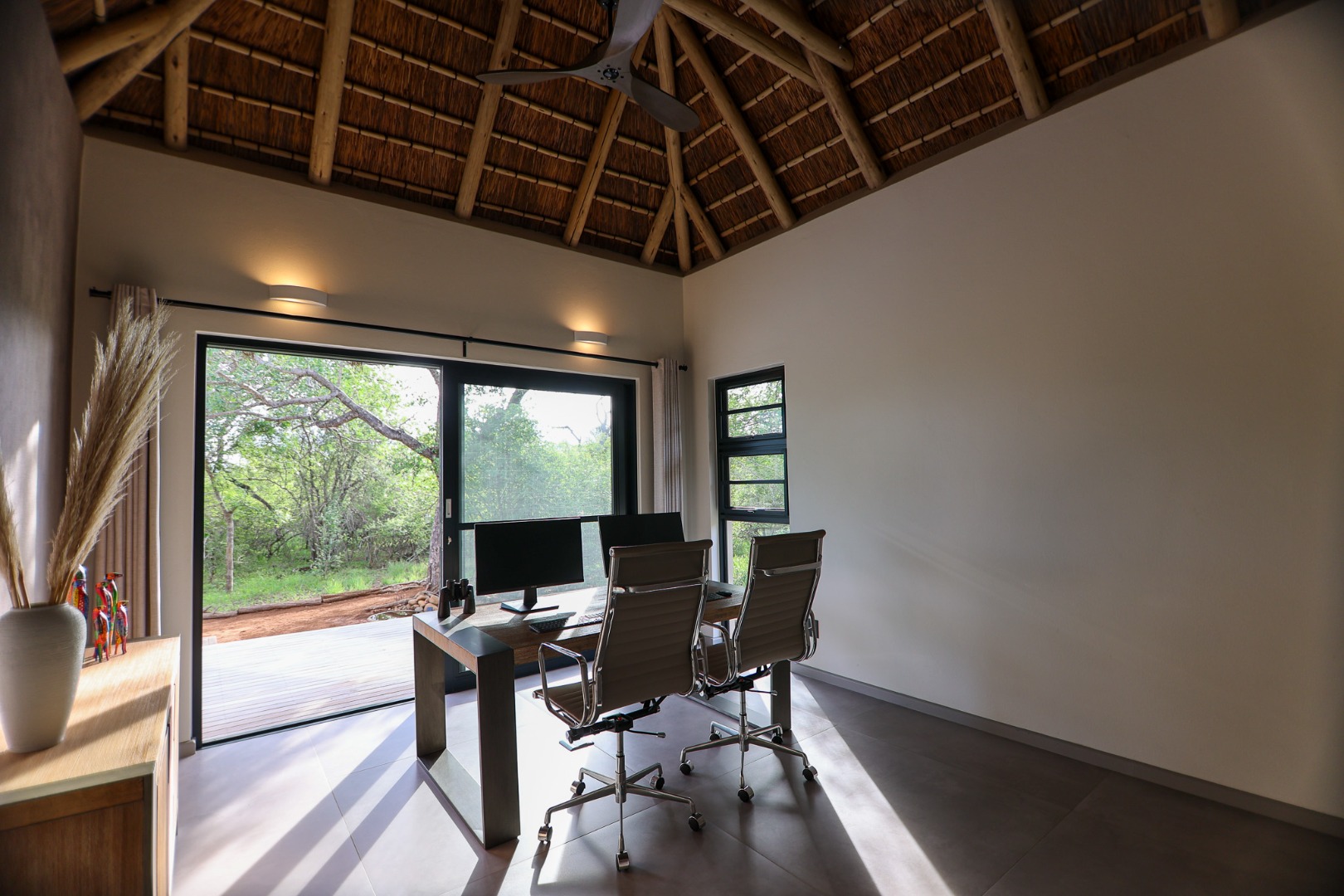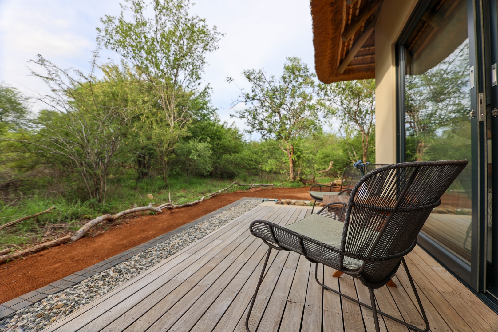 The Home is Sold Fully Furnished. This exceptional 3-bedroom residence, nestled within the prestigious Zandspruit Bush & Aero Estate, offers a harmonious blend of modern design and natural bushveld aesthetics. Characterised by striking thatched roofs, stone pillars, and extensive wood, the property exudes sophisticated safari-style charm, creating an inviting kerb appeal.