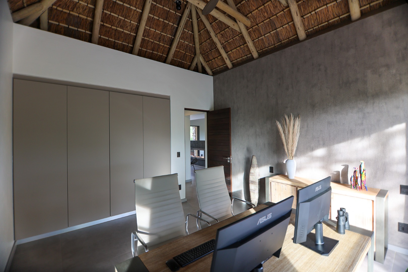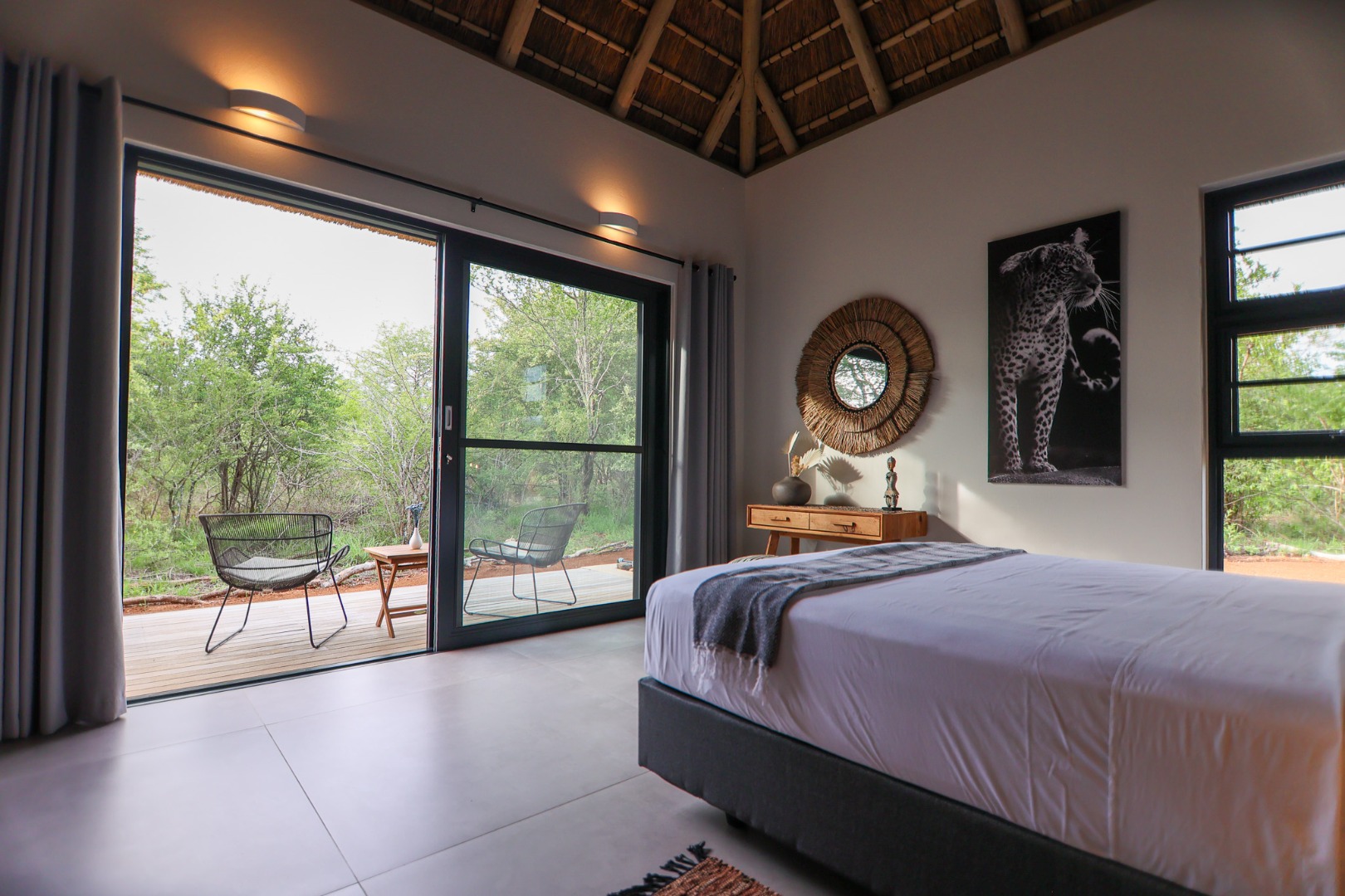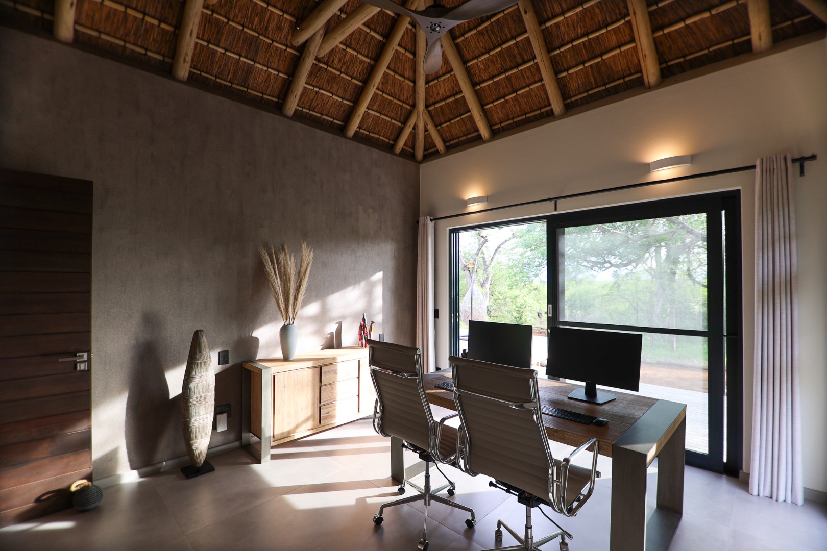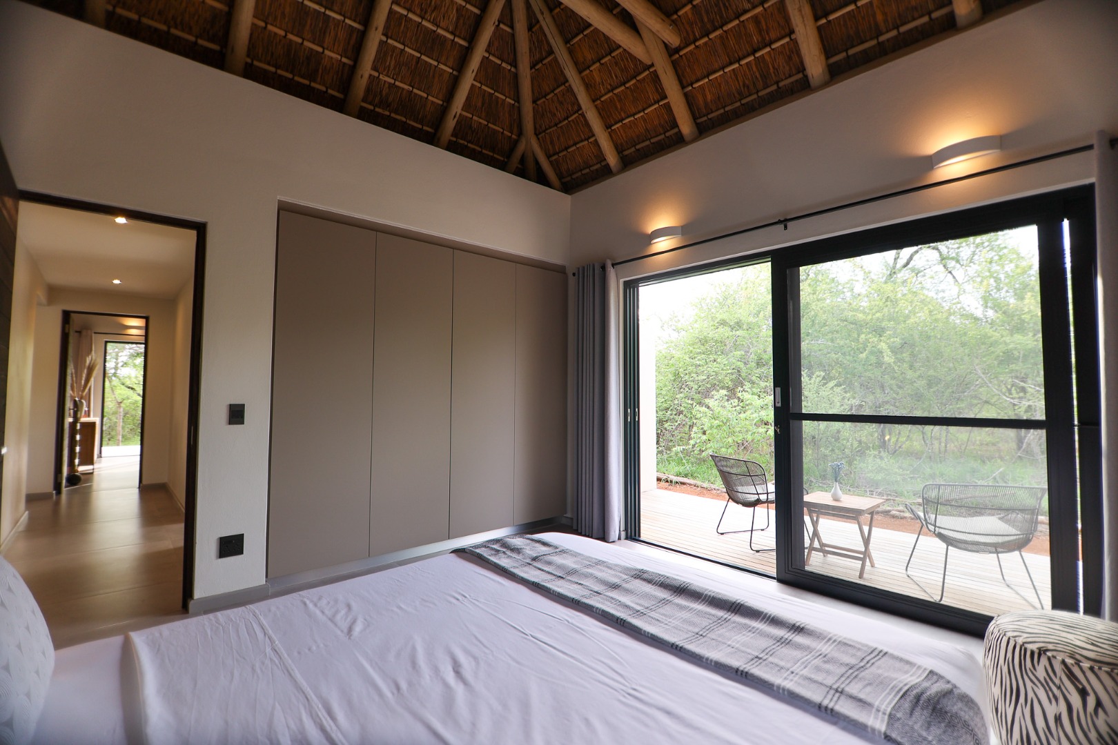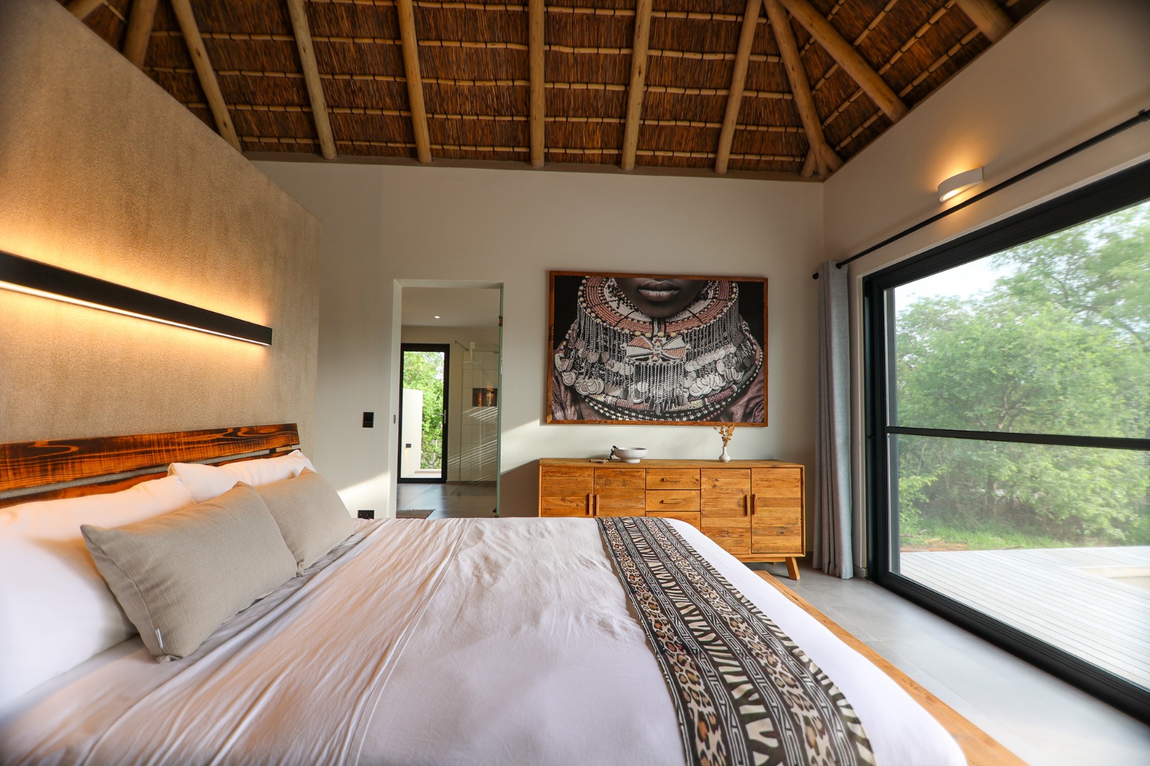 The Home is Sold Fully Furnished. This exceptional 3-bedroom residence, nestled within the prestigious Zandspruit Bush & Aero Estate, offers a harmonious blend of modern design and natural bushveld aesthetics. Characterised by striking thatched roofs, stone pillars, and extensive wood, the property exudes sophisticated safari-style charm, creating an inviting kerb appeal.