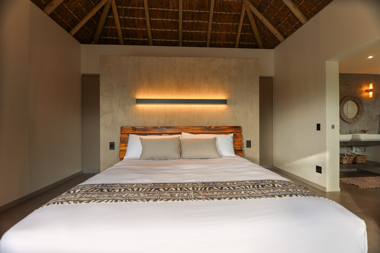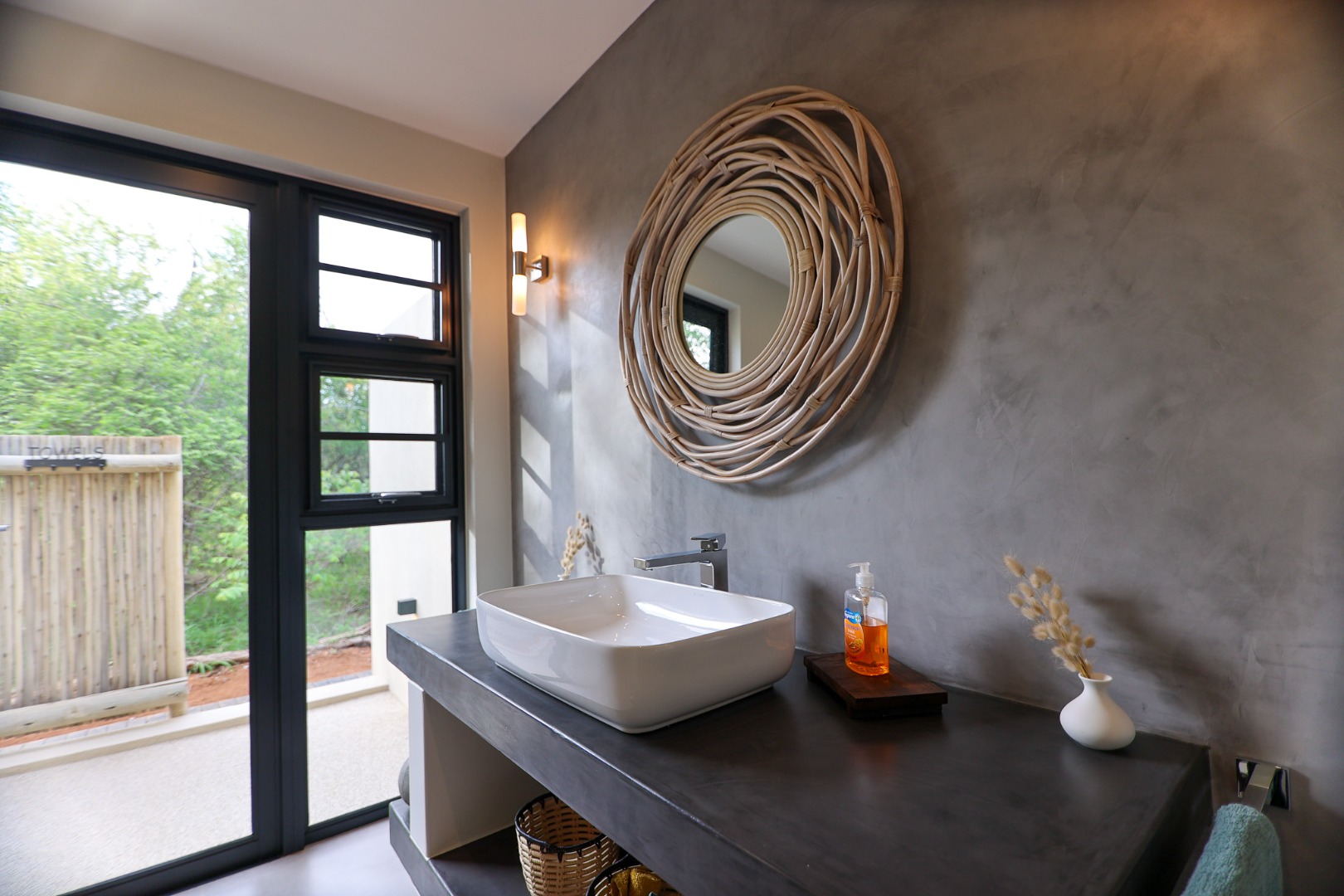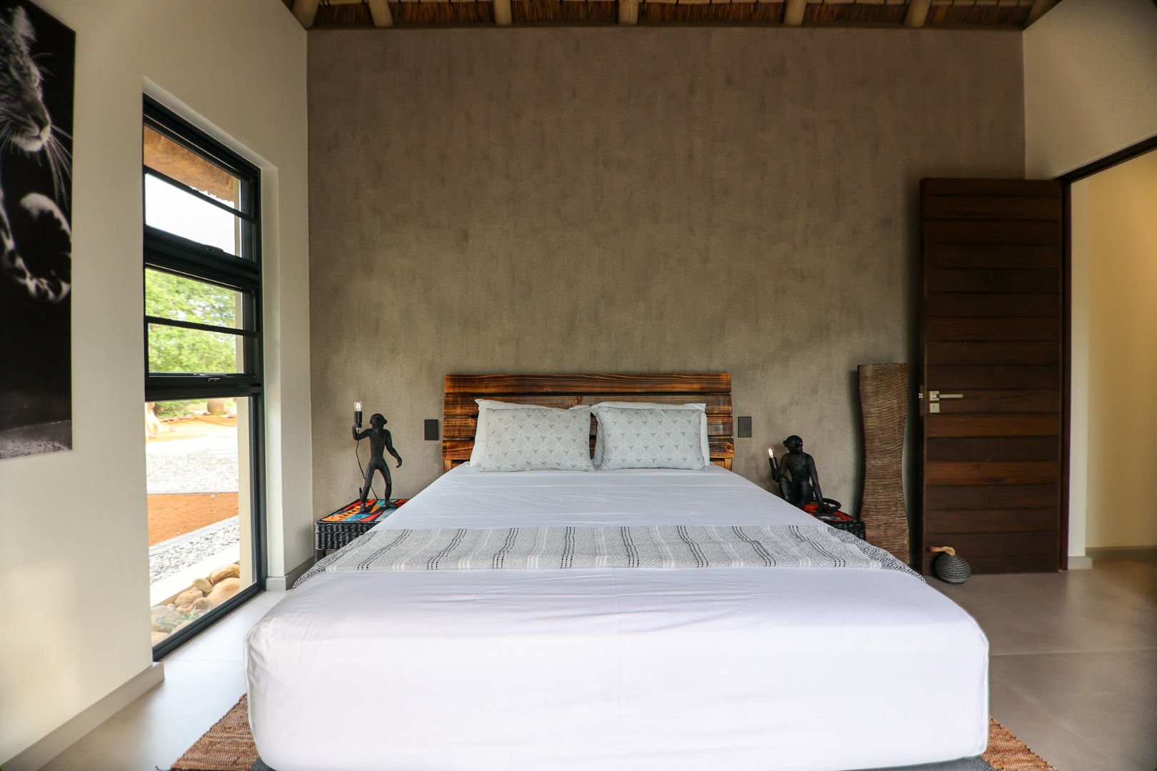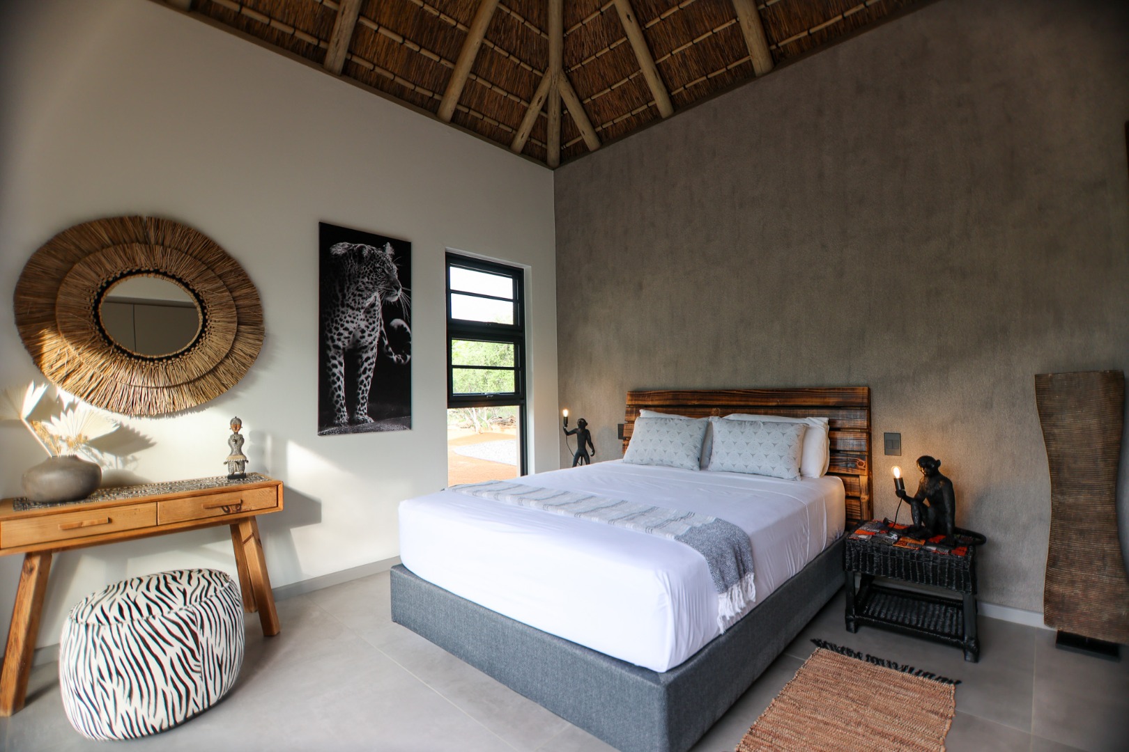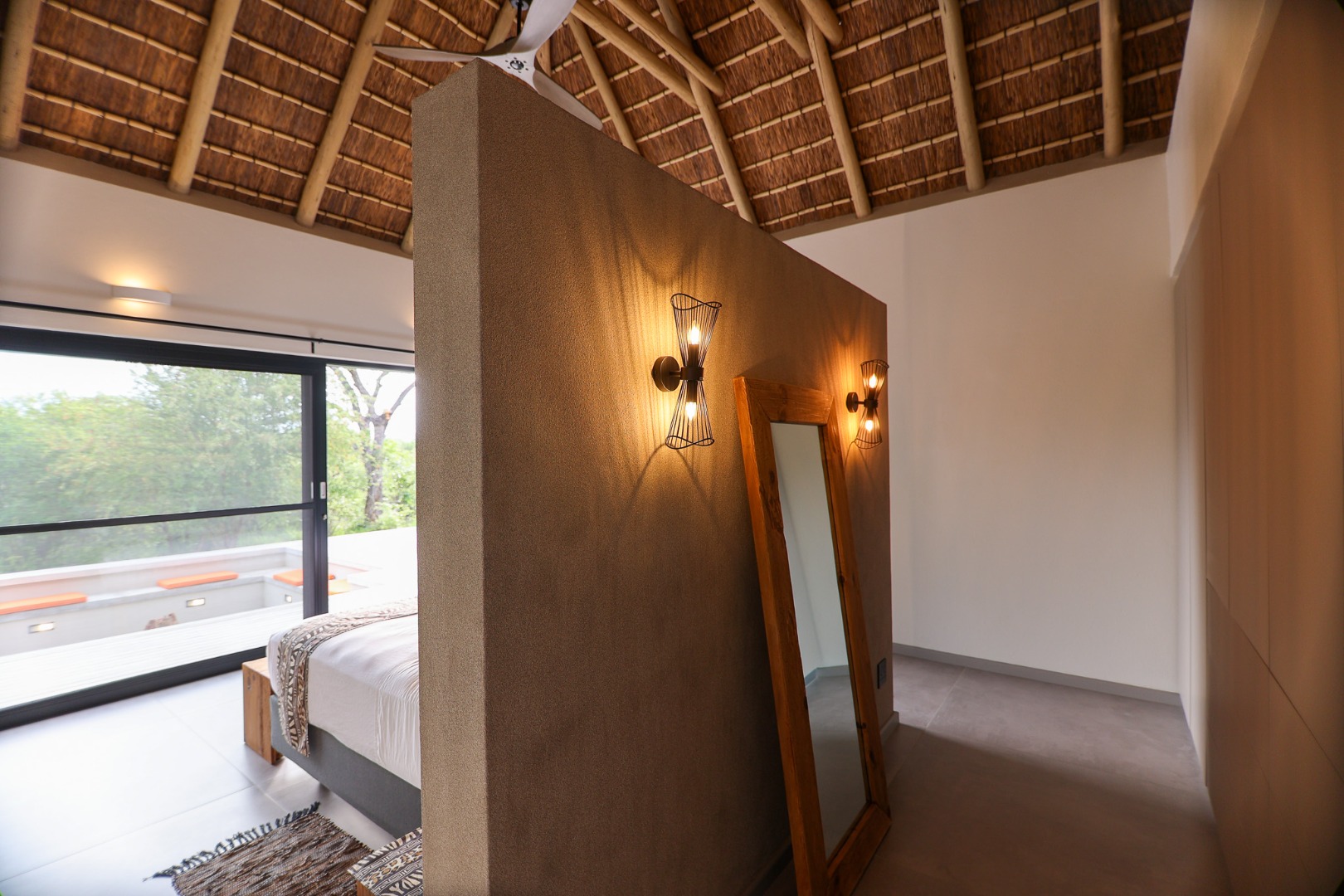 The Home is Sold Fully Furnished. This exceptional 3-bedroom residence, nestled within the prestigious Zandspruit Bush & Aero Estate, offers a harmonious blend of modern design and natural bushveld aesthetics. Characterised by striking thatched roofs, stone pillars, and extensive wood, the property exudes sophisticated safari-style charm, creating an inviting kerb appeal.