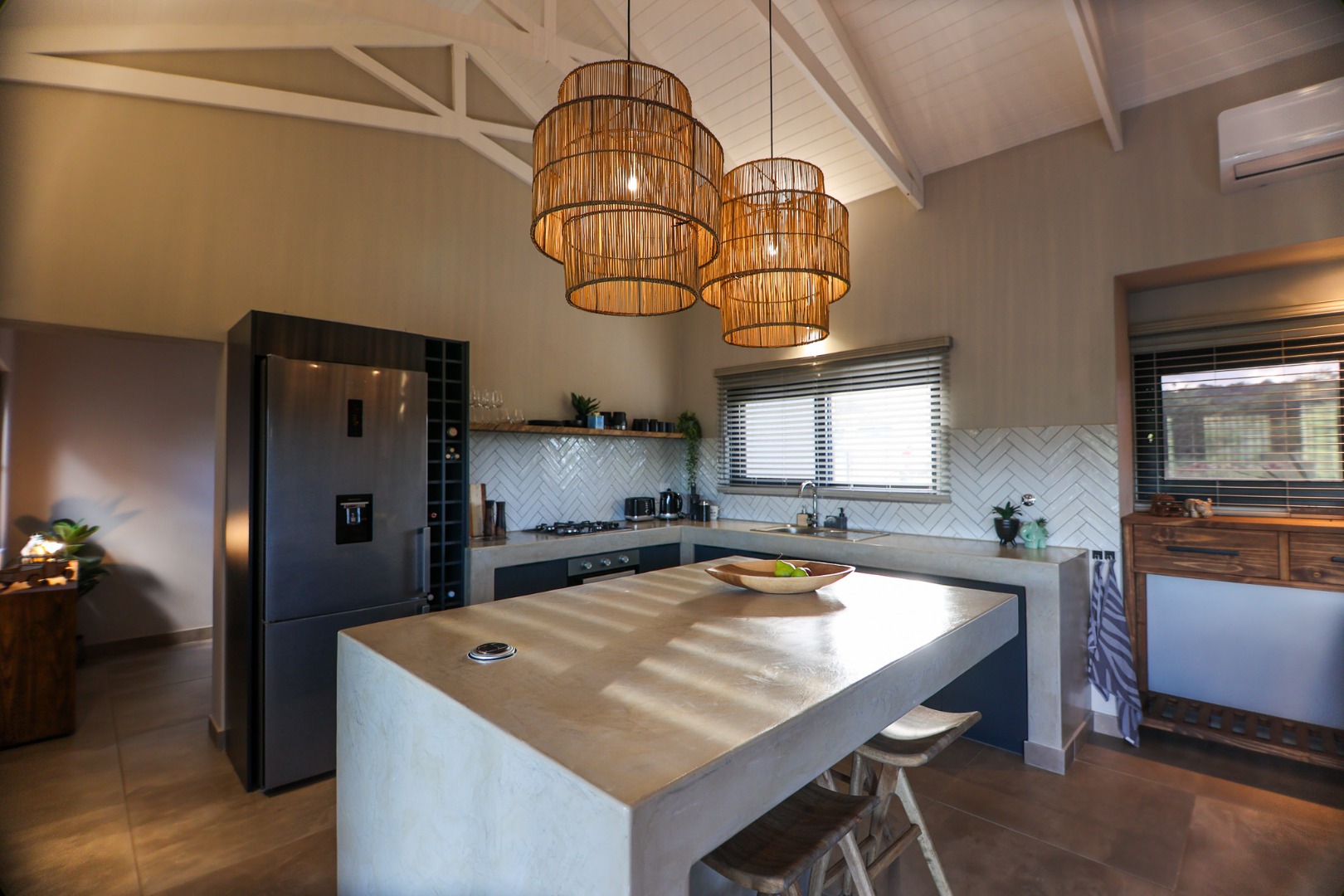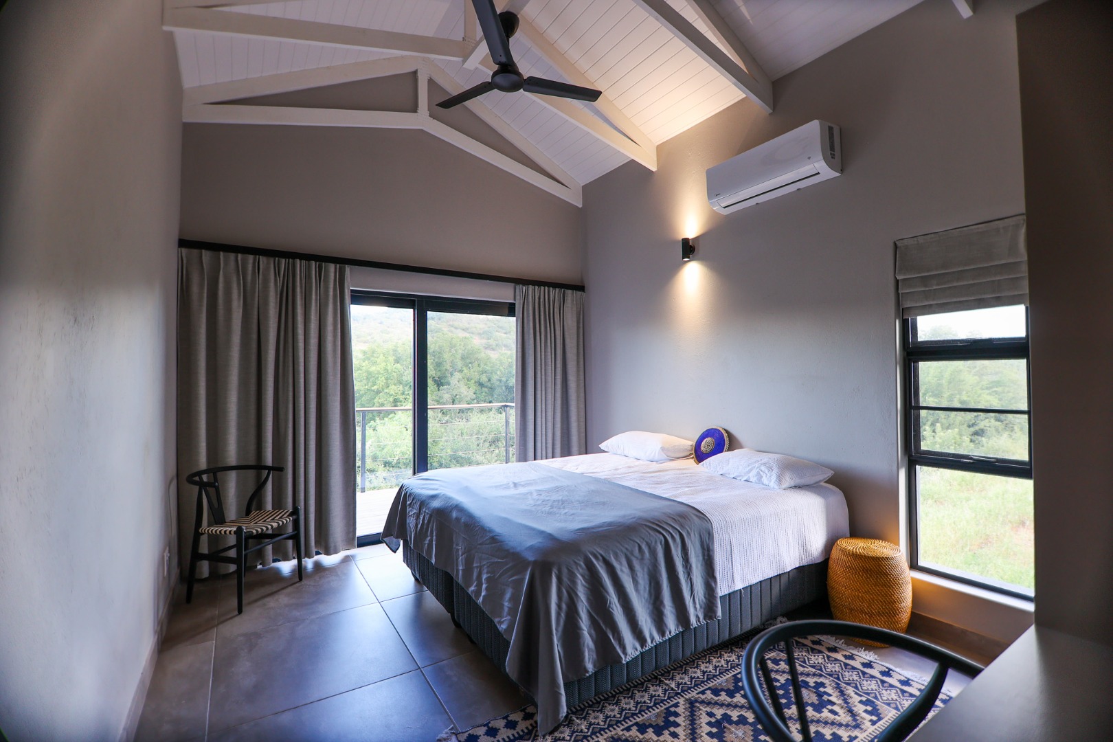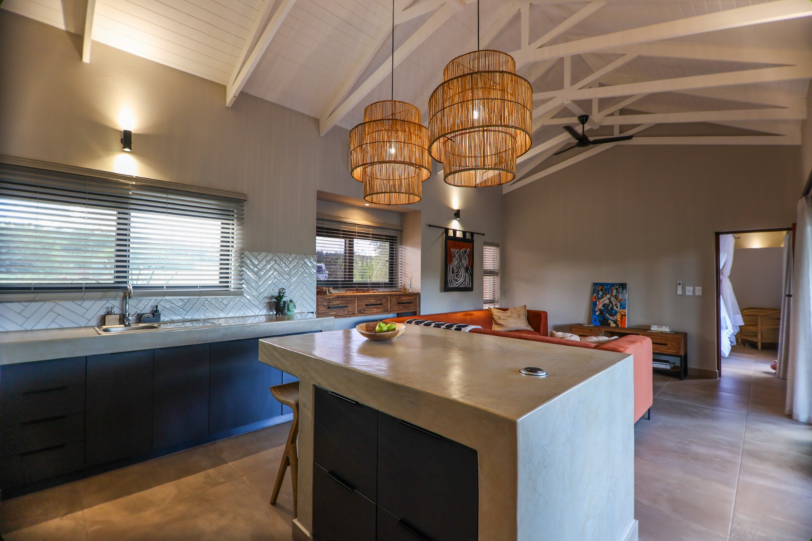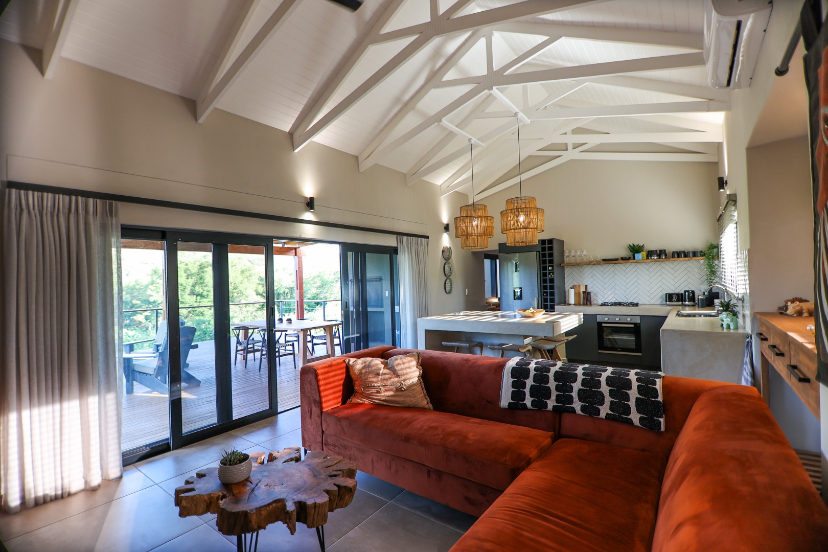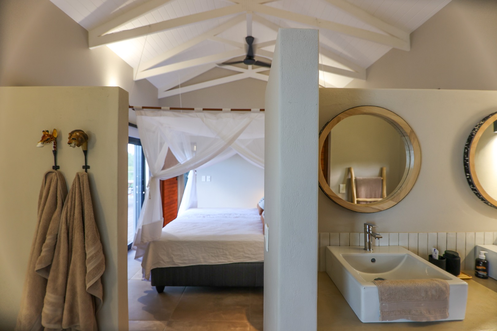 boasts an en-suite bathroom with a luxurious outdoor shower and double basin, while the two guest bedrooms share a well-appointed bathroom.