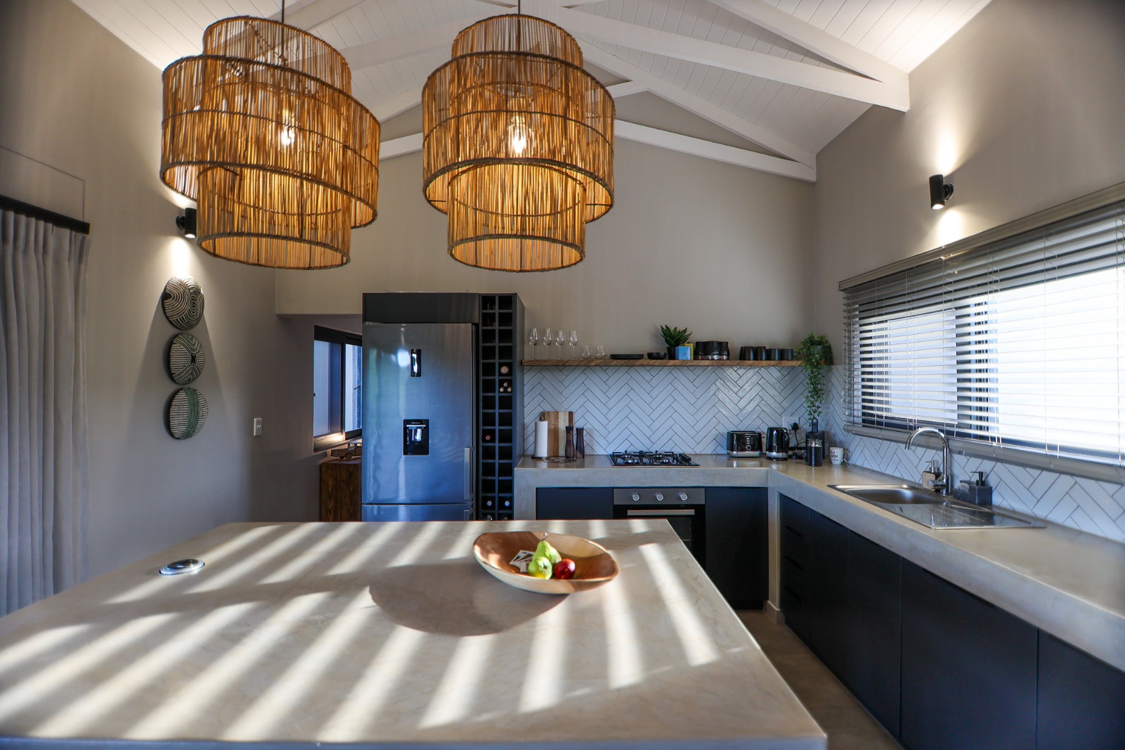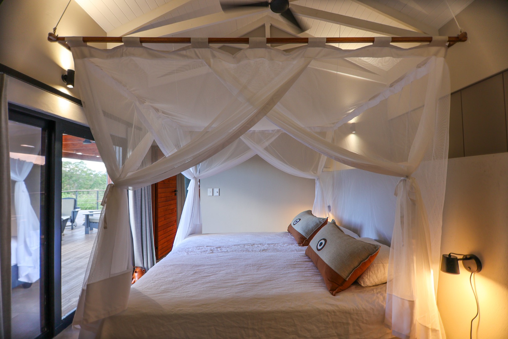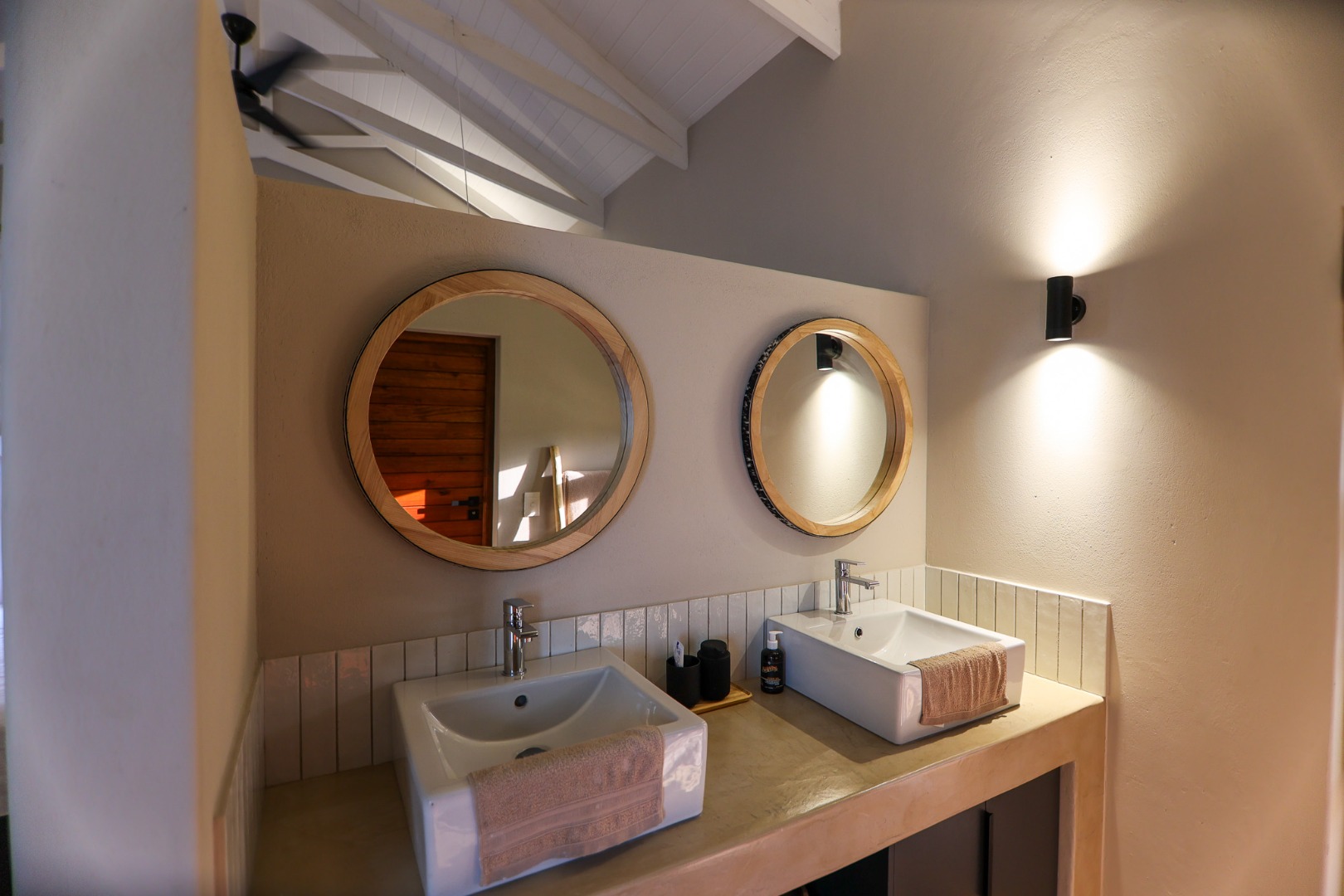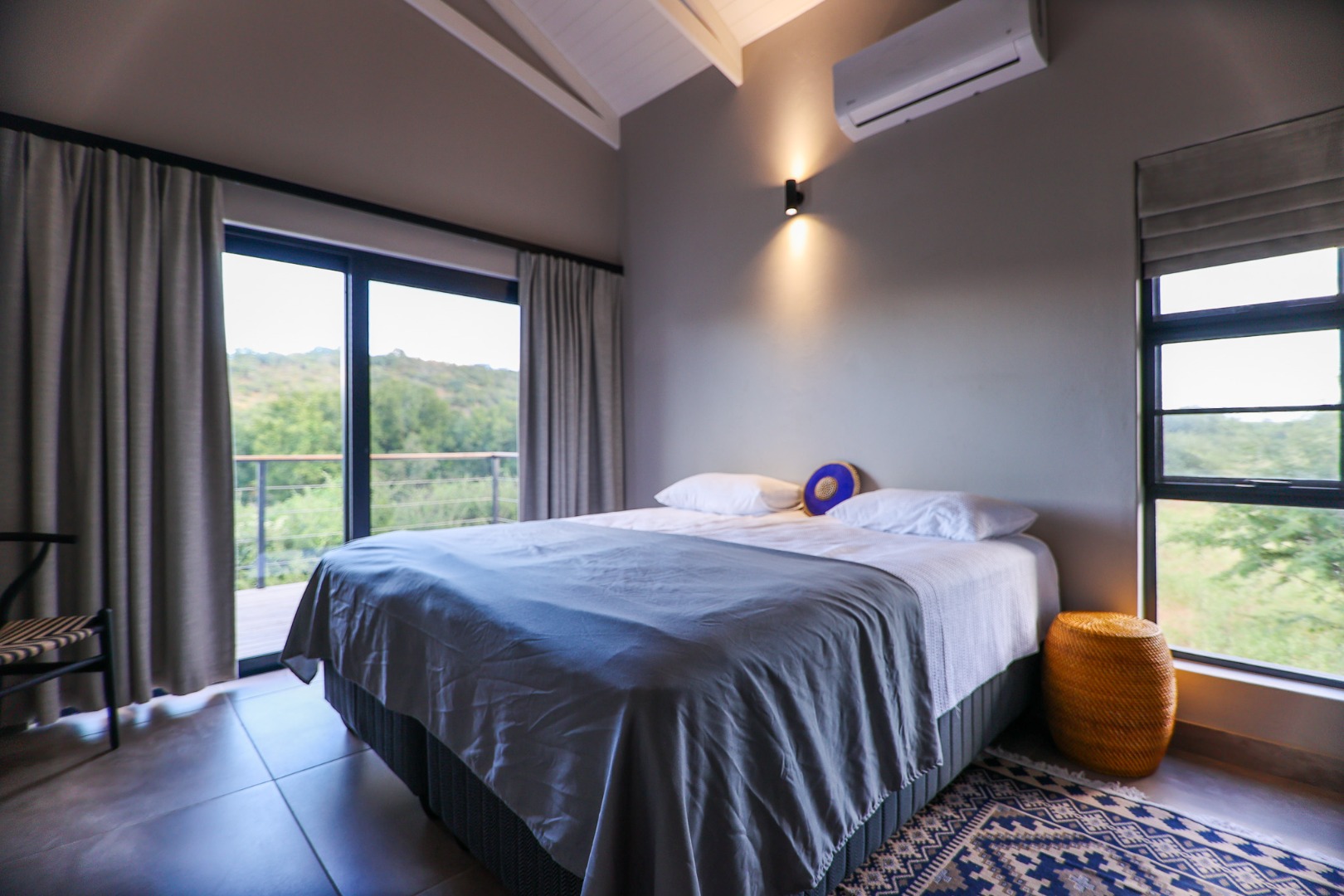 boasts an en-suite bathroom with a luxurious outdoor shower and double basin, while the two guest bedrooms share a well-appointed bathroom.