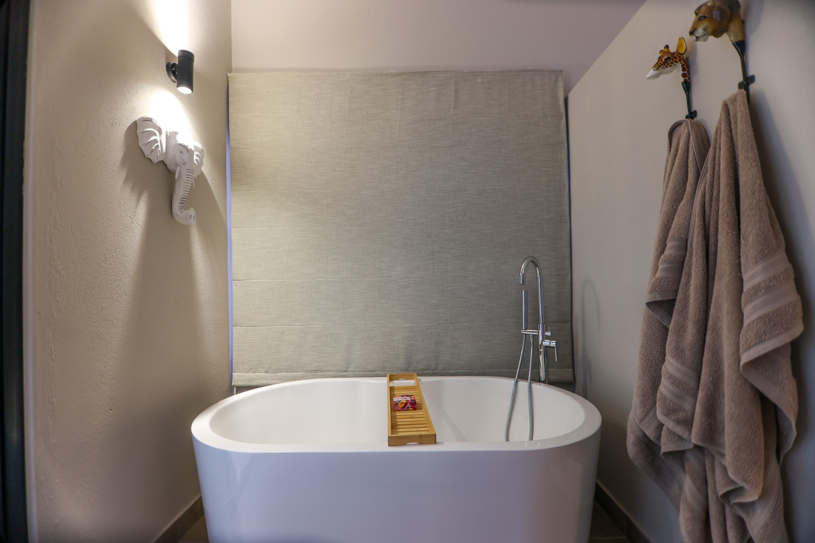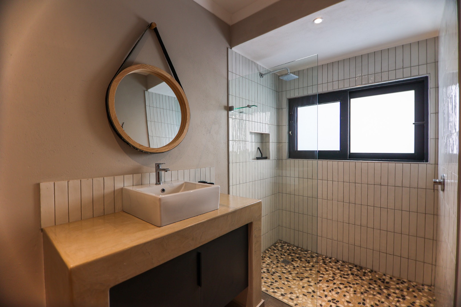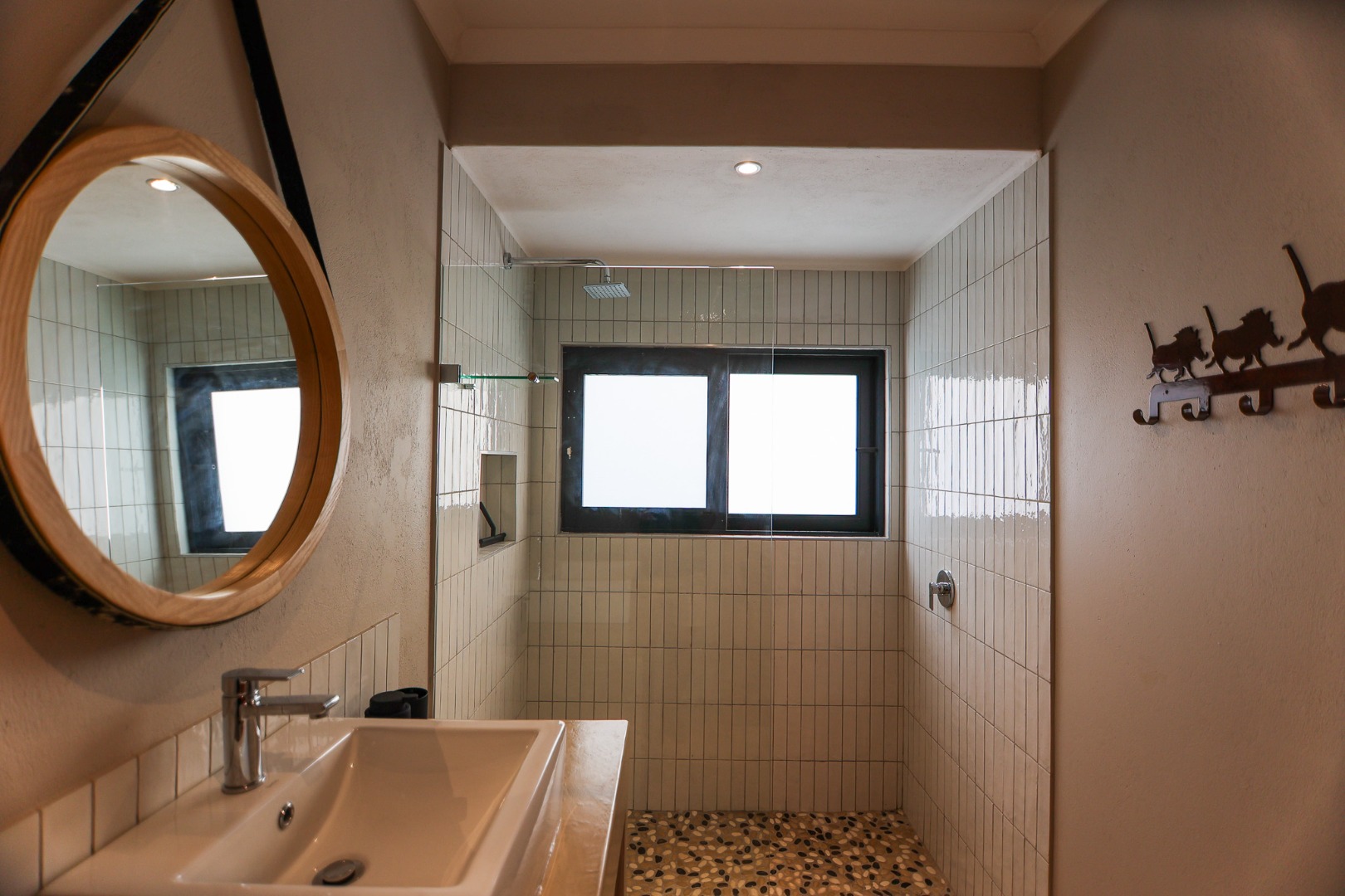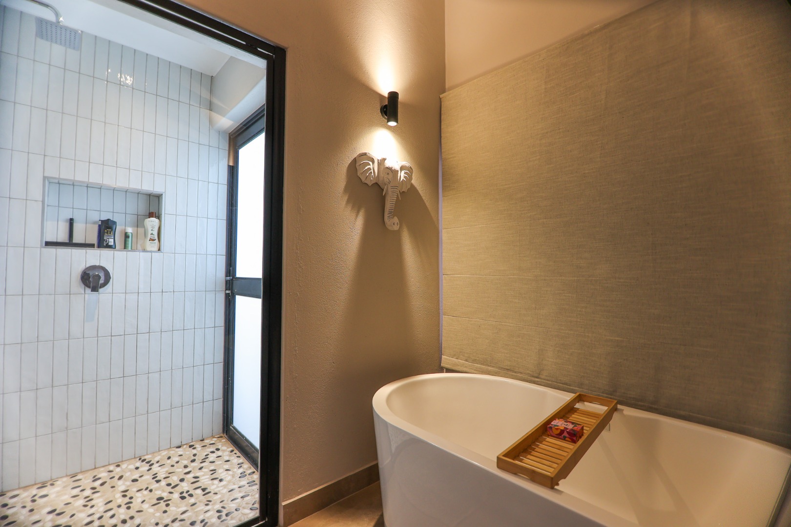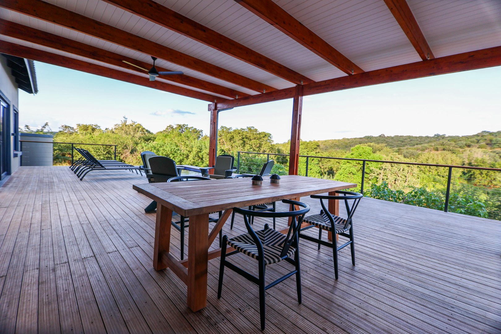 boasts an en-suite bathroom with a luxurious outdoor shower and double basin, while the two guest bedrooms share a well-appointed bathroom.