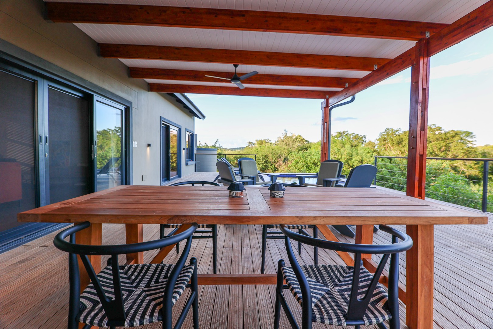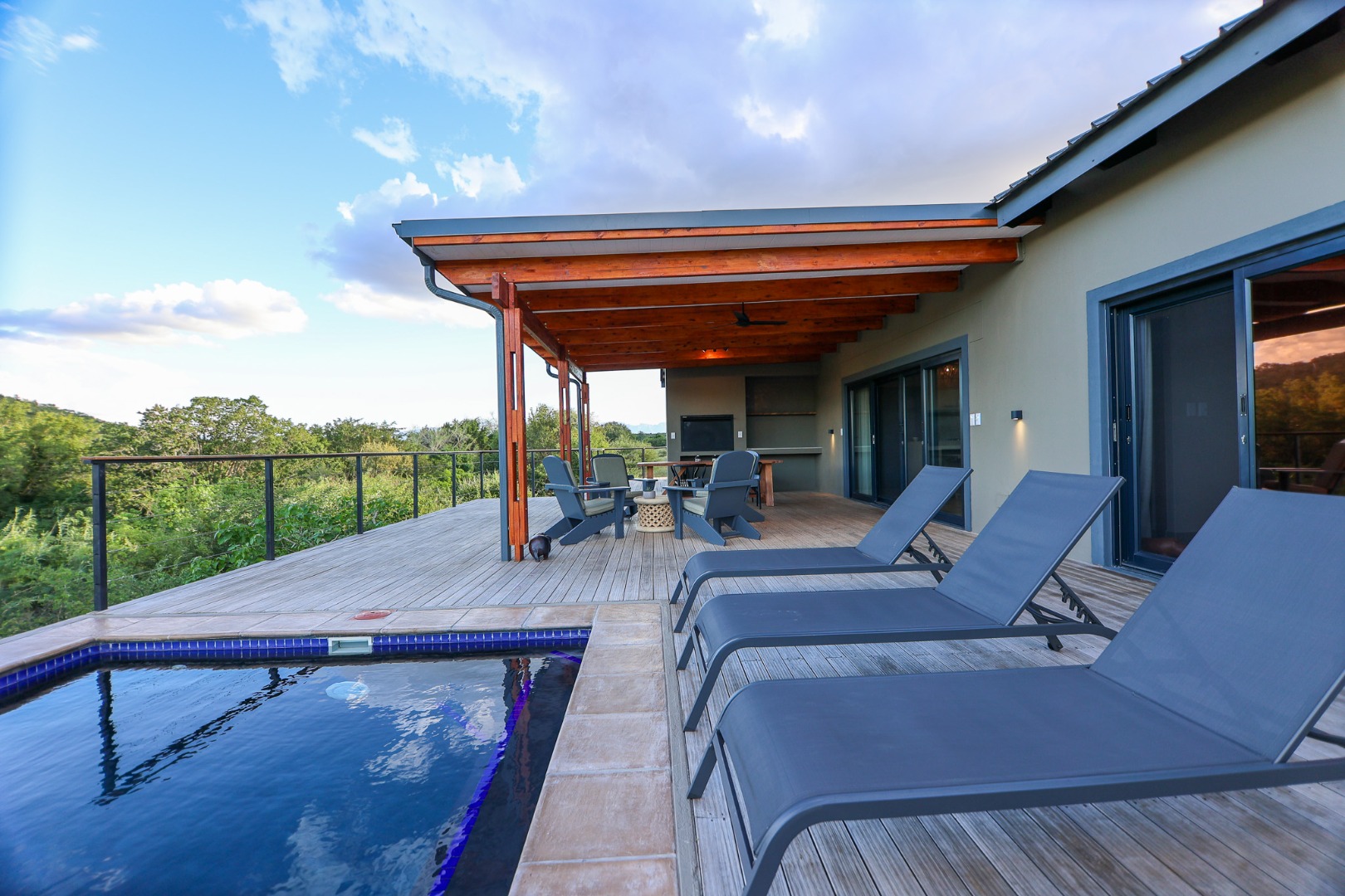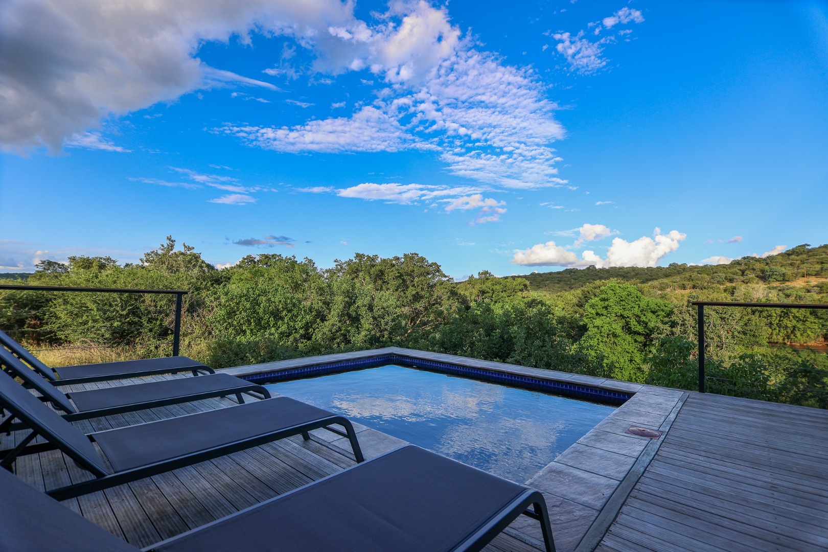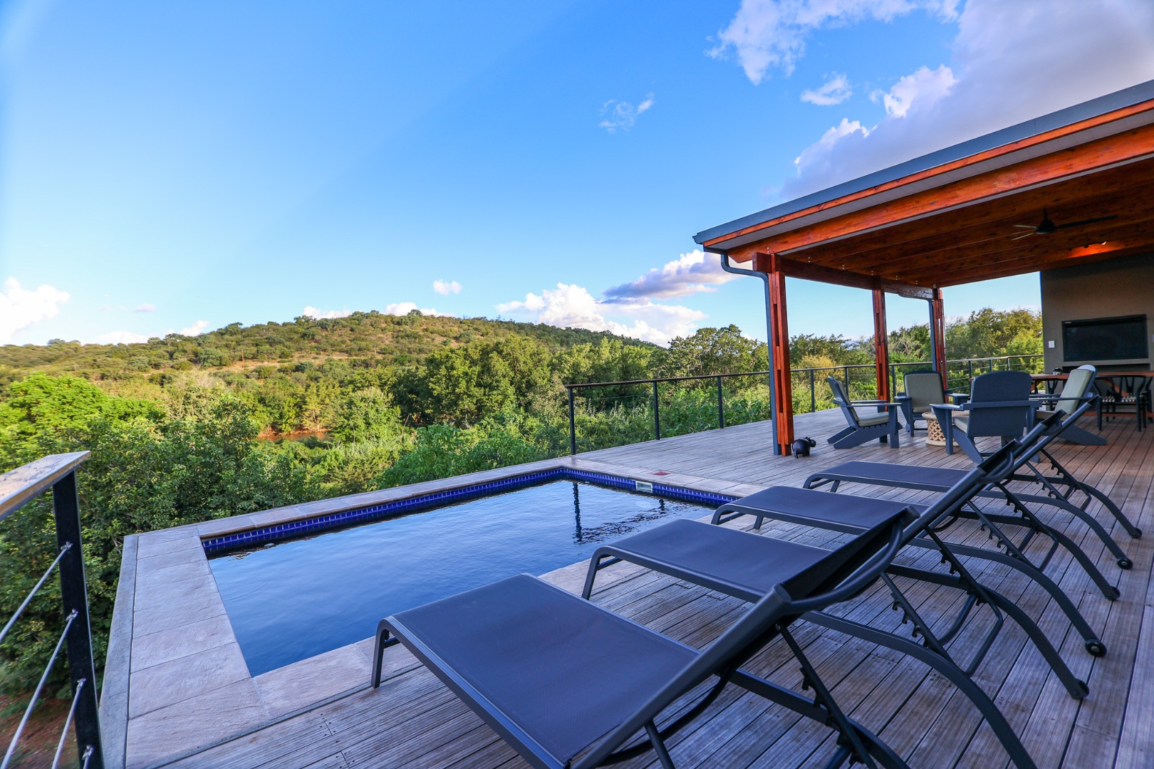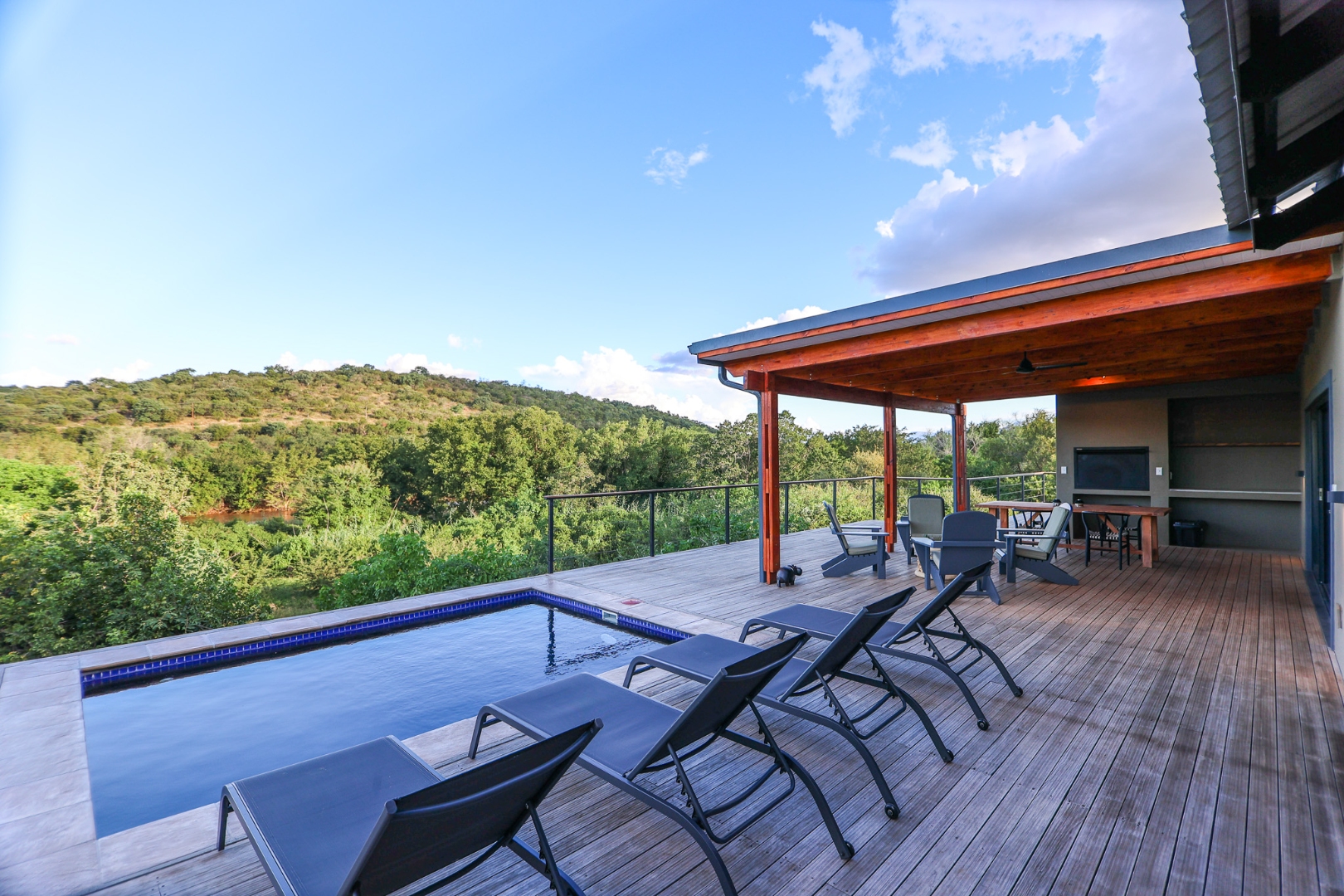 dishwasher, while the living room offers air conditioning for those warm Lowveld days. Large doors open onto a covered patio, where a built-in braai and private pool provide the perfect setting to take in the stunning river views.