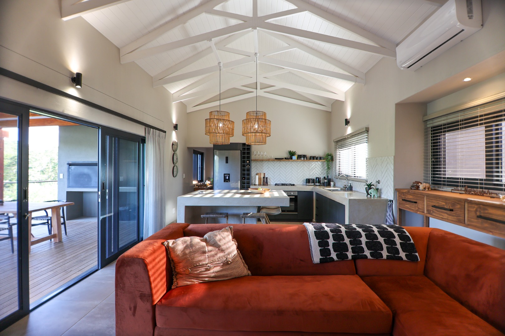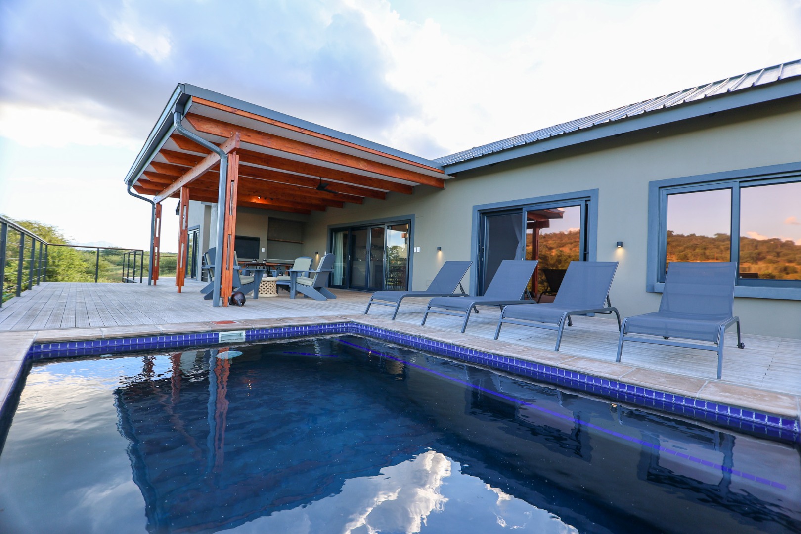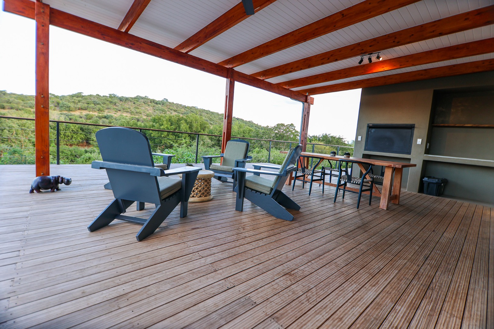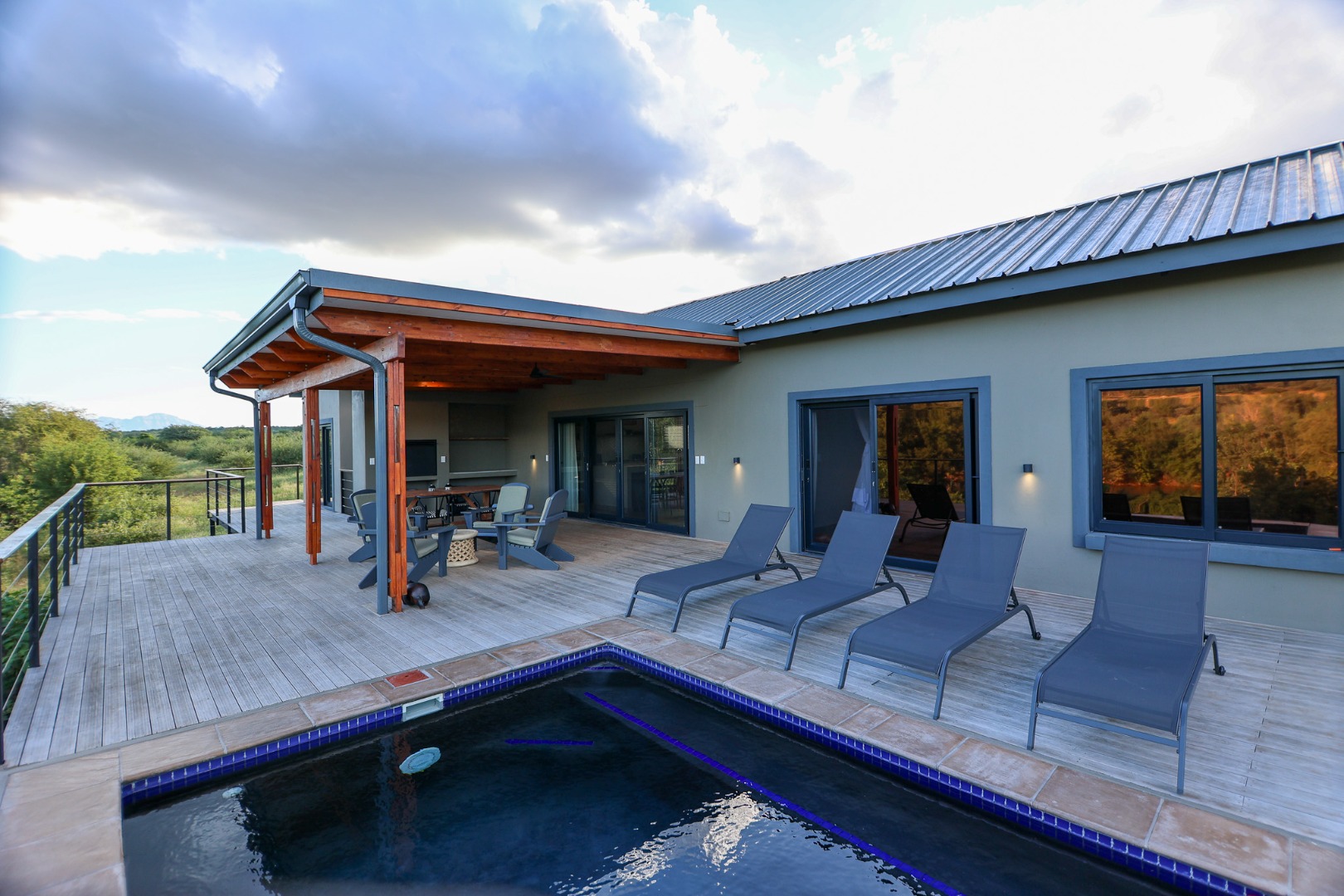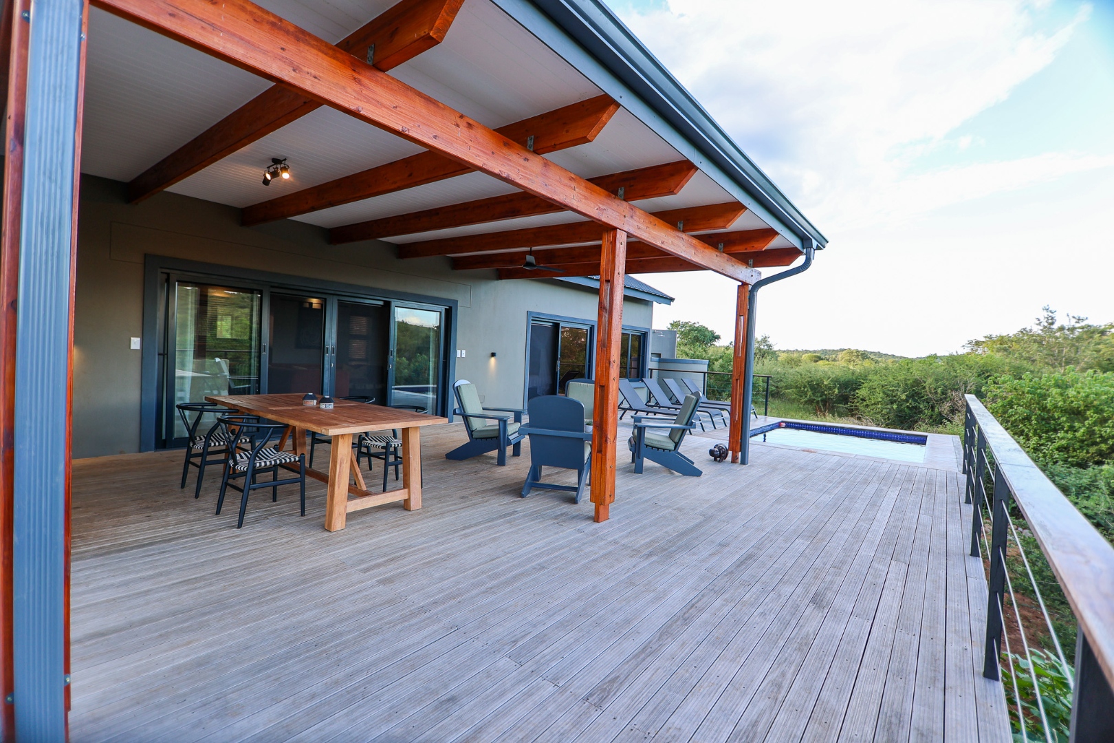 dishwasher, while the living room offers air conditioning for those warm Lowveld days. Large doors open onto a covered patio, where a built-in braai and private pool provide the perfect setting to take in the stunning river views.
