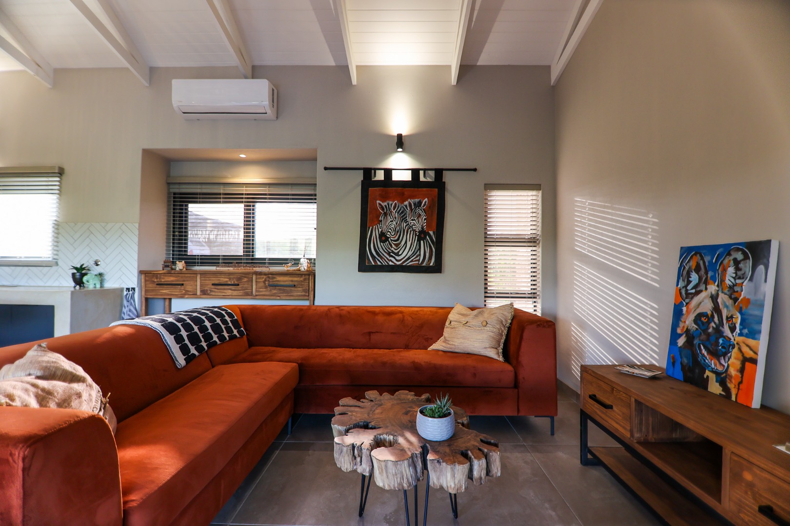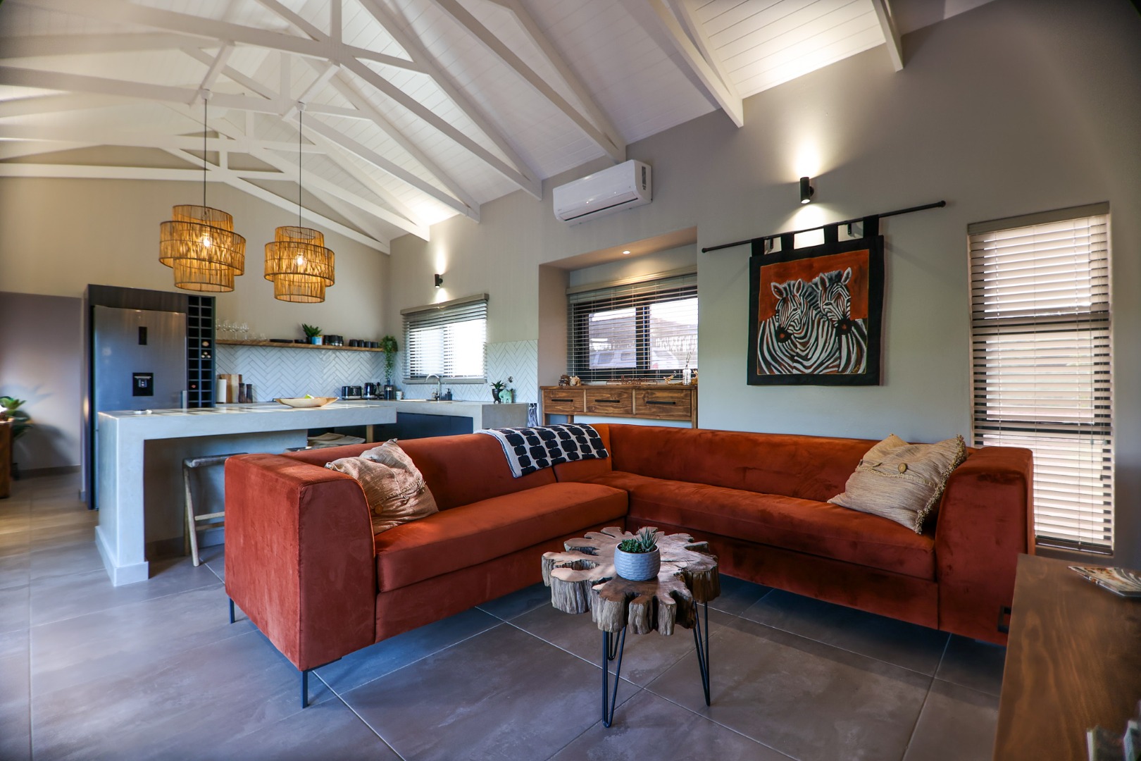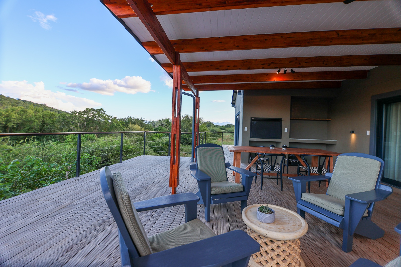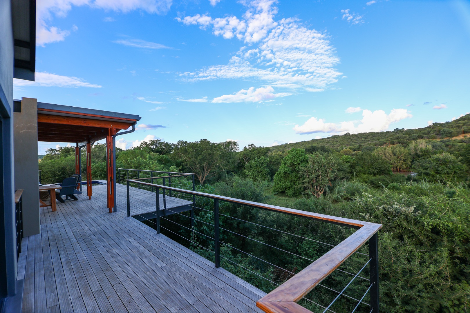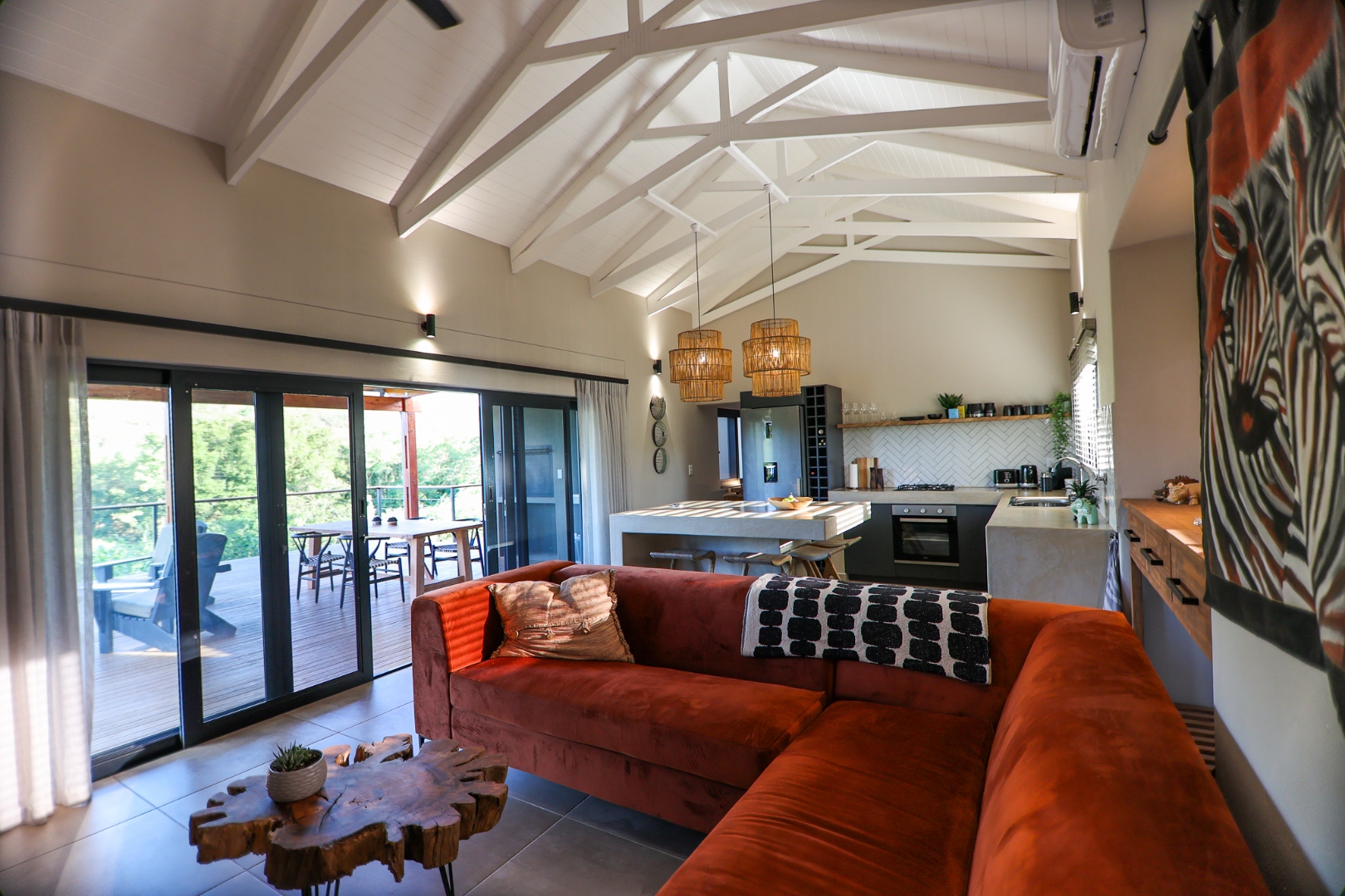 dishwasher, while the living room offers air conditioning for those warm Lowveld days. Large doors open onto a covered patio, where a built-in braai and private pool provide the perfect setting to take in the stunning river views.