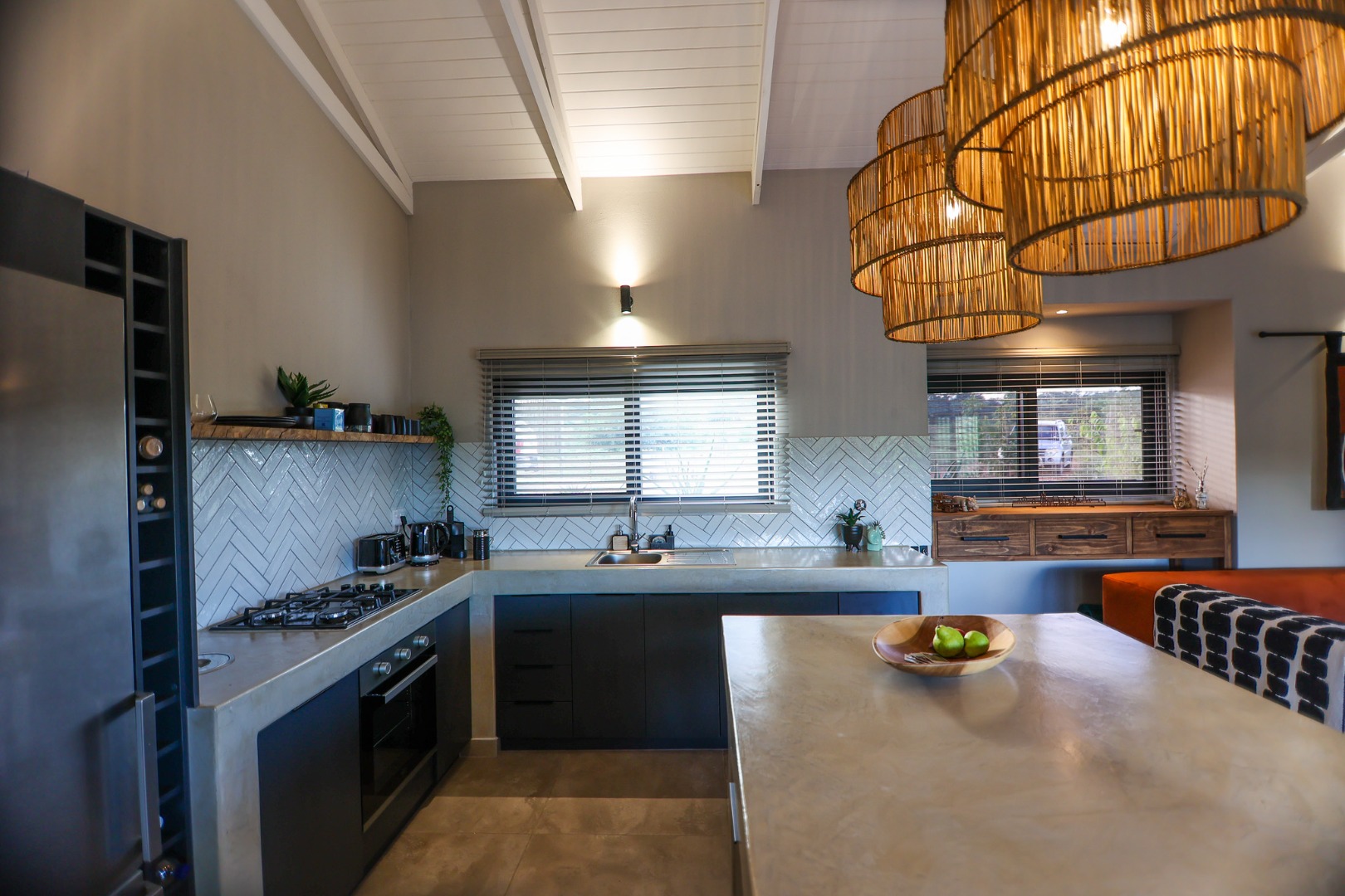 The open-plan kitchen and living area create a welcoming space for entertaining and relaxation. The kitchen is fitted with a gas stove, electric oven, and