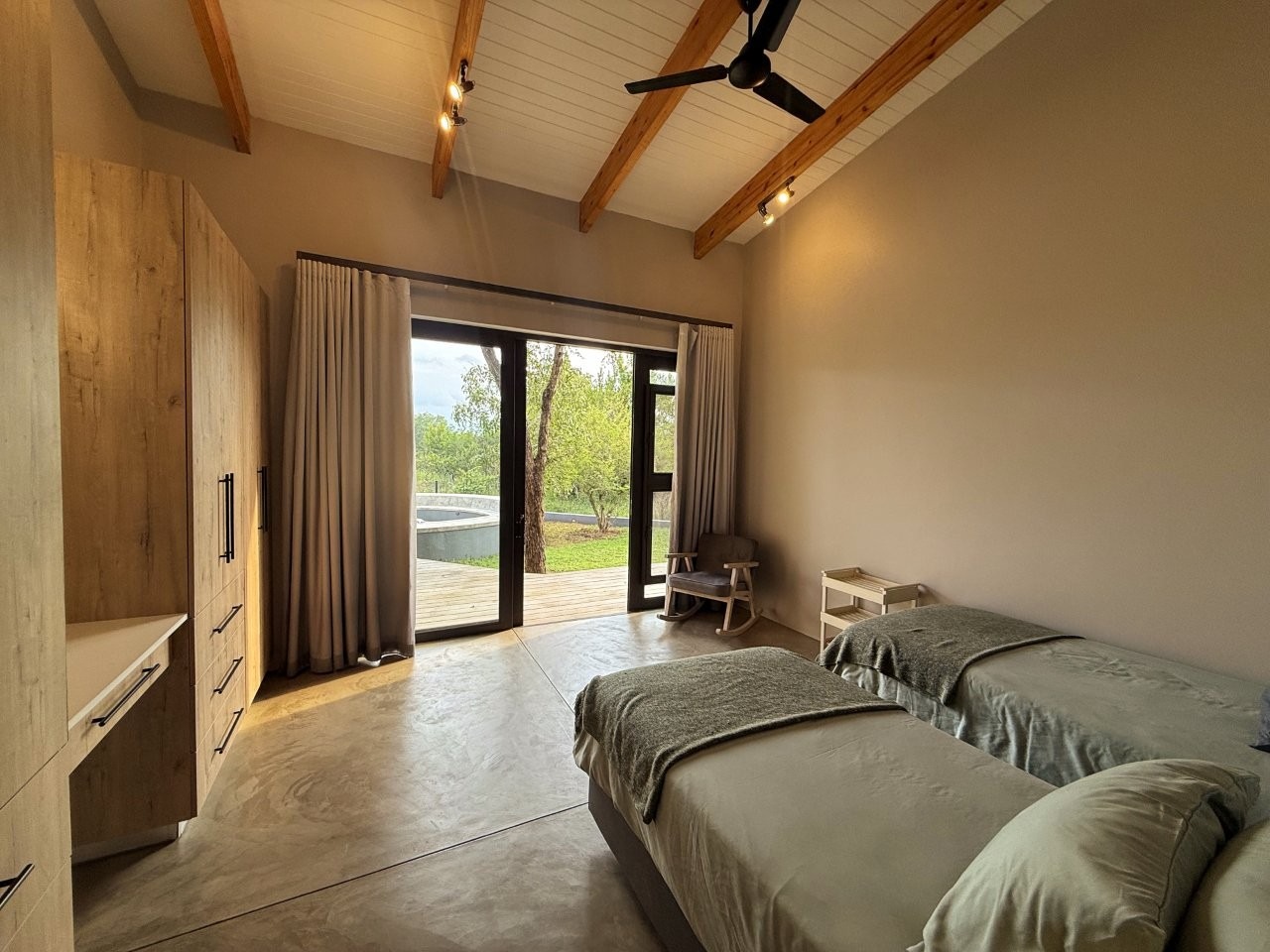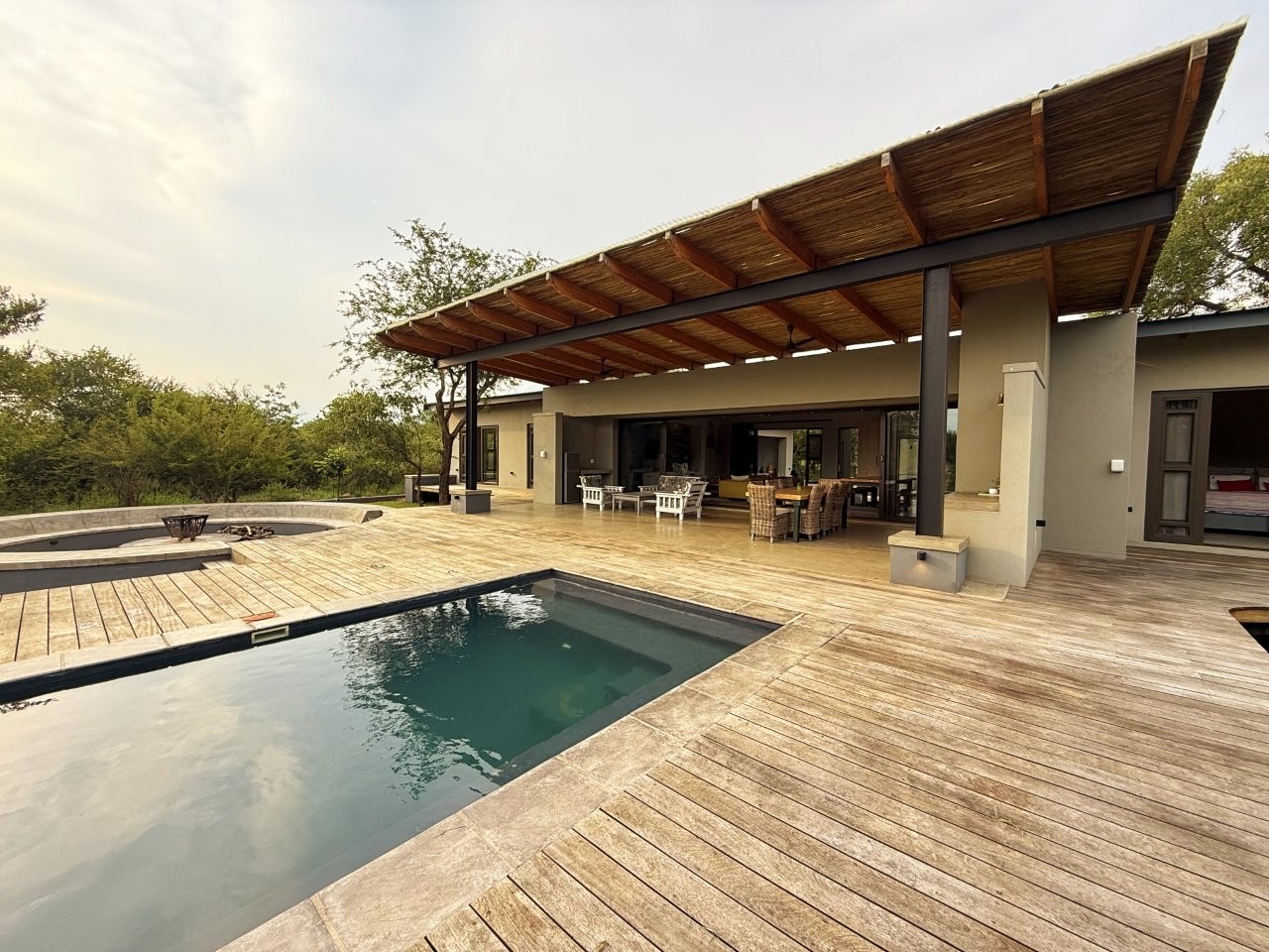 The home features three spacious en-suite bedrooms, all with exposed trusses, including a private master suite with outdoor shower. The open-plan living, dining and kitchen area flows effortlessly onto a covered patio, sun deck and pool, ideal for relaxed bushveld living and entertaining.