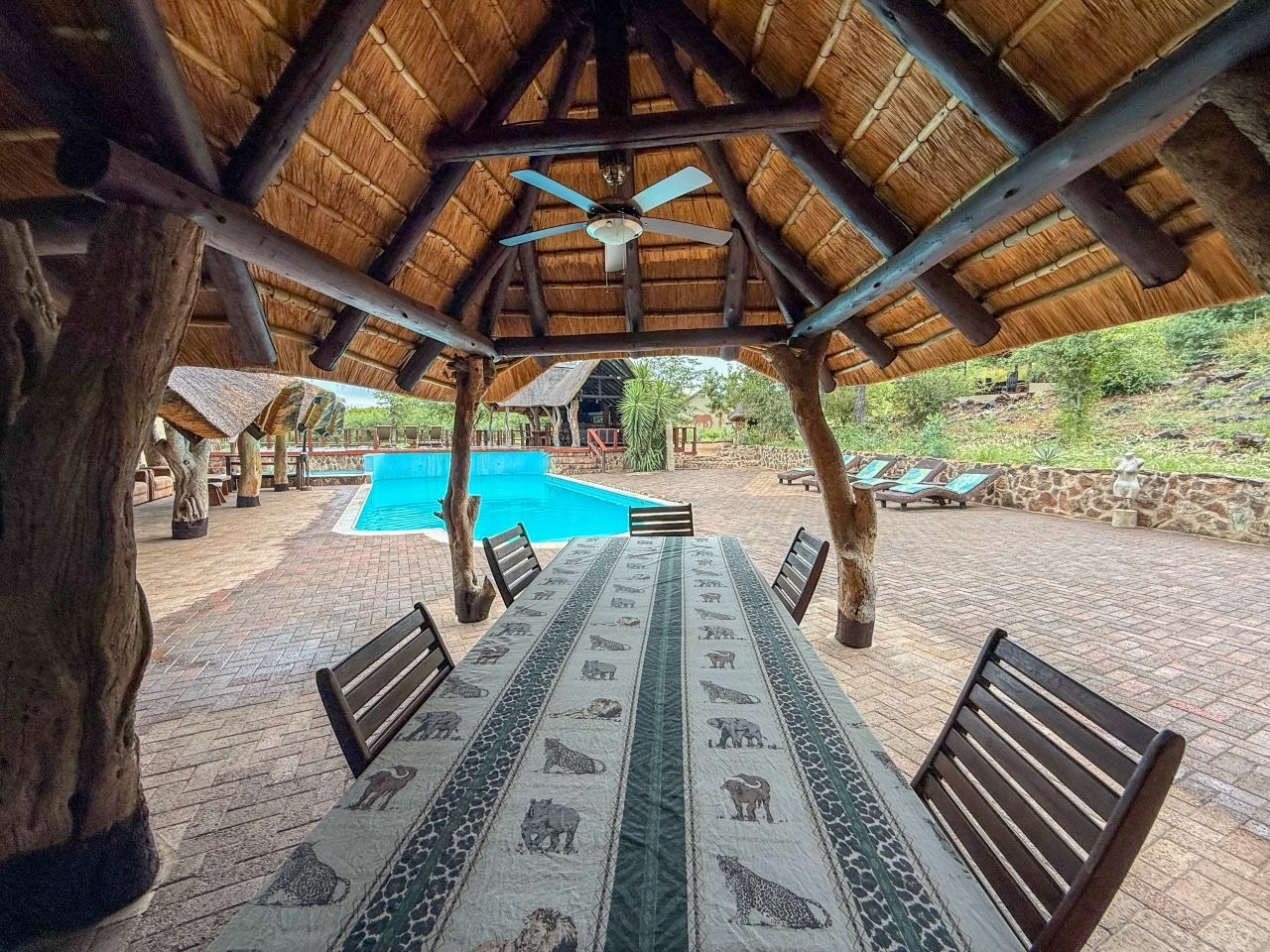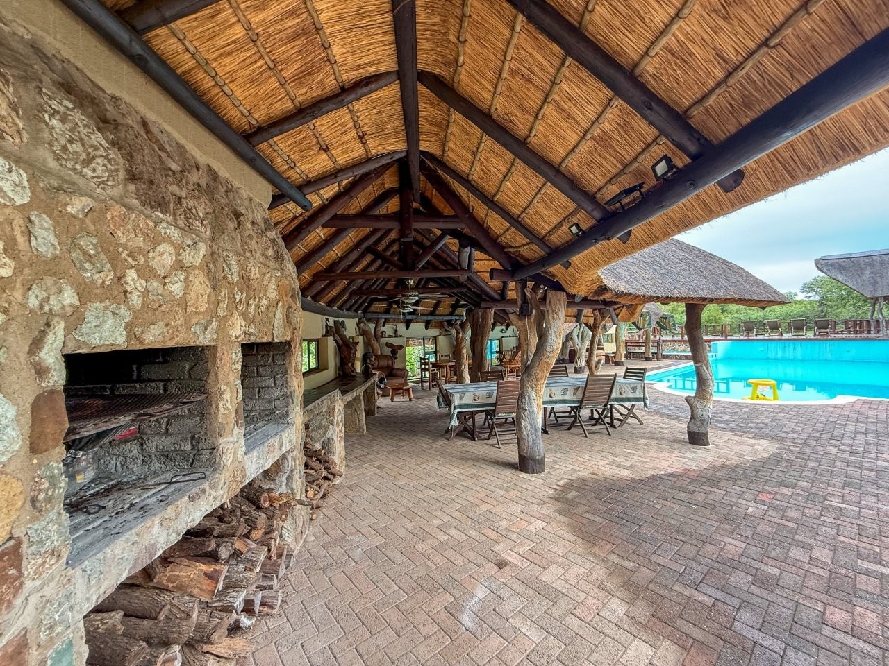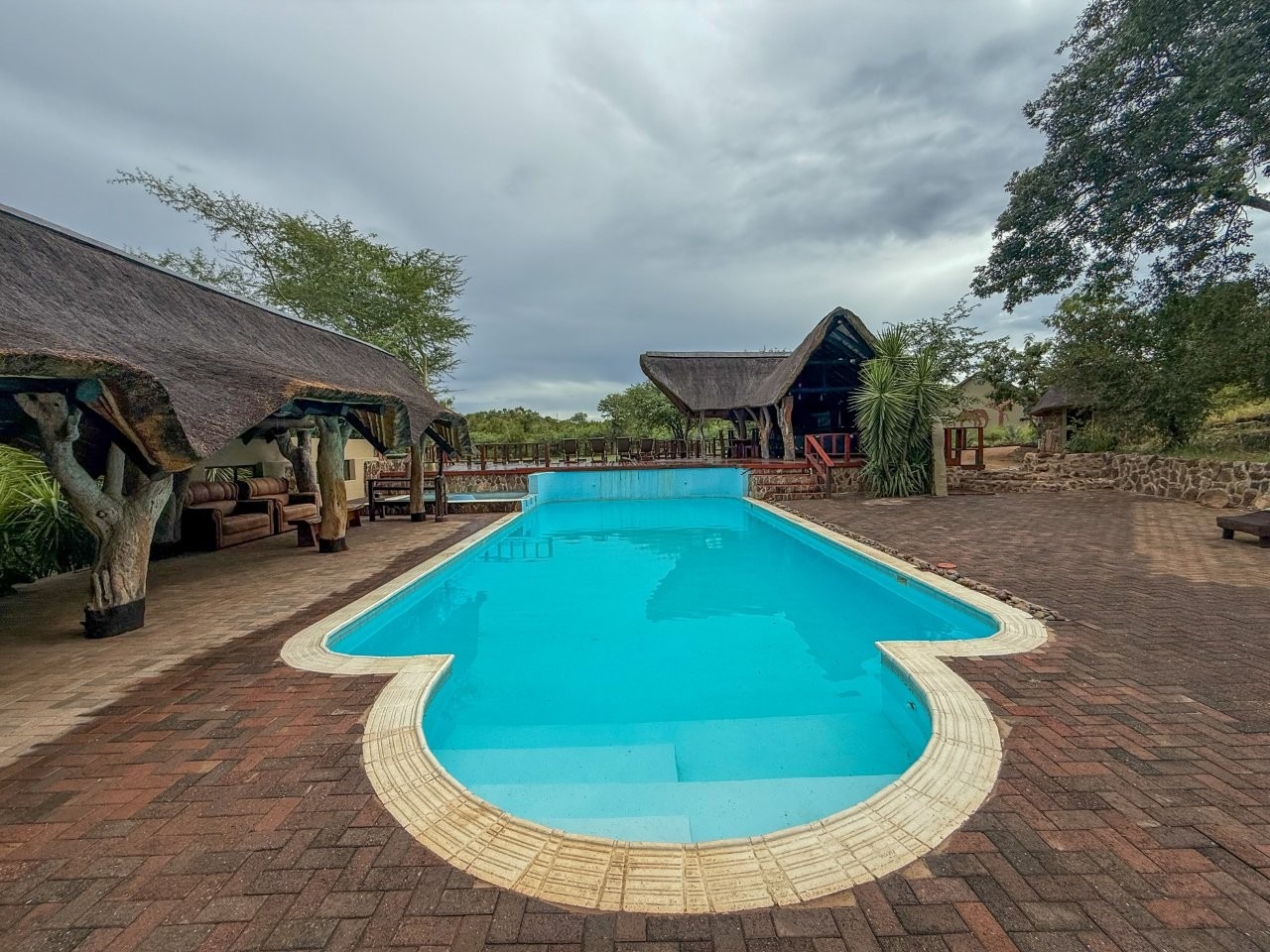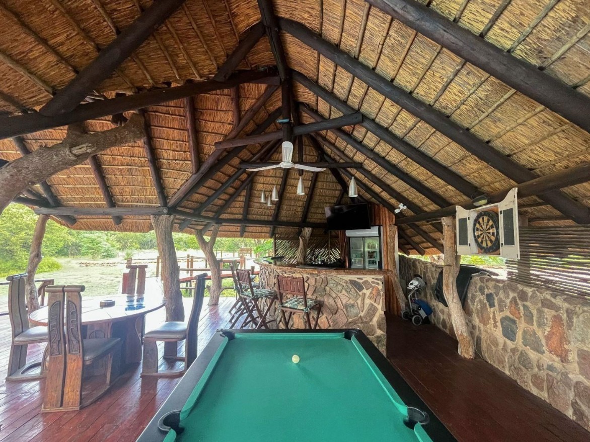 The lodge is thoughtfully positioned to maximise its natural surroundings, featuring a spacious elevated wooden deck with views over a private waterhole regularly visited by wildlife. Additional amenities include a large outdoor swimming pool, pool bar, and a traditional open-air lapa/boma, providing an authentic bushveld hospitality experience.