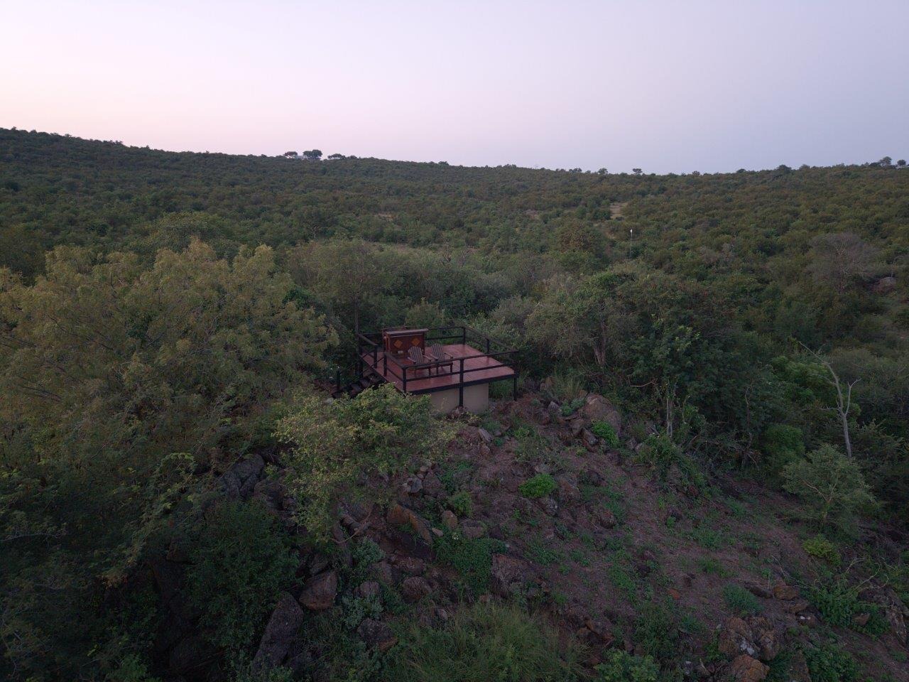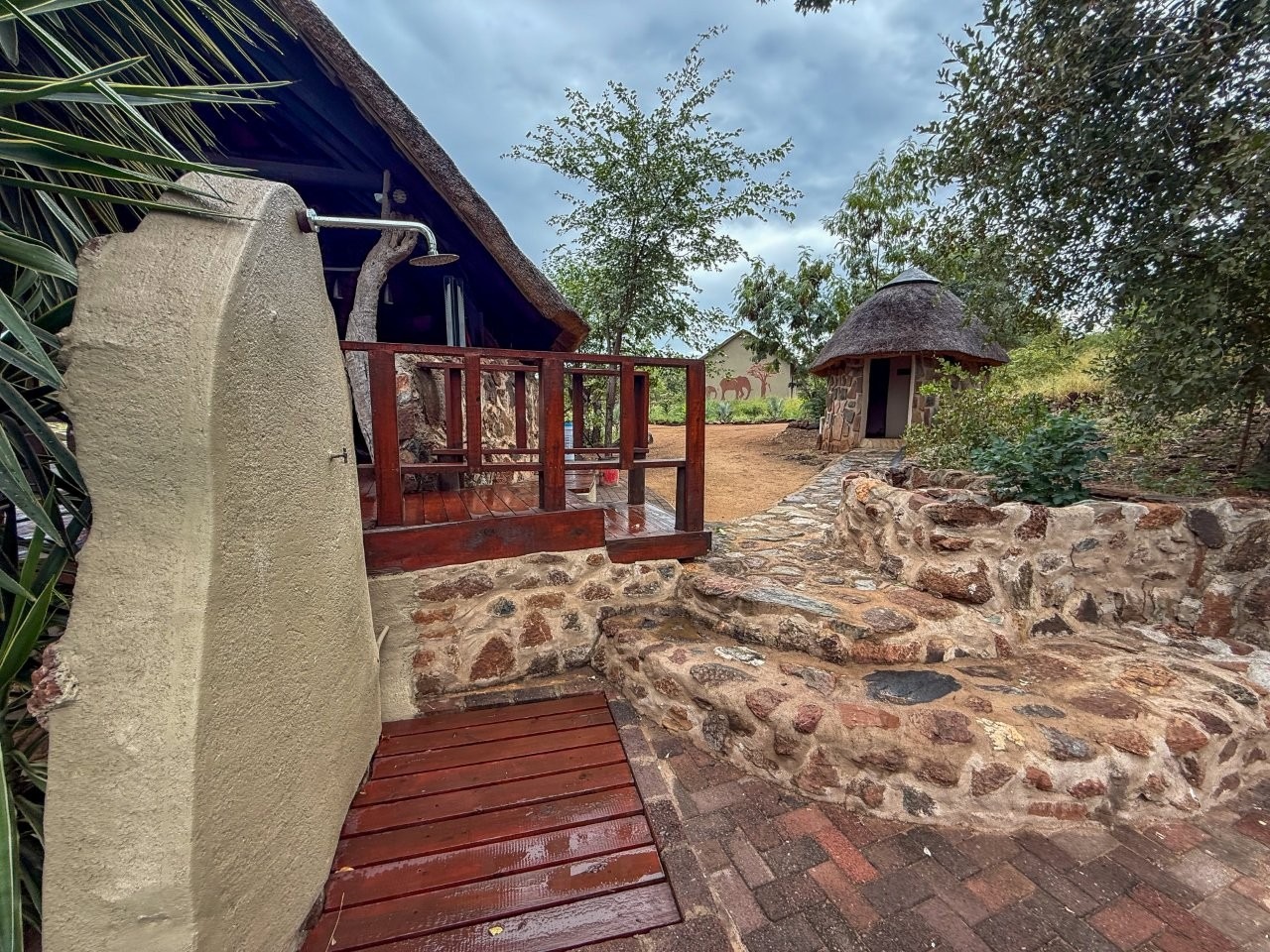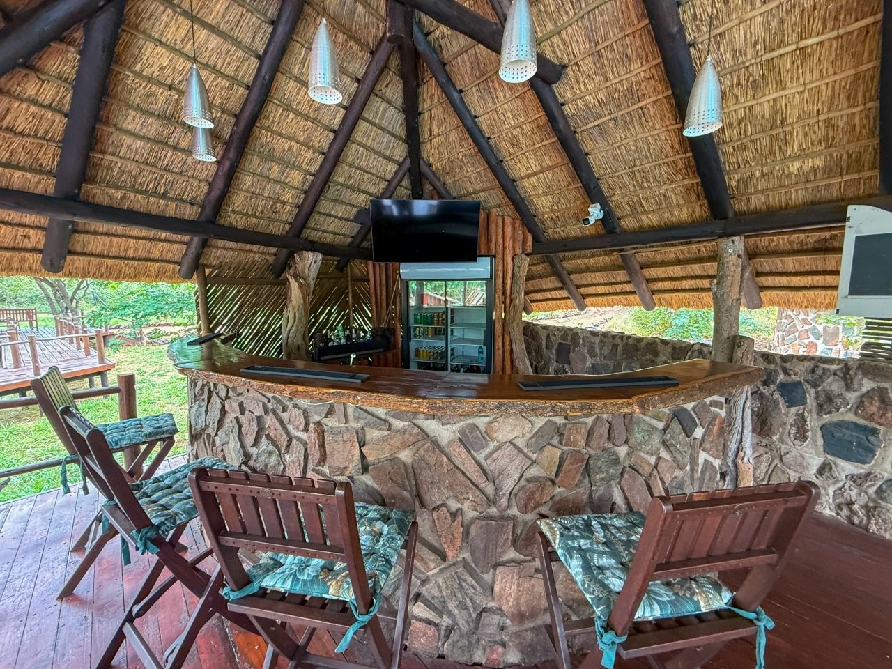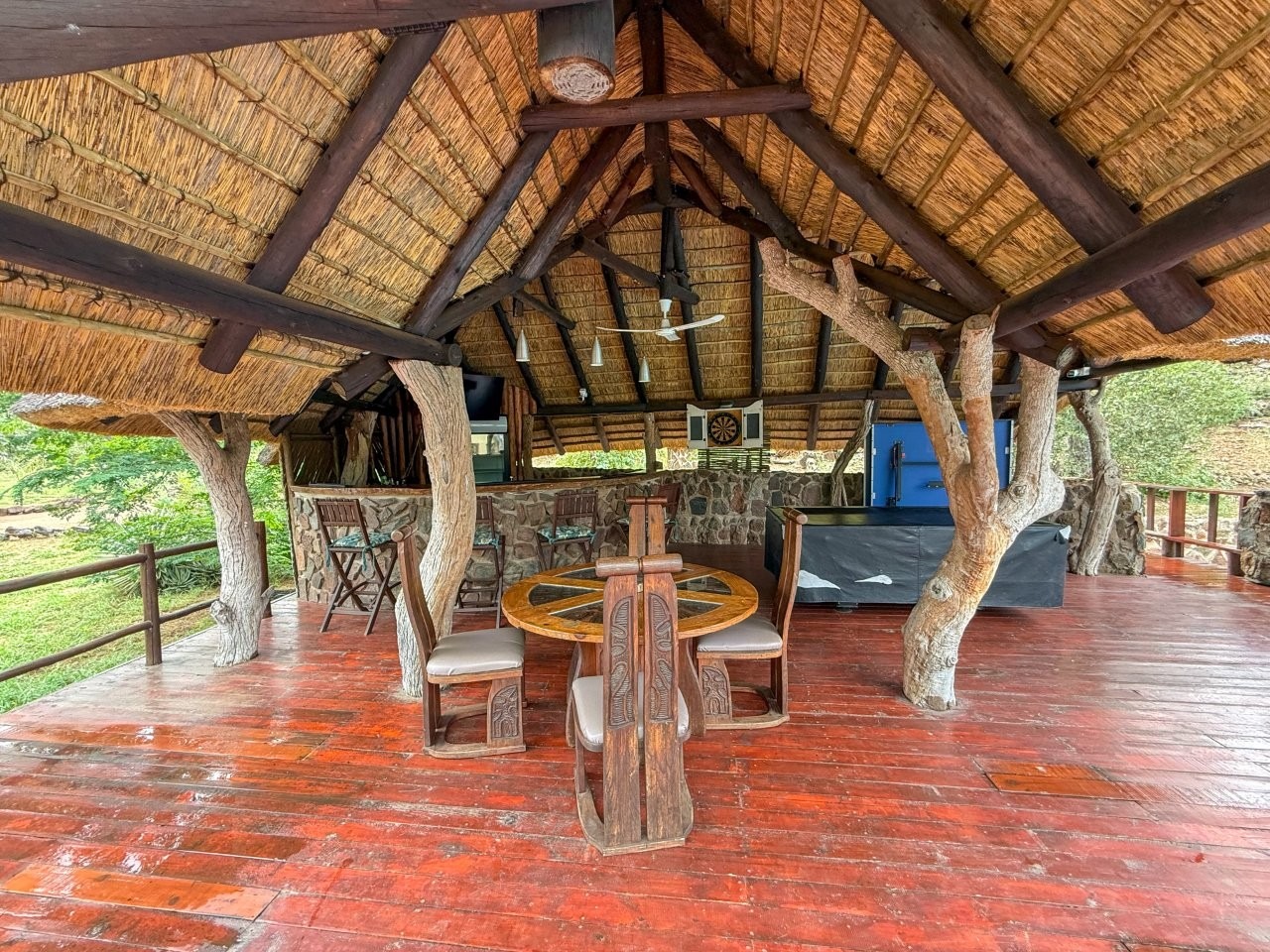 The lodge is thoughtfully positioned to maximise its natural surroundings, featuring a spacious elevated wooden deck with views over a private waterhole regularly visited by wildlife. Additional amenities include a large outdoor swimming pool, pool bar, and a traditional open-air lapa/boma, providing an authentic bushveld hospitality experience.