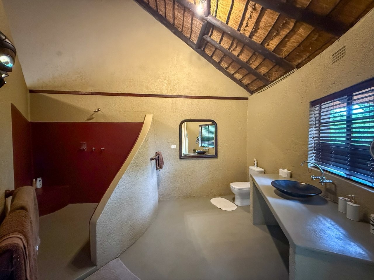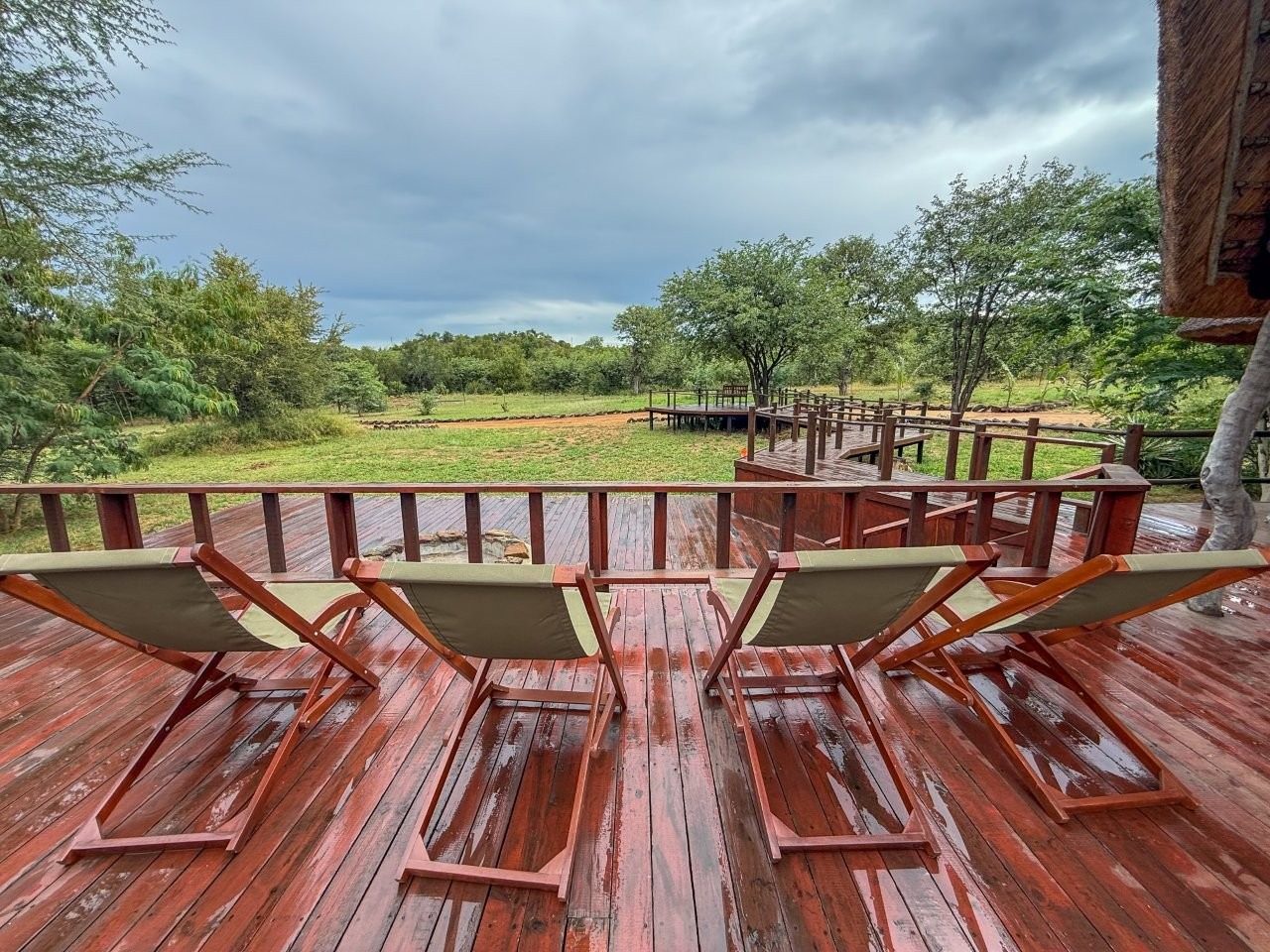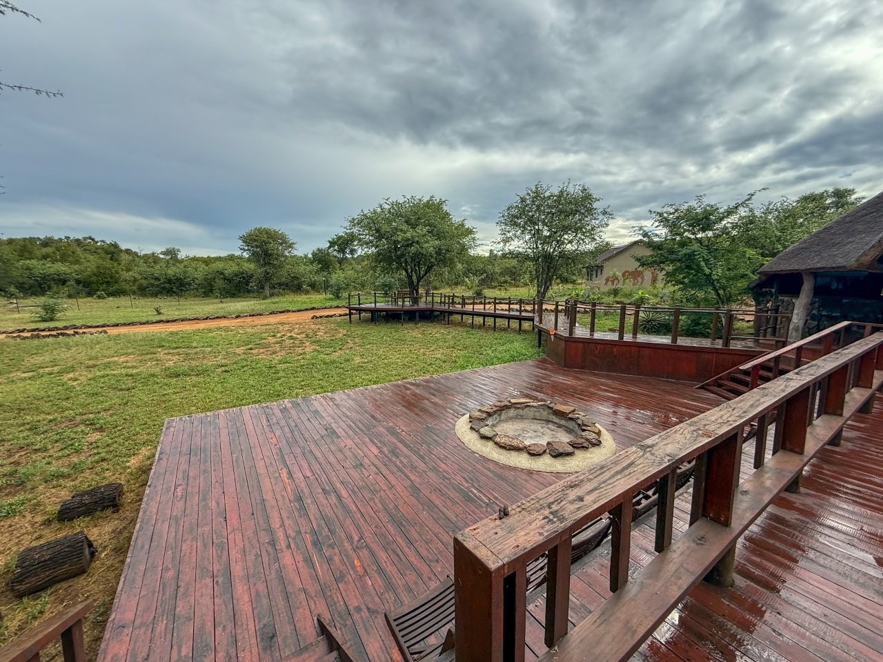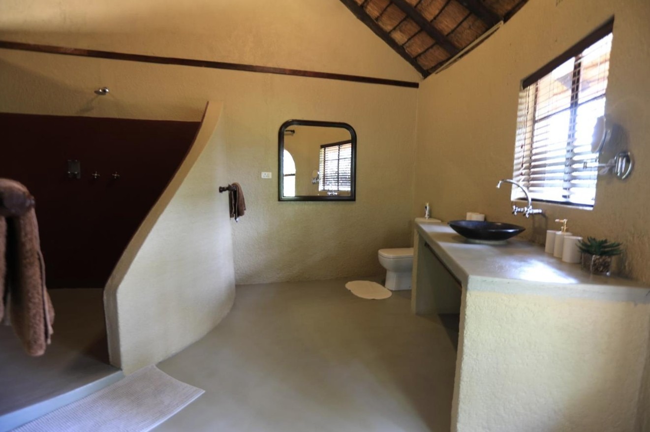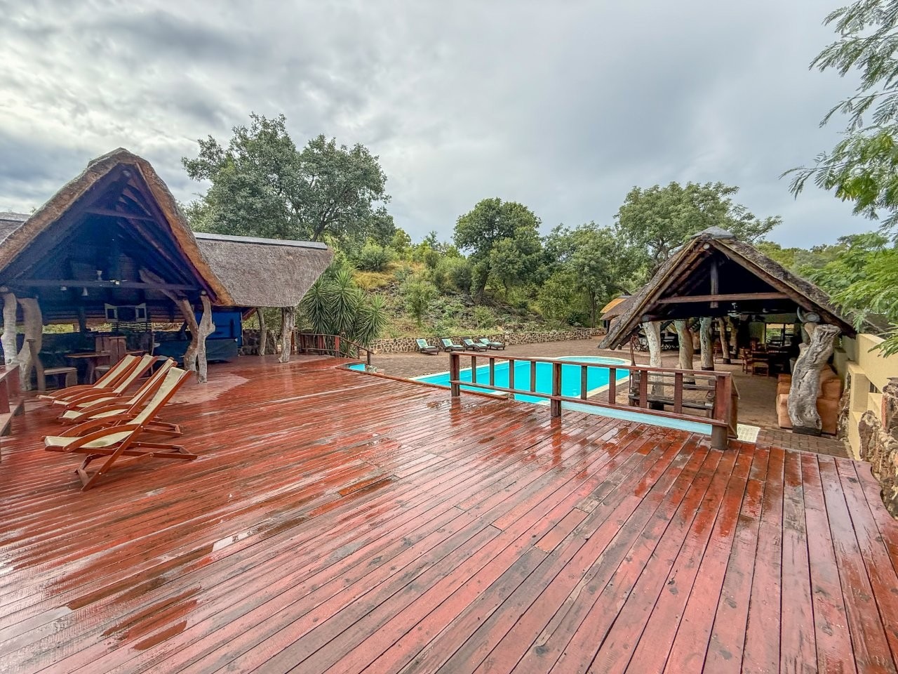 The lodge is thoughtfully positioned to maximise its natural surroundings, featuring a spacious elevated wooden deck with views over a private waterhole regularly visited by wildlife. Additional amenities include a large outdoor swimming pool, pool bar, and a traditional open-air lapa/boma, providing an authentic bushveld hospitality experience.