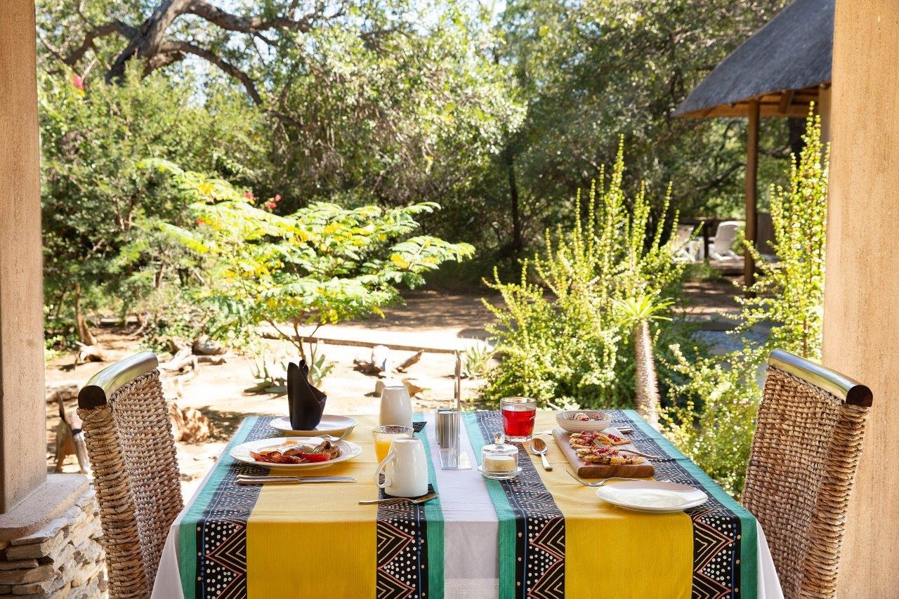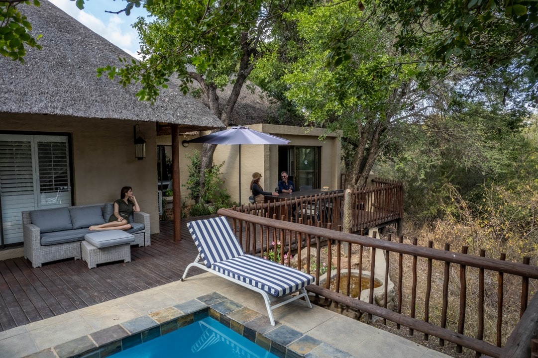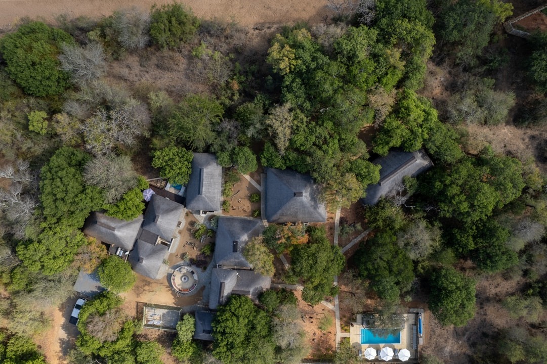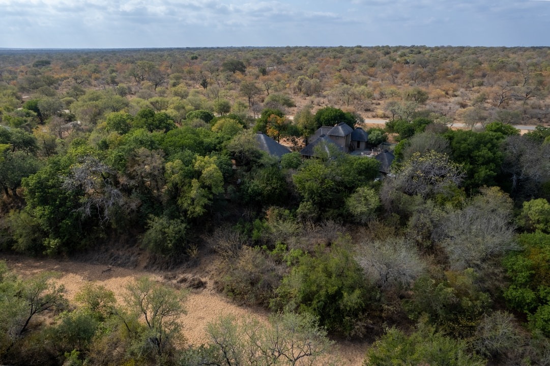 The lodge itself overlooks a seasonal dry riverbed — a natural corridor for wildlife activity — and is enveloped by magnificent indigenous trees and abundant