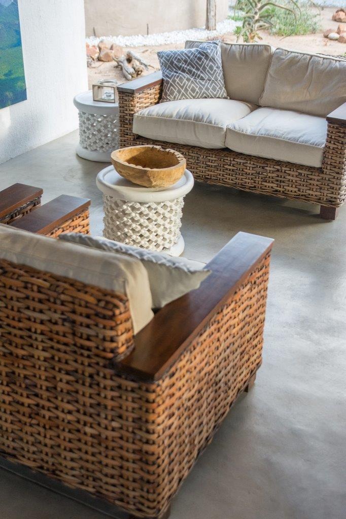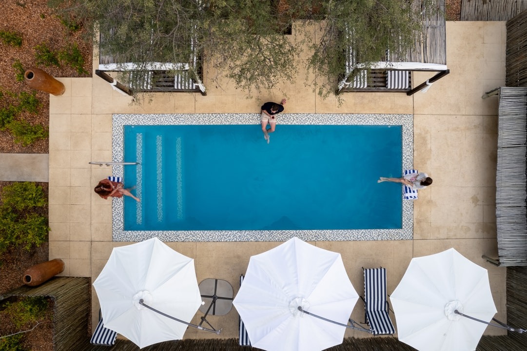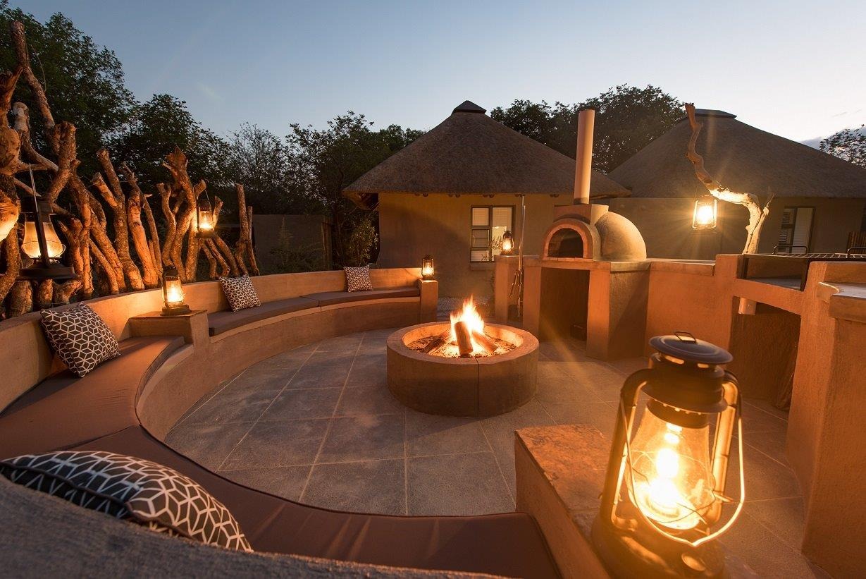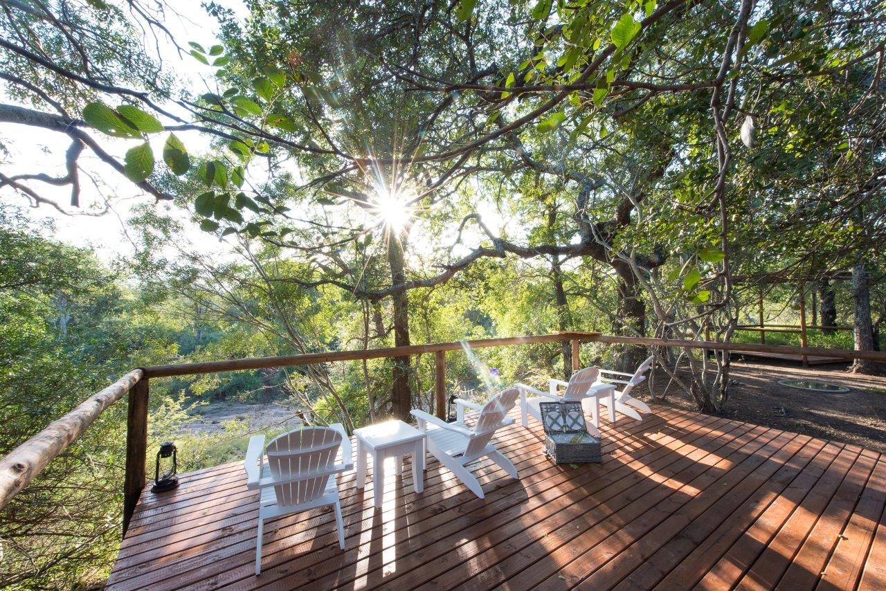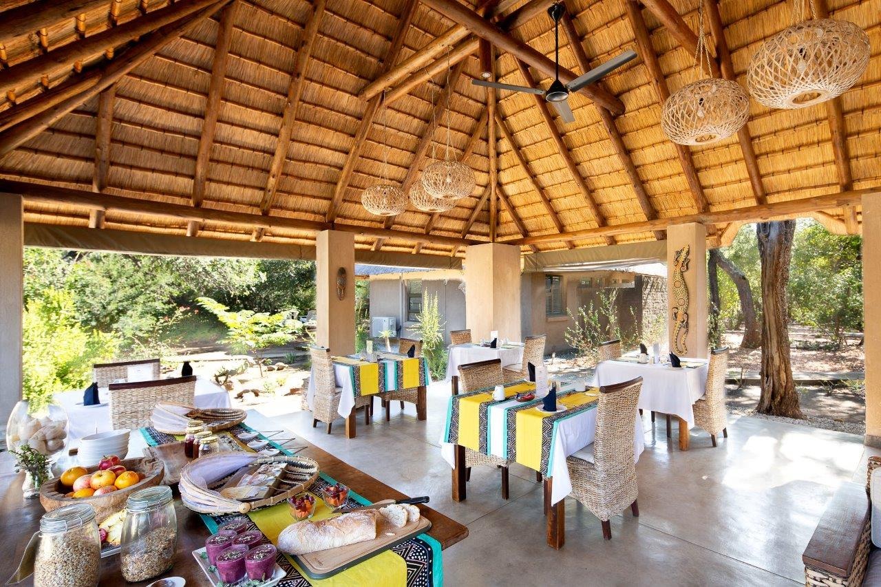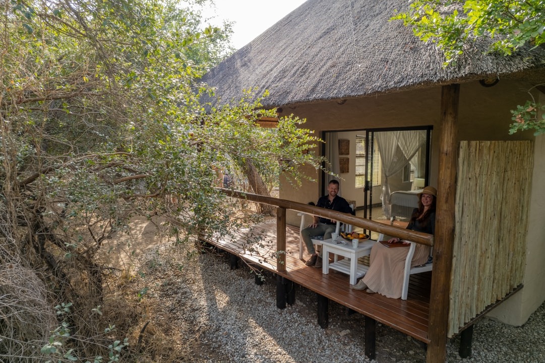 The lodge itself overlooks a seasonal dry riverbed — a natural corridor for wildlife activity — and is enveloped by magnificent indigenous trees and abundant