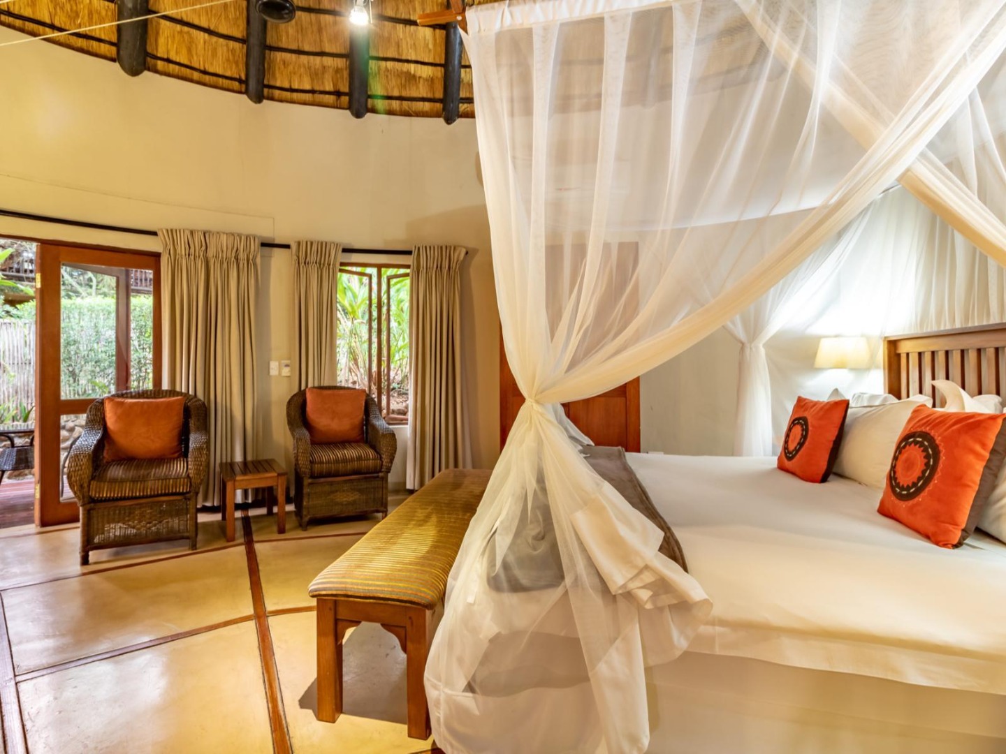 - Luxury King Suites: Spacious rooms with king-size (or optional twin) beds, en-suite bathrooms, air-conditioning, overhead fans, DSTV, private decks/verandas, fine linens, bathrobes and mosquito nets.