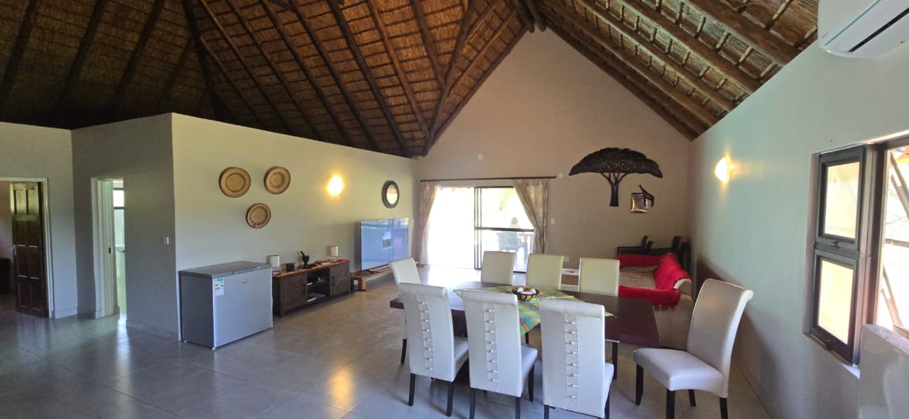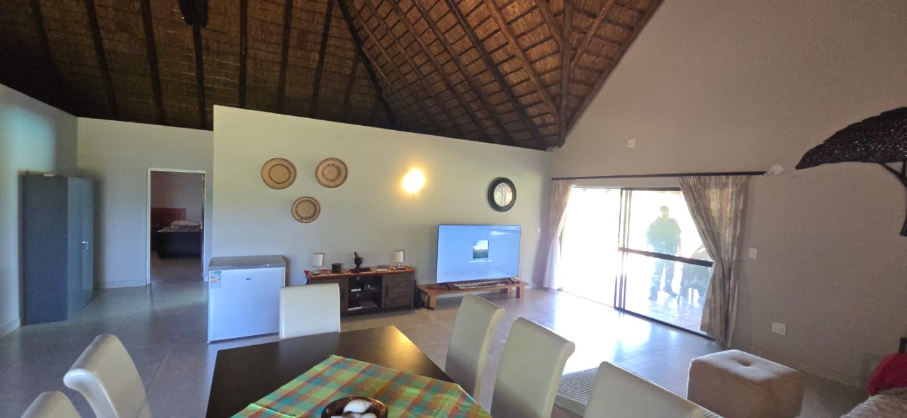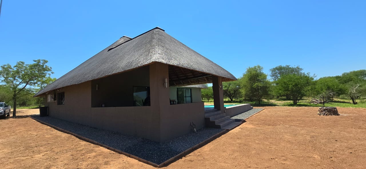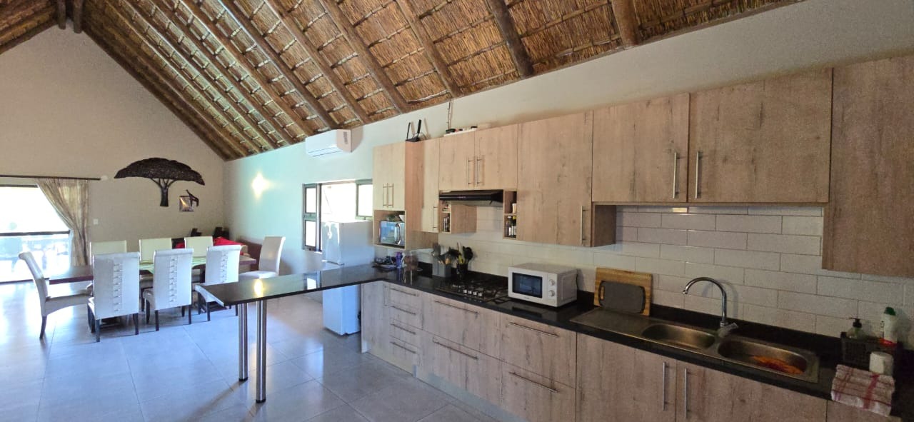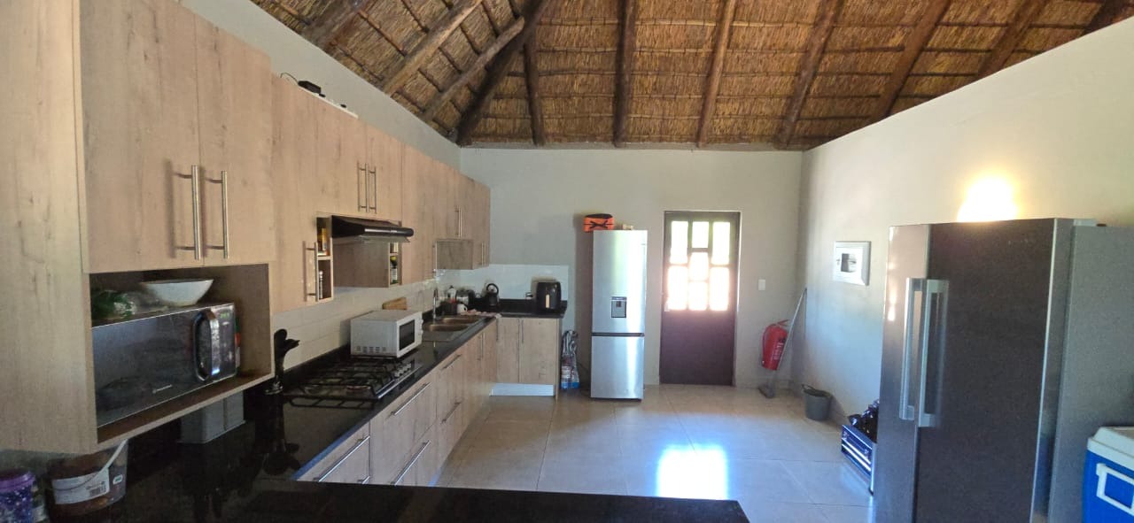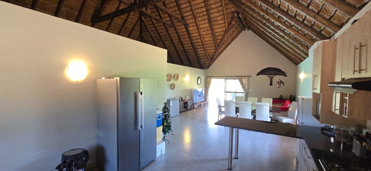 Discover this exquisite furnished 3-bedroom, 3-bathroom residence available for rent in the serene Hoedspruit Rural area. Each bedroom boasts an en-suite bathroom, ensuring privacy and comfort. The home features a distinctive thatched roof and an open-plan layout, seamlessly connecting the lounge, dining room, and a modern kitchen equipped with ample cabinetry, dark countertops, a gas stove, and two large refrigerators. Sliding doors enhance the indoor-outdoor flow, leading to inviting entertainment spaces.