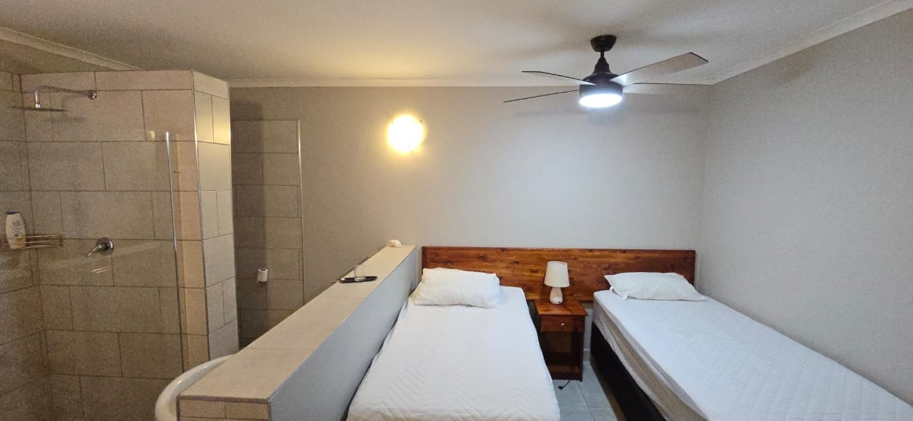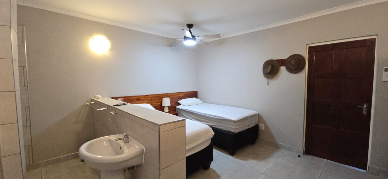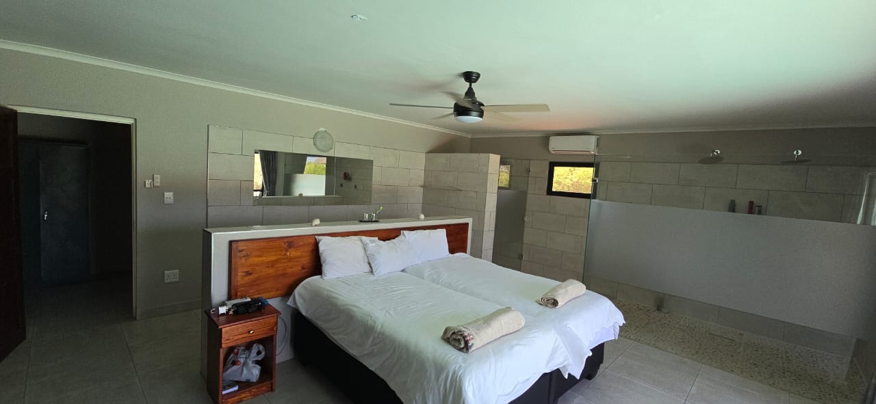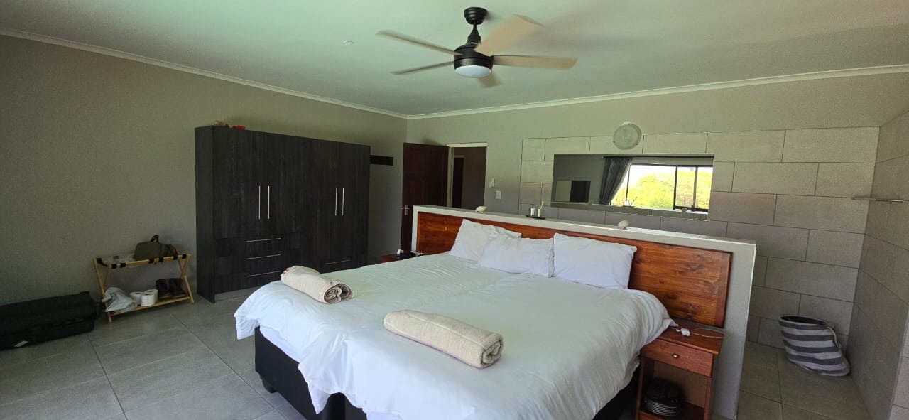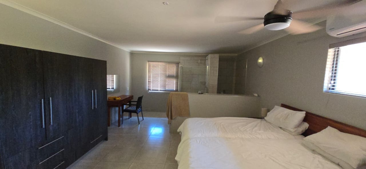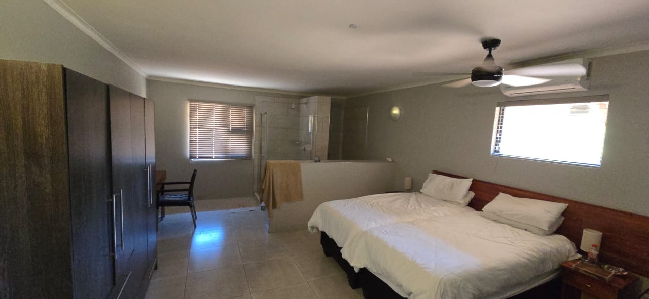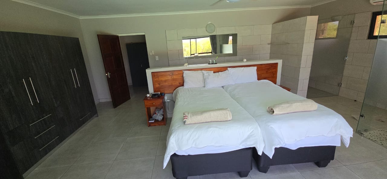 Discover this exquisite furnished 3-bedroom, 3-bathroom residence available for rent in the serene Hoedspruit Rural area. Each bedroom boasts an en-suite bathroom, ensuring privacy and comfort. The home features a distinctive thatched roof and an open-plan layout, seamlessly connecting the lounge, dining room, and a modern kitchen equipped with ample cabinetry, dark countertops, a gas stove, and two large refrigerators. Sliding doors enhance the indoor-outdoor flow, leading to inviting entertainment spaces.