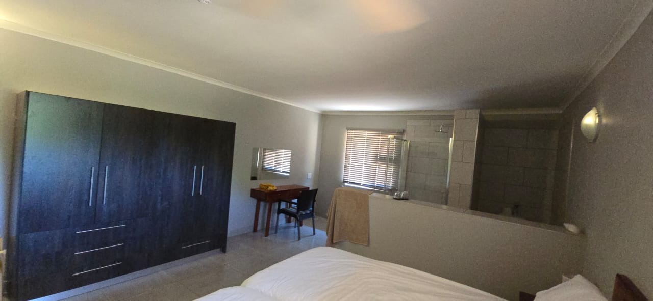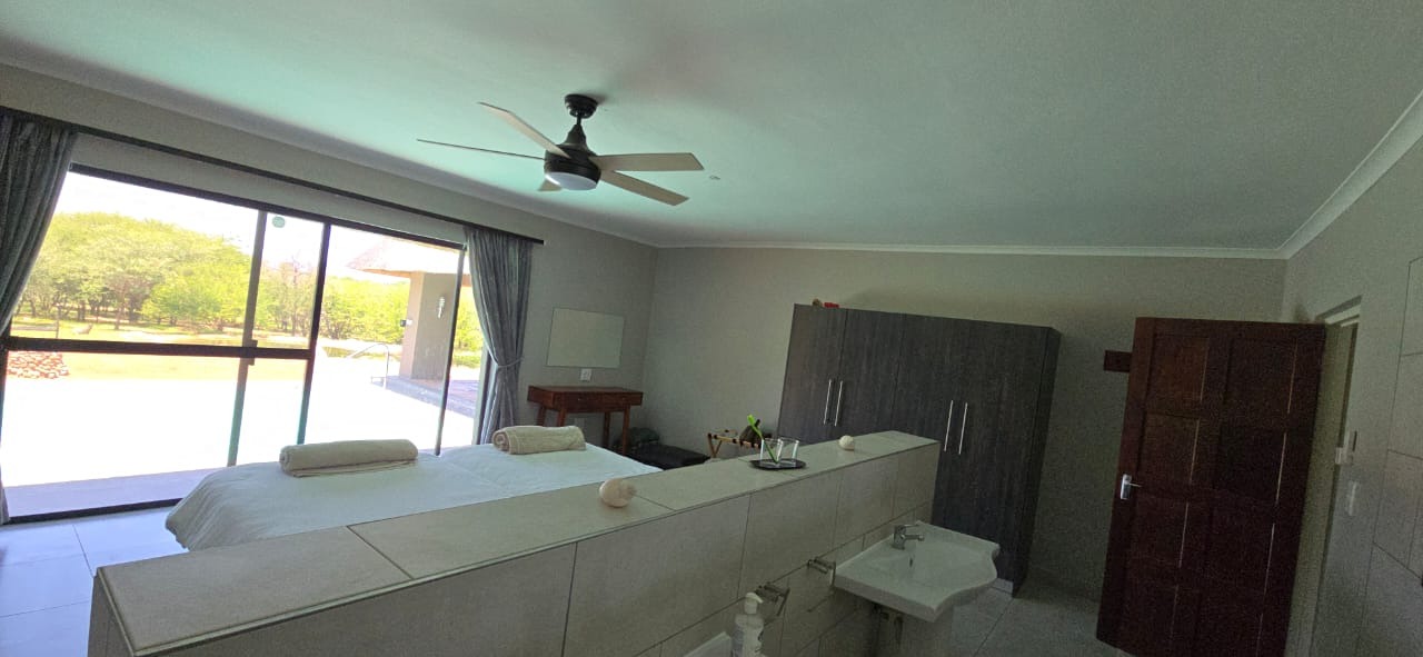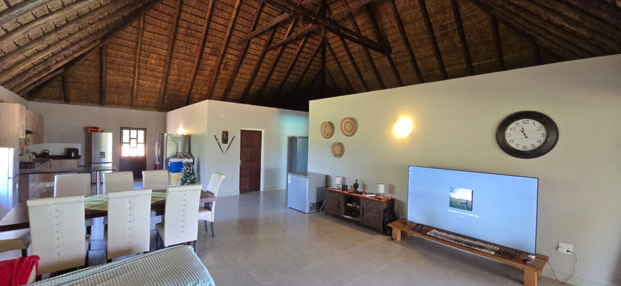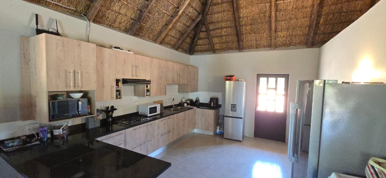 Discover this exquisite furnished 3-bedroom, 3-bathroom residence available for rent in the serene Hoedspruit Rural area. Each bedroom boasts an en-suite bathroom, ensuring privacy and comfort. The home features a distinctive thatched roof and an open-plan layout, seamlessly connecting the lounge, dining room, and a modern kitchen equipped with ample cabinetry, dark countertops, a gas stove, and two large refrigerators. Sliding doors enhance the indoor-outdoor flow, leading to inviting entertainment spaces.