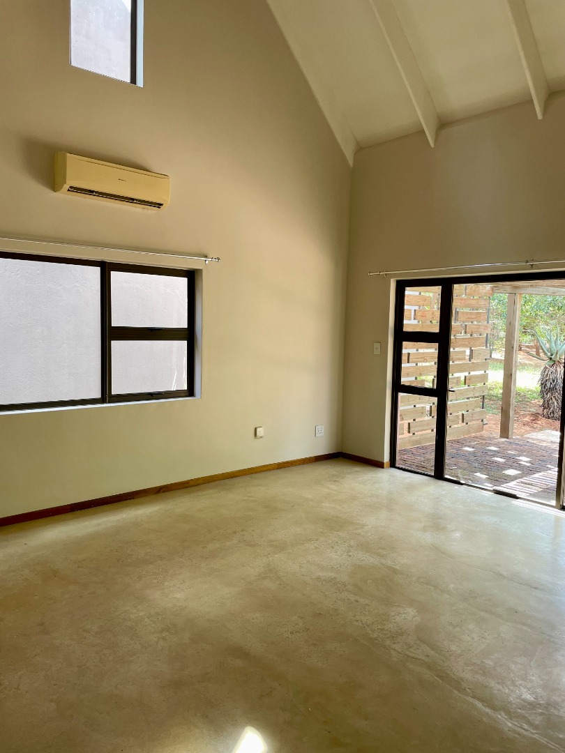 Discover modern living in this inviting 3-bedroom, 2-bathroom home available for rent within the esteemed Hoedspruit Wildlife Estate. The residence features an open-plan layout, seamlessly connecting the lounge and dining areas, perfect for contemporary lifestyles. The kitchen is equipped with modern white cabinetry, ample countertop space, and a stove/oven, ensuring a functional and stylish culinary experience. Special lighting and air conditioning enhance comfort throughout the home, while sliding doors promote excellent indoor-outdoor flow. One of the bathrooms is an ensuite, offering added privacy and convenience.