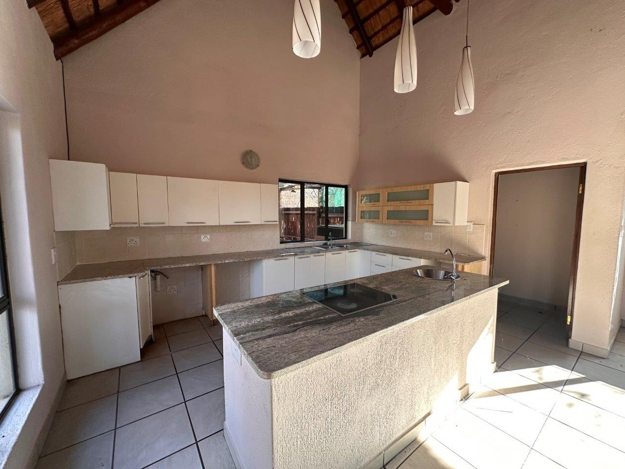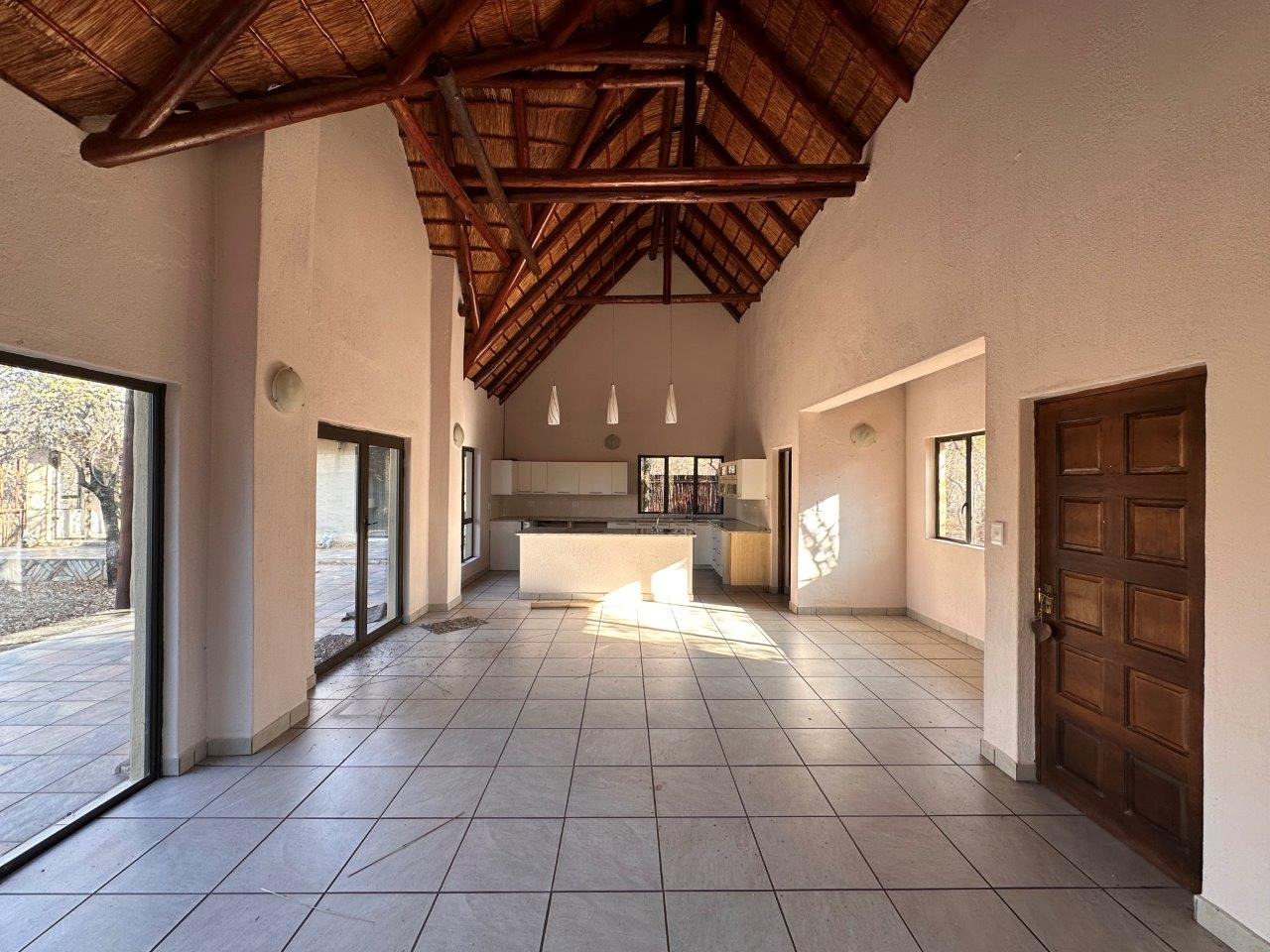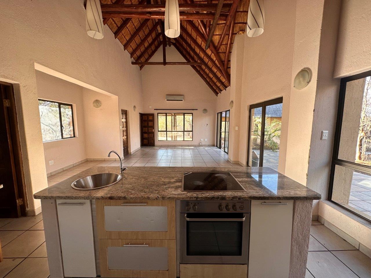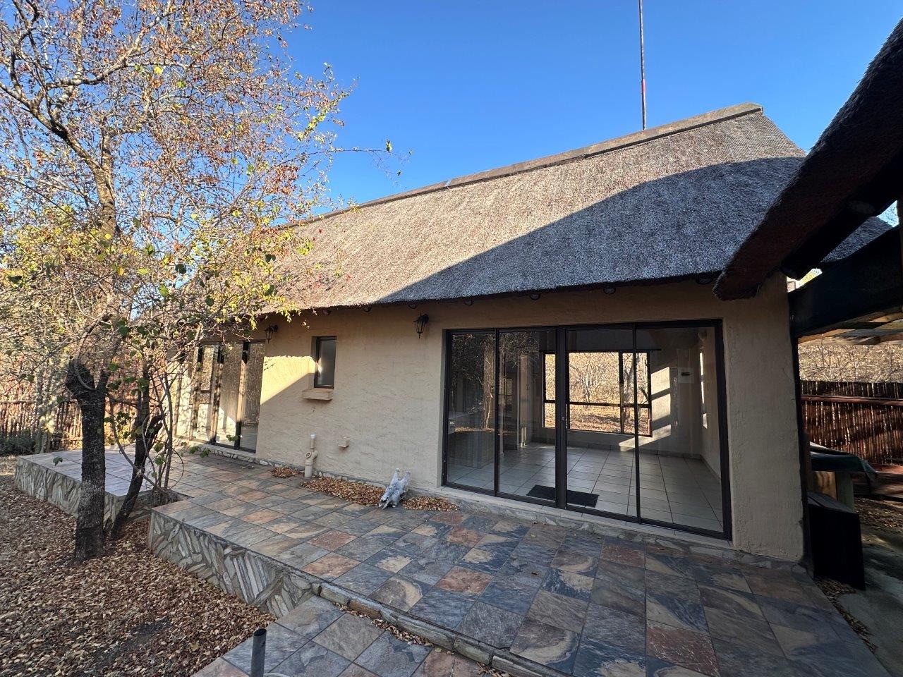 Discover an exceptional rental opportunity within the prestigious Hoedspruit Wildlife Estate, offering a unique blend of country living and metropolitan convenience. This distinctive thatched-roof property features four spacious bedrooms, each complemented by its own en-suite bathroom, ensuring privacy and comfort. The open-plan layout seamlessly integrates a welcoming lounge, a dedicated dining area, and a functional kitchen, all designed to maximize natural light and foster an inviting atmosphere. Large glass sliding doors enhance the indoor-outdoor flow, leading directly to the expansive outdoor living spaces.