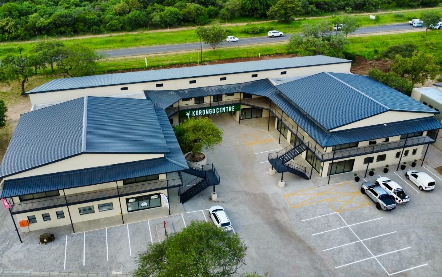 Korongo Centre will offer over 2,100m² of prime commercial space, brought to life with a striking architectural vision that complements and connects with Korongo House. A raised pedestrian walkway will seamlessly link the two properties, creating an integrated, accessible, and walkable business environment at the heart of Hoedspruit.