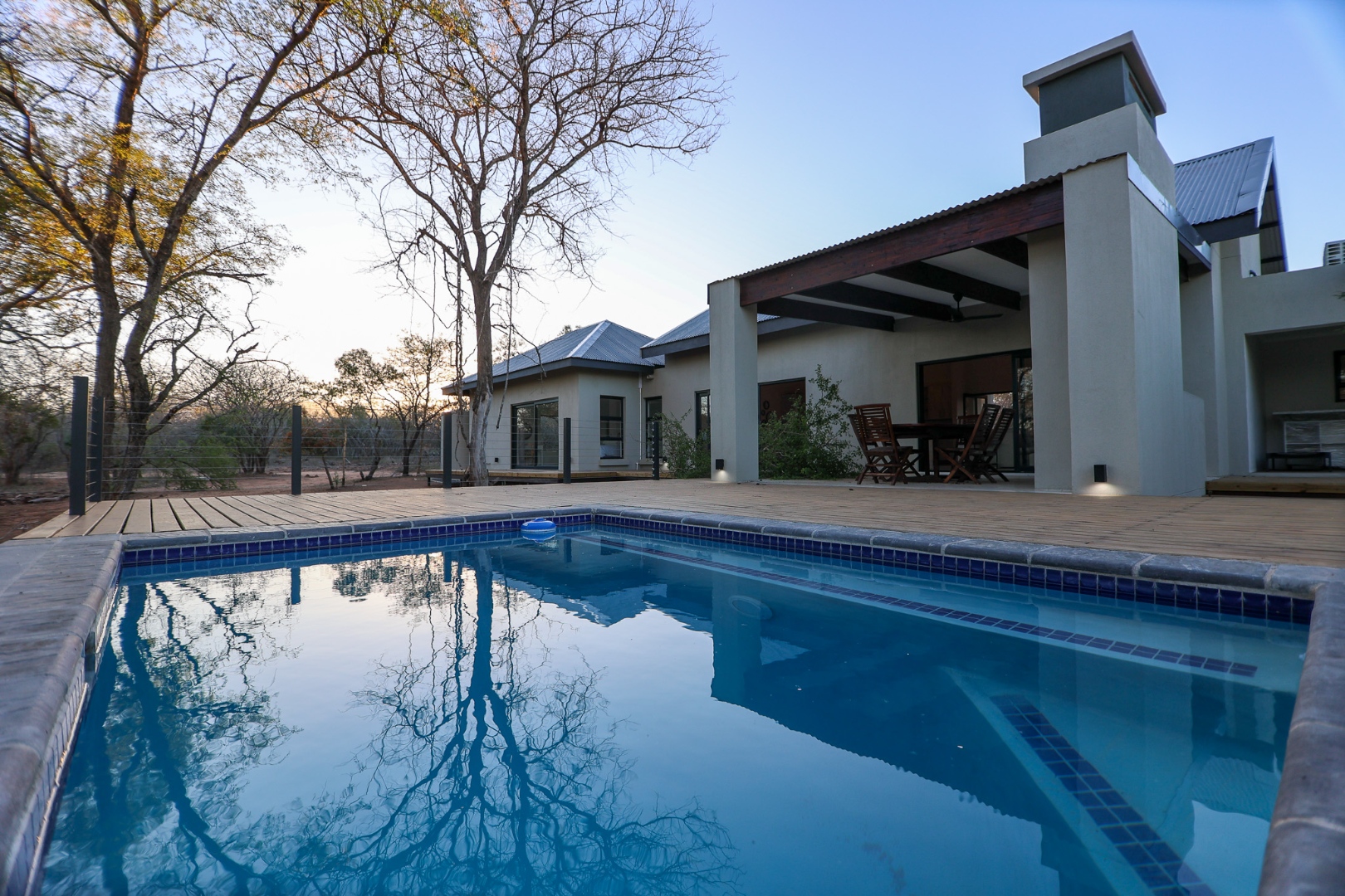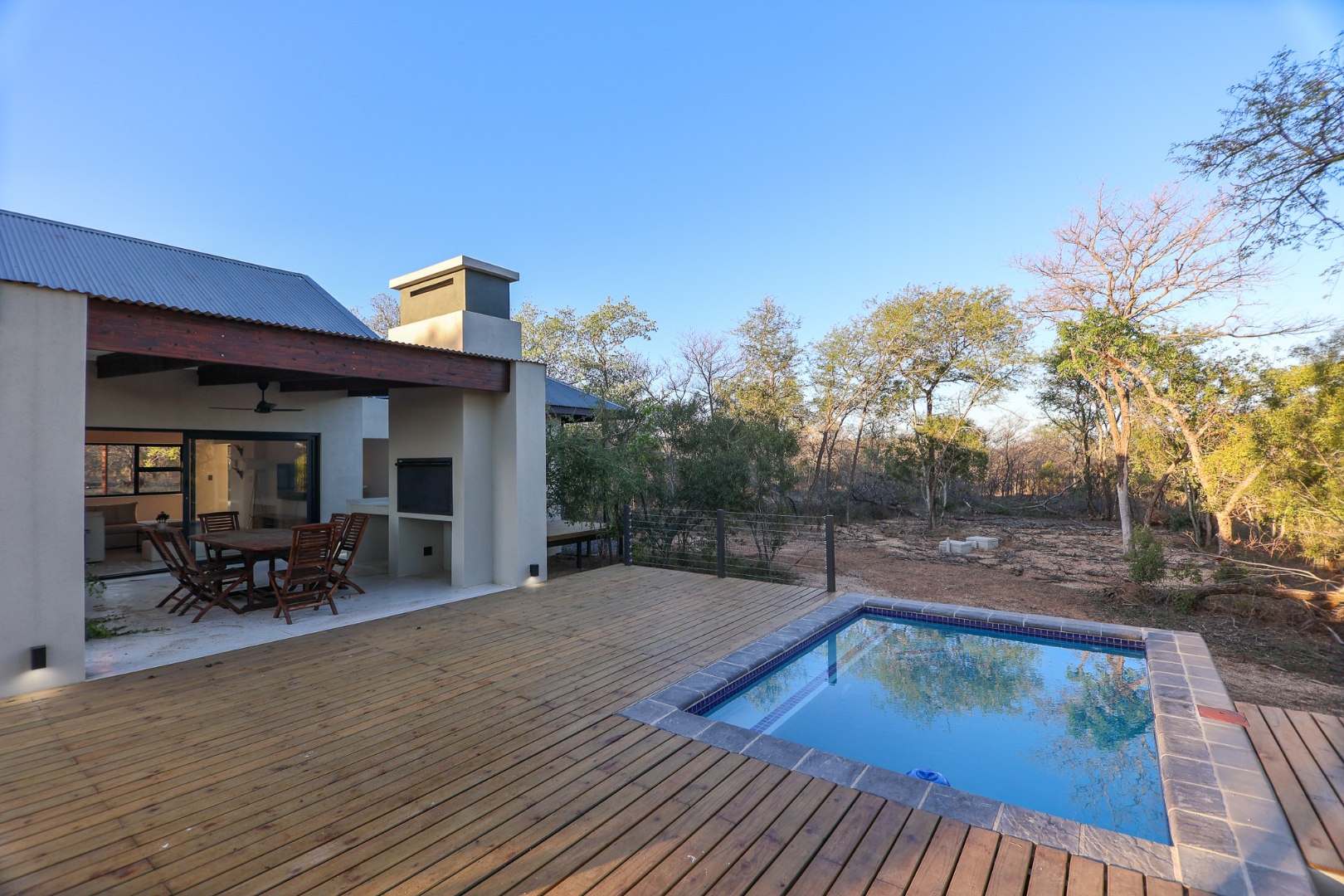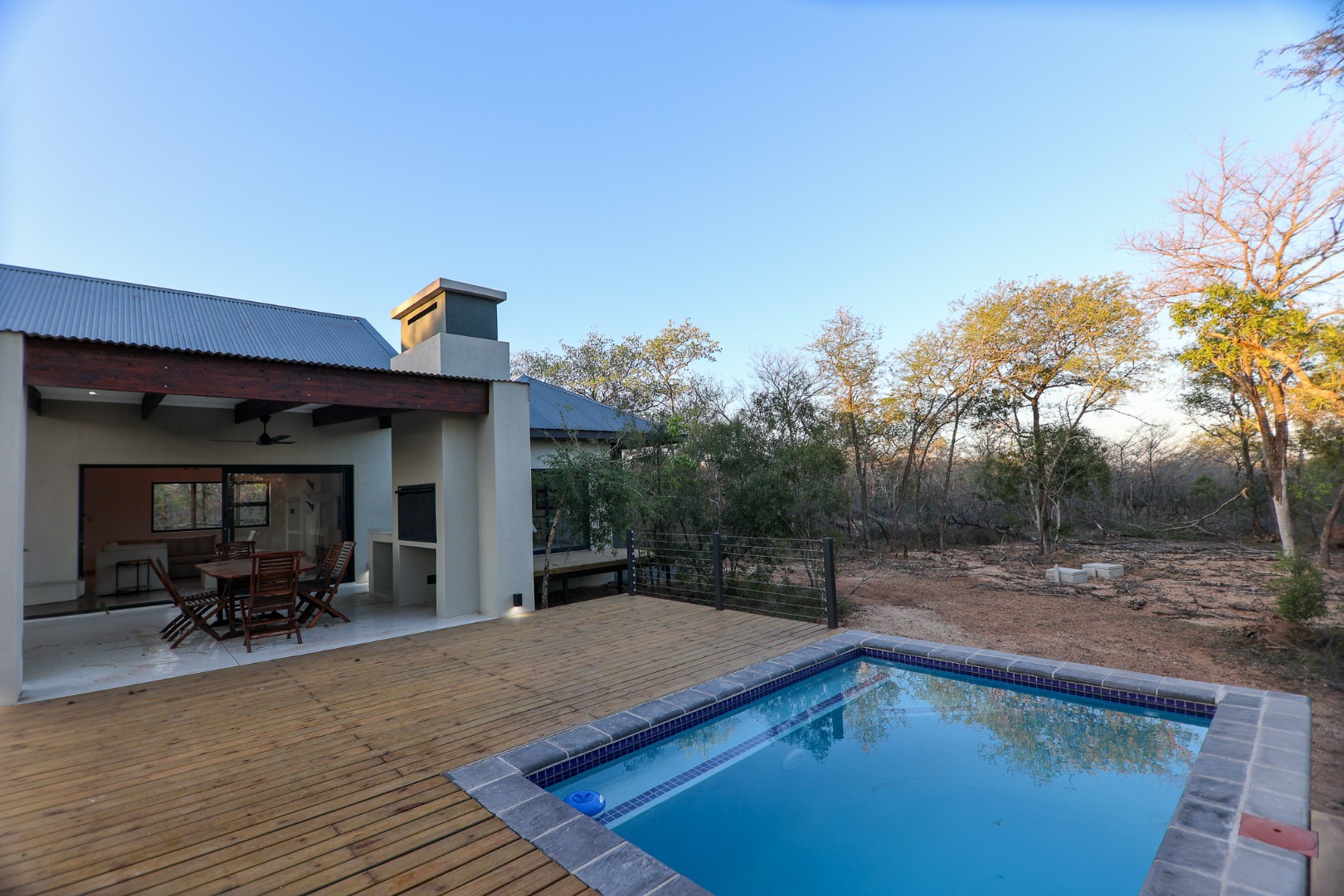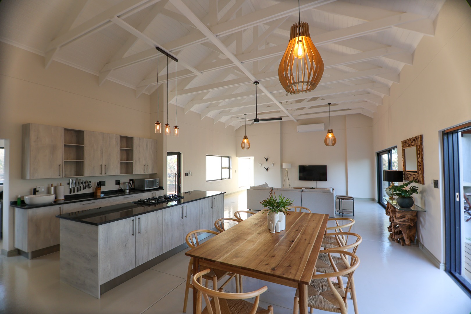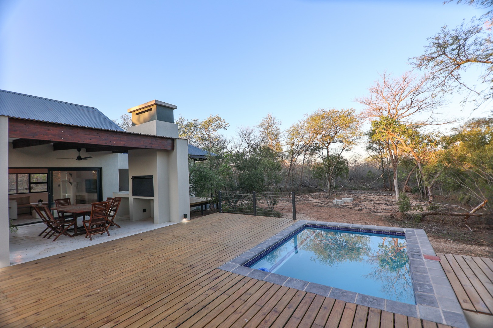 Discover an exceptional furnished rental opportunity within the prestigious Moditlo Nature Reserve, Hoedspruit. This modern 3-bedroom, 3.5-bathroom home offers a seamless blend of contemporary design and immersive bushveld living, ideal for those seeking a tranquil escape or a long-term nature-inspired lifestyle. The property boasts an expansive open-plan layout, featuring high vaulted ceilings with exposed trusses and large sliding doors that invite abundant natural light and connect effortlessly to the outdoors. The interior comprises a well-appointed kitchen, a dedicated dining room, a comfortable lounge, and an additional family TV room, all designed for spacious and functional living. Each of the three bedrooms benefits from an en-suite bathroom, ensuring privacy and convenience for all residents. The home is fully furnished, providing a ready-to-move-in experience with air conditioning for comfort in the African climate and a fireplace for cooler evenings. Step outside to embrace the quintessential bushveld lifestyle. The property features a generous patio, an expansive wooden deck, and a private swimming pool, perfect for relaxation and entertaining amidst the natural surroundings. A lapa further enhances the outdoor living experience, offering a shaded retreat. With 10,000 sqm of erf size, this eco-estate residence provides ample space and a scenic view, integrating seamlessly into the wildlife state environment. Security is paramount within this gated community and security estate, offering 24-hour security, a security post, access gates, electric fencing, and security gates for peace of mind. This property offers a unique opportunity to reside within a secure nature reserve, combining luxury with the untamed beauty of South Africa's Lowveld region, a renowned hub for wildlife and country living. Key Features: * Furnished 3-bedroom, 3.5-bathroom home * Open-plan living with vaulted ceilings * Private swimming pool, deck, and patio * Air conditioning and fireplace * Located in Moditlo Nature Reserve * Gated community with 24-hour security * Scenic bushveld views * 10,000 sqm erf size