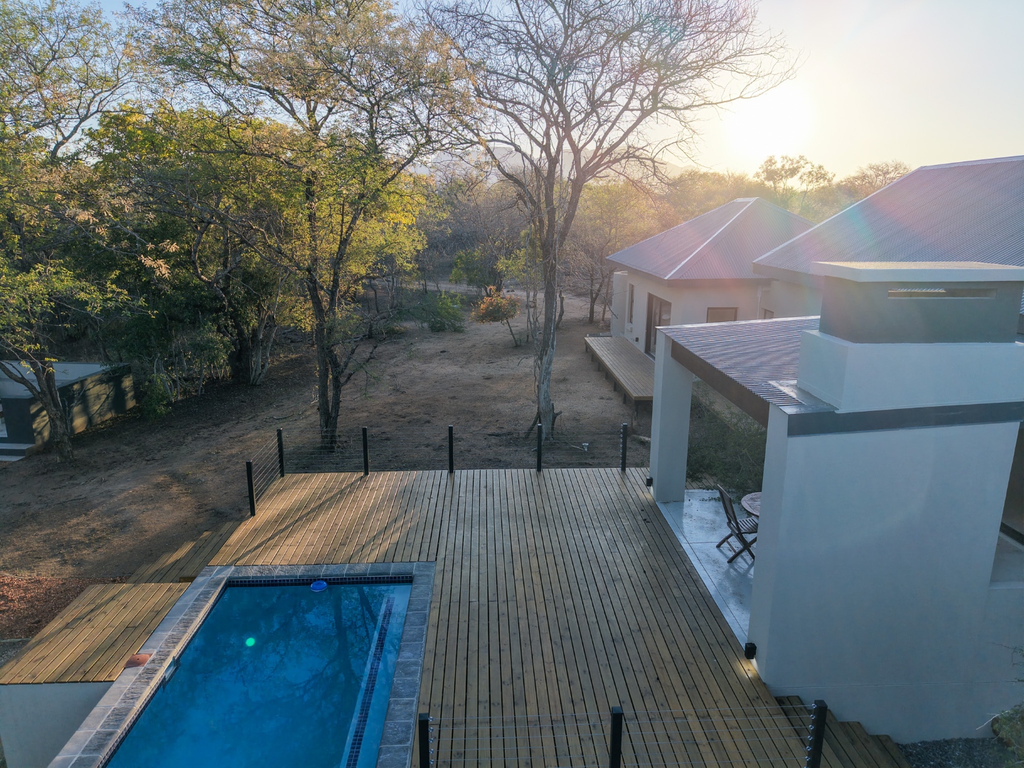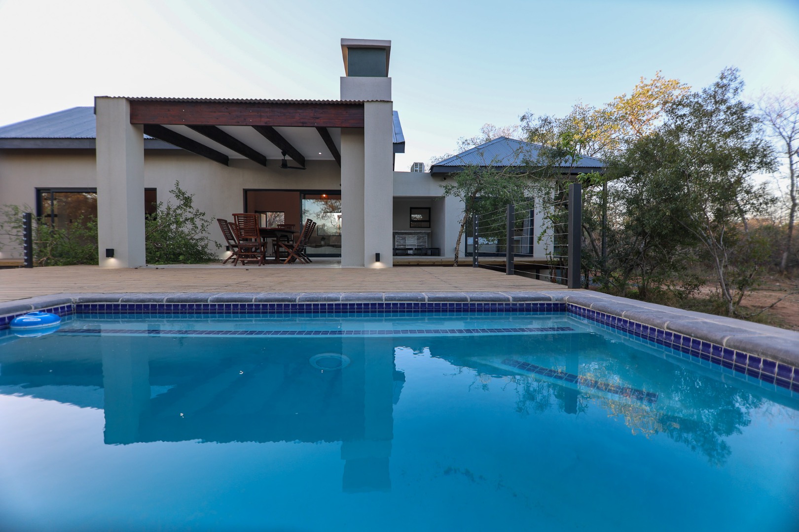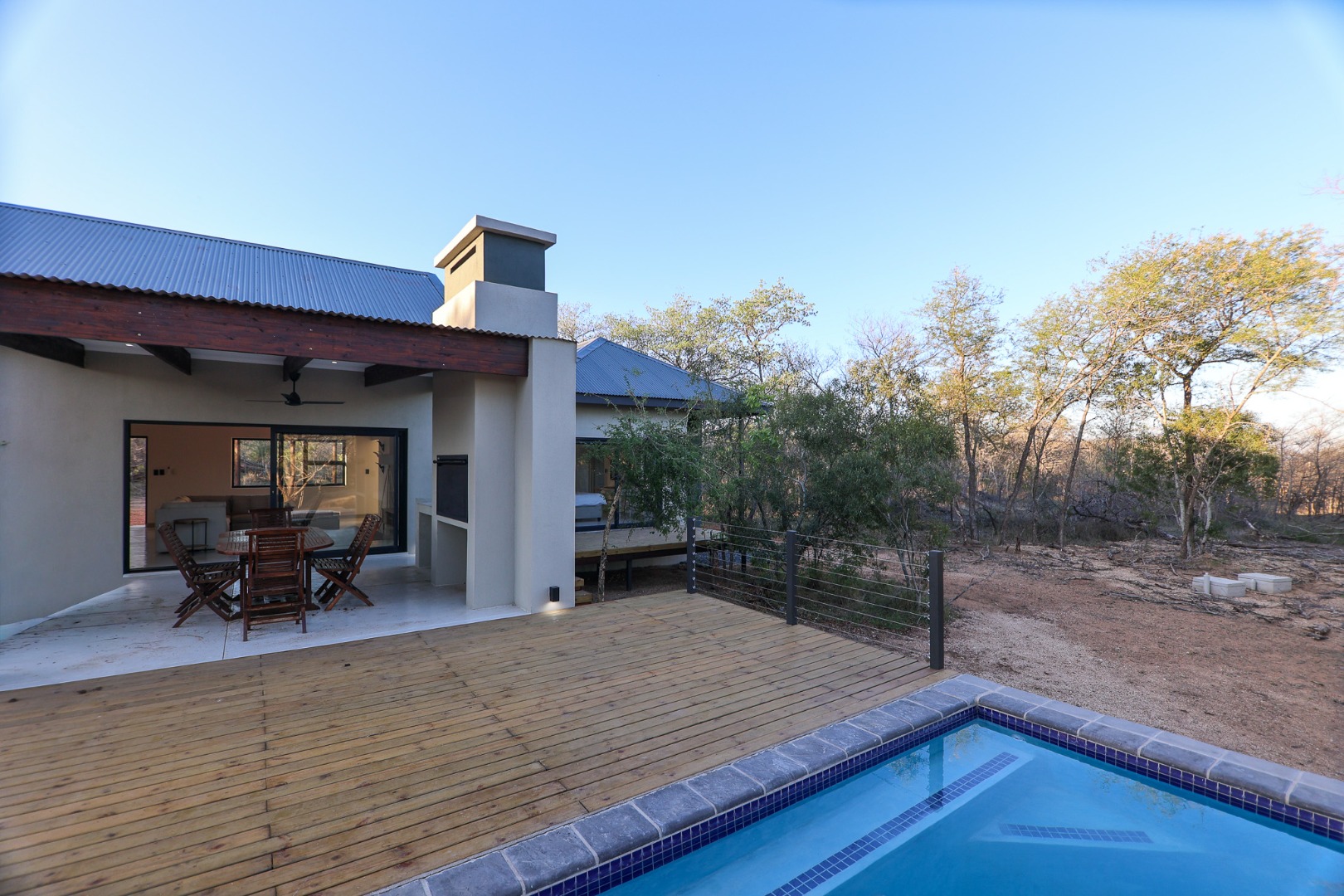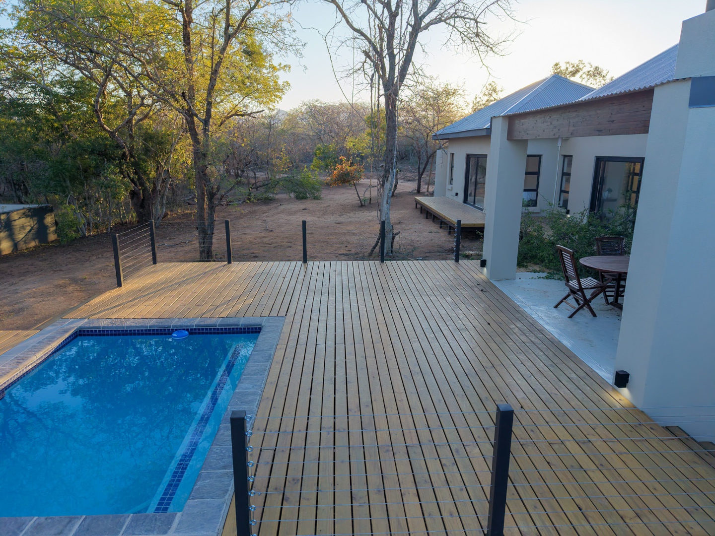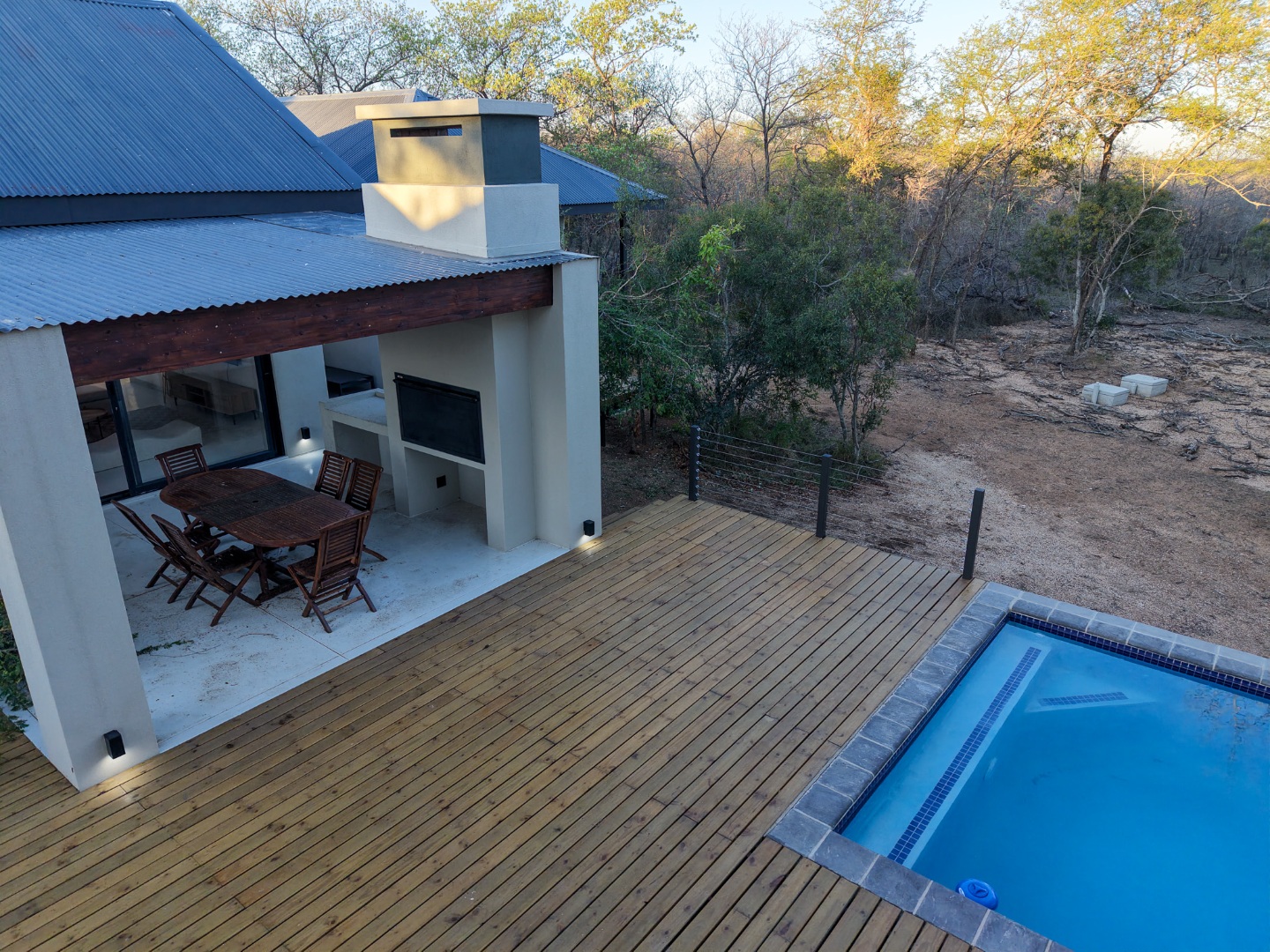 Discover an exceptional furnished rental opportunity within the prestigious Moditlo Nature Reserve, Hoedspruit. This modern 3-bedroom, 3.5-bathroom home offers a seamless blend of contemporary design and immersive bushveld living, ideal for those seeking a tranquil escape or a long-term nature-inspired lifestyle. The property boasts an expansive open-plan layout, featuring high vaulted ceilings with exposed trusses and large sliding doors that invite abundant natural light and connect effortlessly to the outdoors. The interior comprises a well-appointed kitchen, a dedicated dining room, a comfortable lounge, and an additional family TV room, all designed for spacious and functional living. Each of the three bedrooms benefits from an en-suite bathroom, ensuring privacy and convenience for all residents. The home is fully furnished, providing a ready-to-move-in experience with air conditioning for comfort in the African climate and a fireplace for cooler evenings. Step outside to embrace the quintessential bushveld lifestyle. The property features a generous patio, an expansive wooden deck, and a private swimming pool, perfect for relaxation and entertaining amidst the natural surroundings. A lapa further enhances the outdoor living experience, offering a shaded retreat. With 10,000 sqm of erf size, this eco-estate residence provides ample space and a scenic view, integrating seamlessly into the wildlife state environment. Security is paramount within this gated community and security estate, offering 24-hour security, a security post, access gates, electric fencing, and security gates for peace of mind. This property offers a unique opportunity to reside within a secure nature reserve, combining luxury with the untamed beauty of South Africa's Lowveld region, a renowned hub for wildlife and country living. Key Features: * Furnished 3-bedroom, 3.5-bathroom home * Open-plan living with vaulted ceilings * Private swimming pool, deck, and patio * Air conditioning and fireplace * Located in Moditlo Nature Reserve * Gated community with 24-hour security * Scenic bushveld views * 10,000 sqm erf size