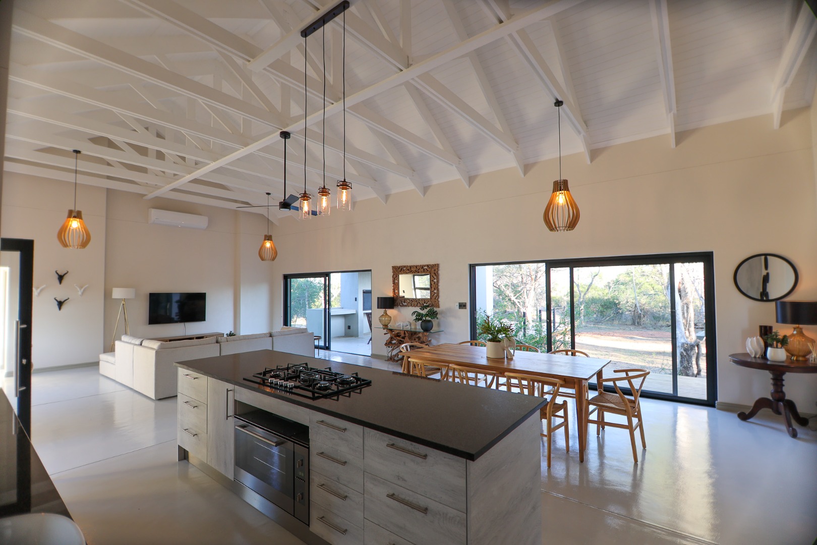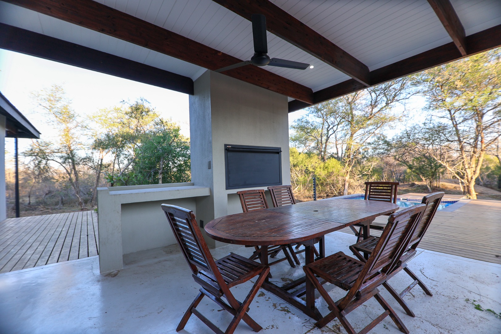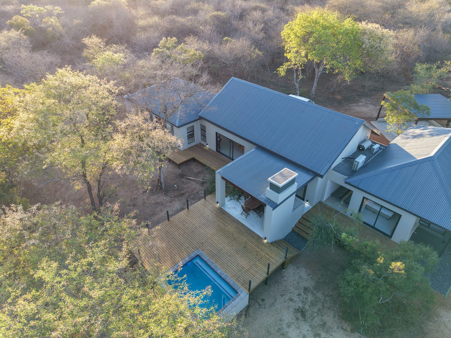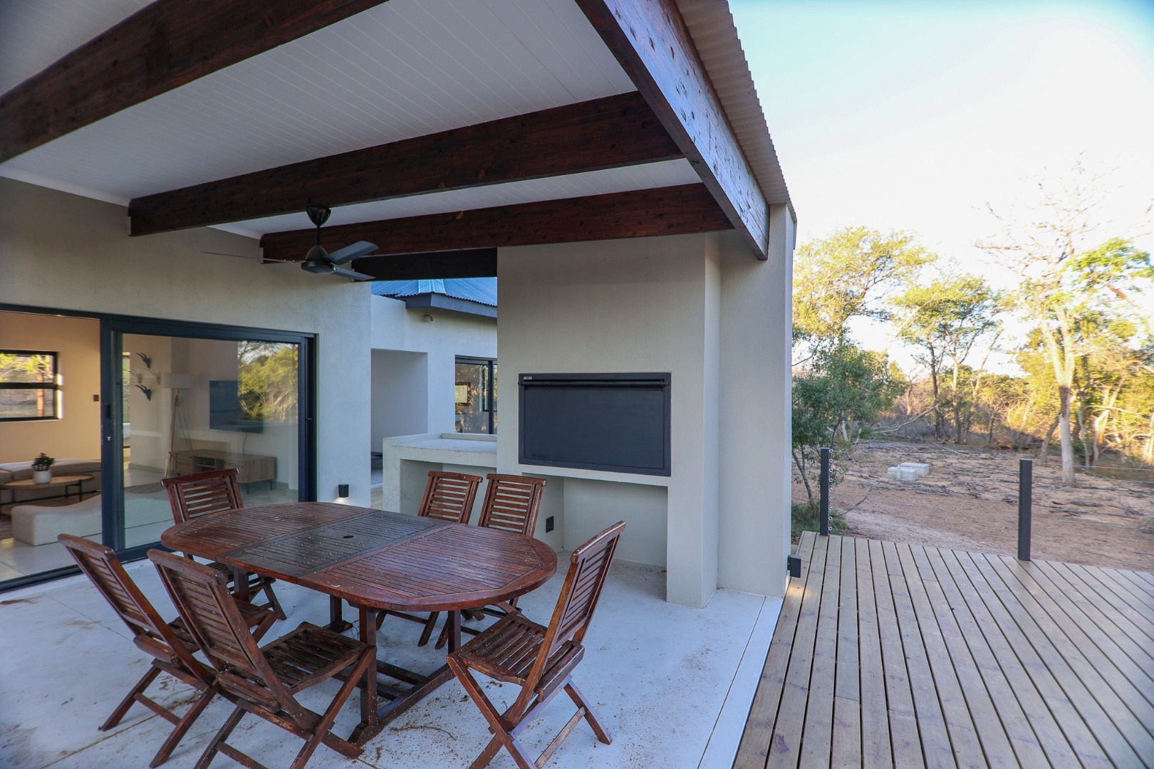 Discover an exceptional furnished rental opportunity within the prestigious Moditlo Nature Reserve, Hoedspruit. This modern 3-bedroom, 3.5-bathroom home offers a seamless blend of contemporary design and immersive bushveld living, ideal for those seeking a tranquil escape or a long-term nature-inspired lifestyle. The property boasts an expansive open-plan layout, featuring high vaulted ceilings with exposed trusses and large sliding doors that invite abundant natural light and connect effortlessly to the outdoors. The interior comprises a well-appointed kitchen, a dedicated dining room, a comfortable lounge, and an additional family TV room, all designed for spacious and functional living. Each of the three bedrooms benefits from an en-suite bathroom, ensuring privacy and convenience for all residents. The home is fully furnished, providing a ready-to-move-in experience with air conditioning for comfort in the African climate and a fireplace for cooler evenings. Step outside to embrace the quintessential bushveld lifestyle. The property features a generous patio, an expansive wooden deck, and a private swimming pool, perfect for relaxation and entertaining amidst the natural surroundings. A lapa further enhances the outdoor living experience, offering a shaded retreat. With 10,000 sqm of erf size, this eco-estate residence provides ample space and a scenic view, integrating seamlessly into the wildlife state environment. Security is paramount within this gated community and security estate, offering 24-hour security, a security post, access gates, electric fencing, and security gates for peace of mind. This property offers a unique opportunity to reside within a secure nature reserve, combining luxury with the untamed beauty of South Africa's Lowveld region, a renowned hub for wildlife and country living. Key Features: * Furnished 3-bedroom, 3.5-bathroom home * Open-plan living with vaulted ceilings * Private swimming pool, deck, and patio * Air conditioning and fireplace * Located in Moditlo Nature Reserve * Gated community with 24-hour security * Scenic bushveld views * 10,000 sqm erf size