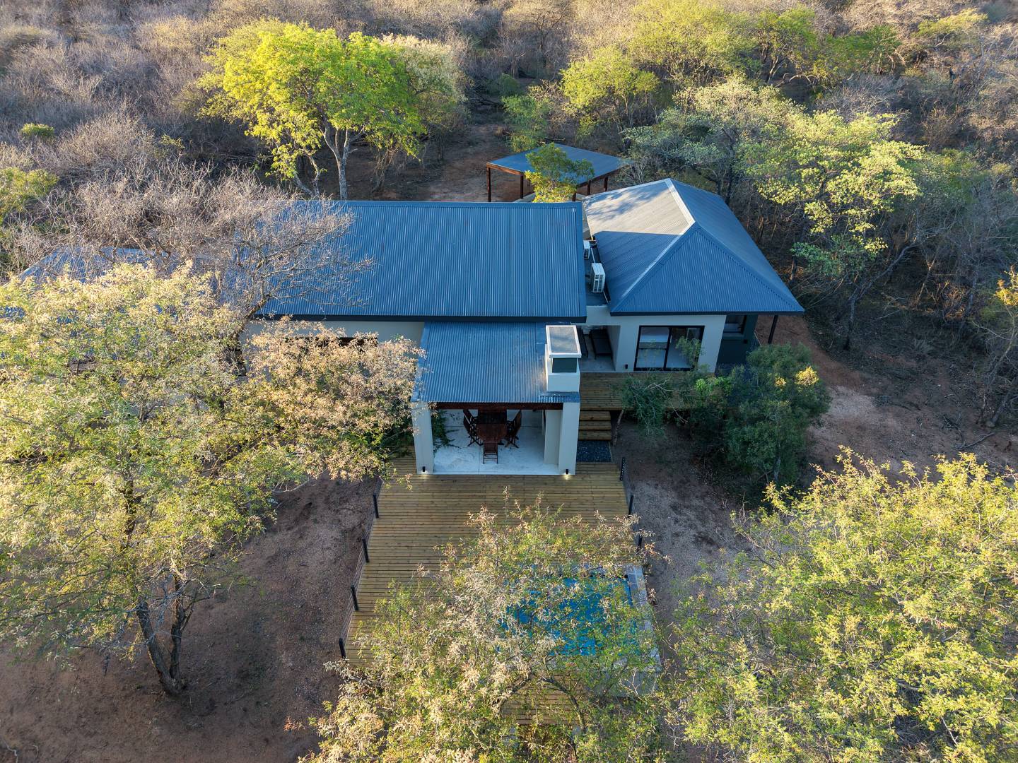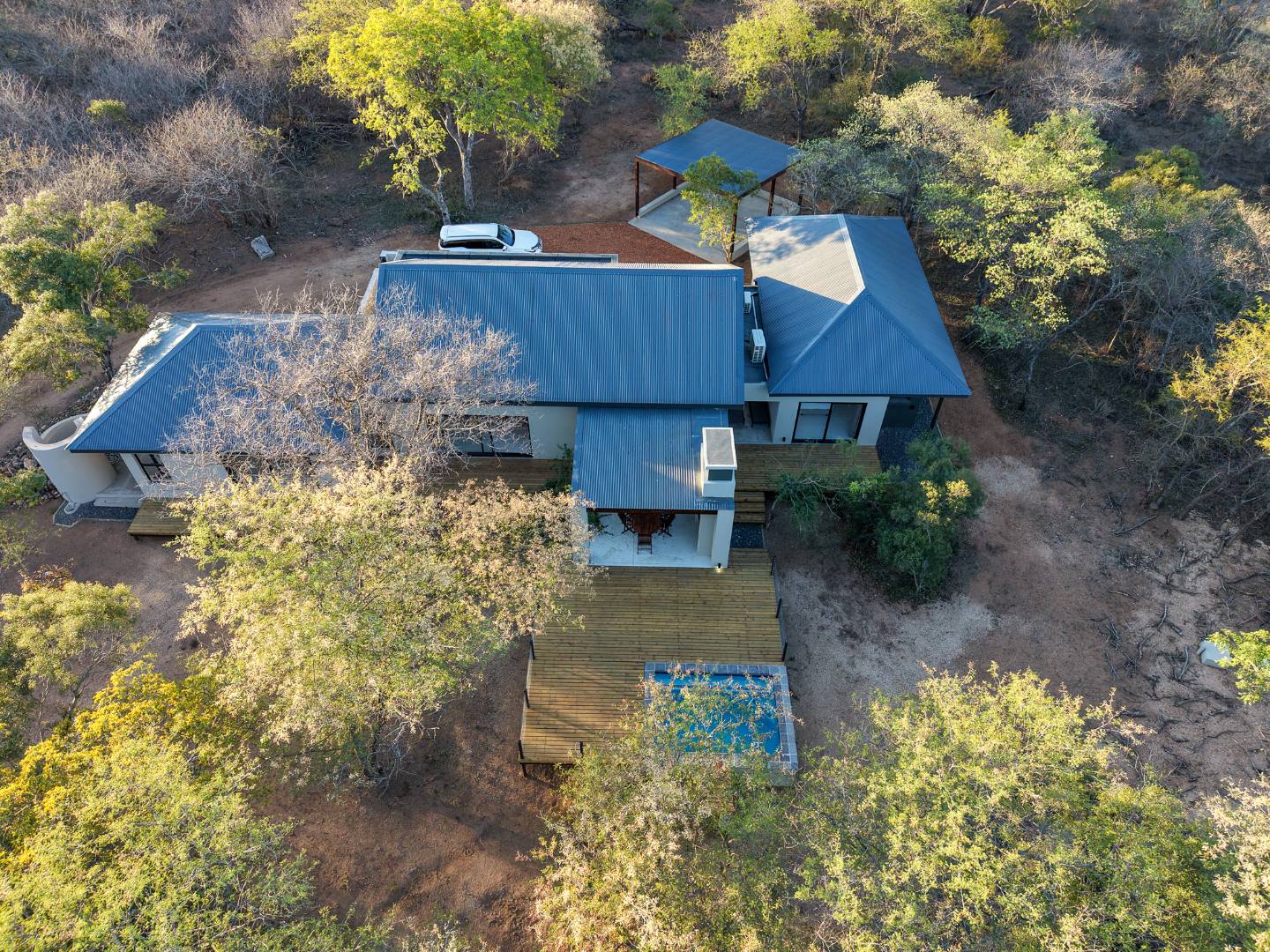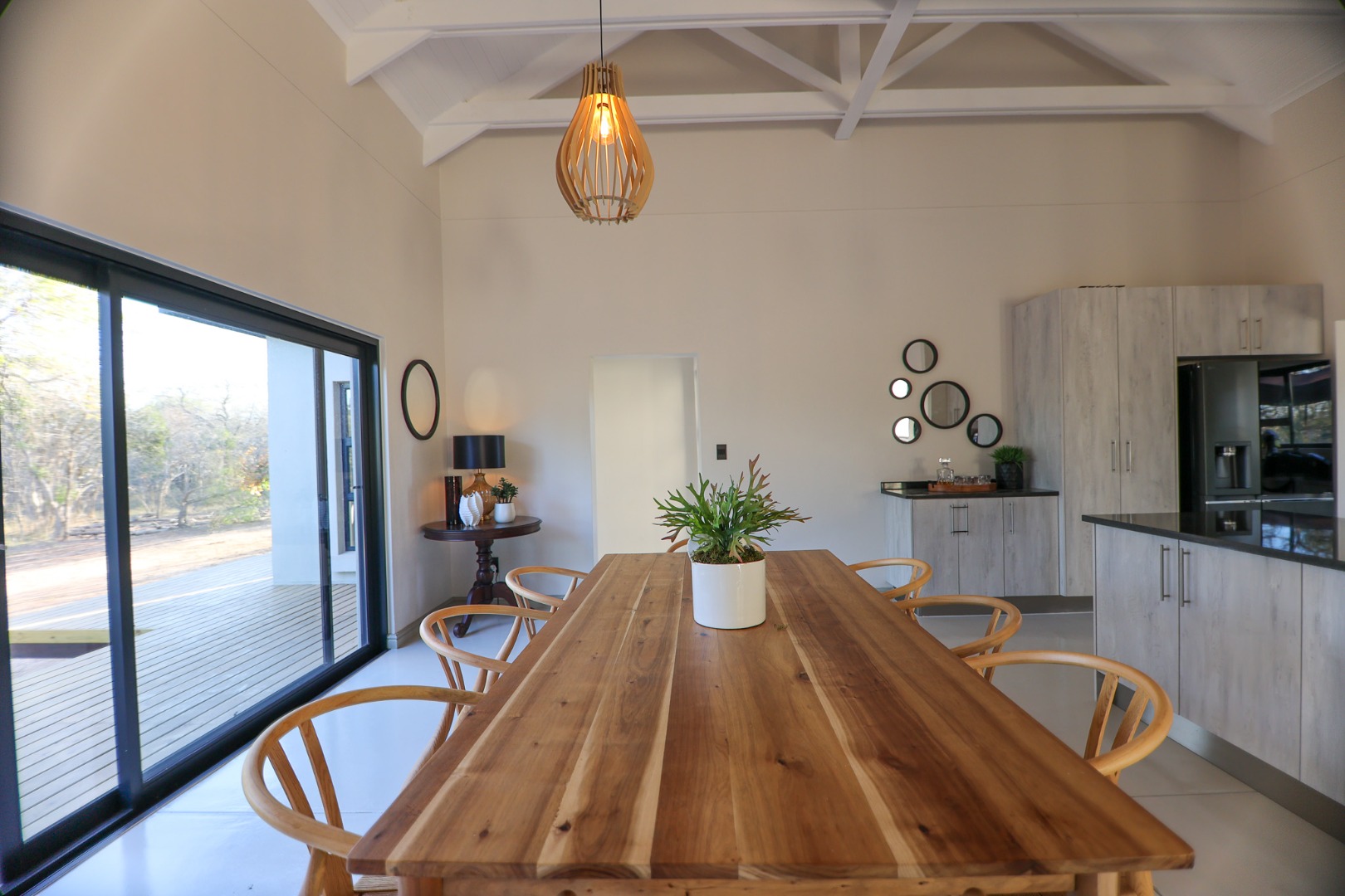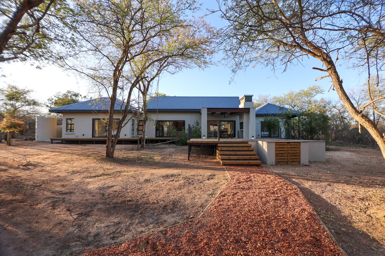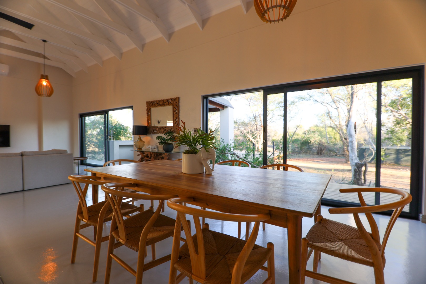 Discover an exceptional furnished rental opportunity within the prestigious Moditlo Nature Reserve, Hoedspruit. This modern 3-bedroom, 3.5-bathroom home offers a seamless blend of contemporary design and immersive bushveld living, ideal for those seeking a tranquil escape or a long-term nature-inspired lifestyle. The property boasts an expansive open-plan layout, featuring high vaulted ceilings with exposed trusses and large sliding doors that invite abundant natural light and connect effortlessly to the outdoors. The interior comprises a well-appointed kitchen, a dedicated dining room, a comfortable lounge, and an additional family TV room, all designed for spacious and functional living. Each of the three bedrooms benefits from an en-suite bathroom, ensuring privacy and convenience for all residents. The home is fully furnished, providing a ready-to-move-in experience with air conditioning for comfort in the African climate and a fireplace for cooler evenings. Step outside to embrace the quintessential bushveld lifestyle. The property features a generous patio, an expansive wooden deck, and a private swimming pool, perfect for relaxation and entertaining amidst the natural surroundings. A lapa further enhances the outdoor living experience, offering a shaded retreat. With 10,000 sqm of erf size, this eco-estate residence provides ample space and a scenic view, integrating seamlessly into the wildlife state environment. Security is paramount within this gated community and security estate, offering 24-hour security, a security post, access gates, electric fencing, and security gates for peace of mind. This property offers a unique opportunity to reside within a secure nature reserve, combining luxury with the untamed beauty of South Africa's Lowveld region, a renowned hub for wildlife and country living. Key Features: * Furnished 3-bedroom, 3.5-bathroom home * Open-plan living with vaulted ceilings * Private swimming pool, deck, and patio * Air conditioning and fireplace * Located in Moditlo Nature Reserve * Gated community with 24-hour security * Scenic bushveld views * 10,000 sqm erf size