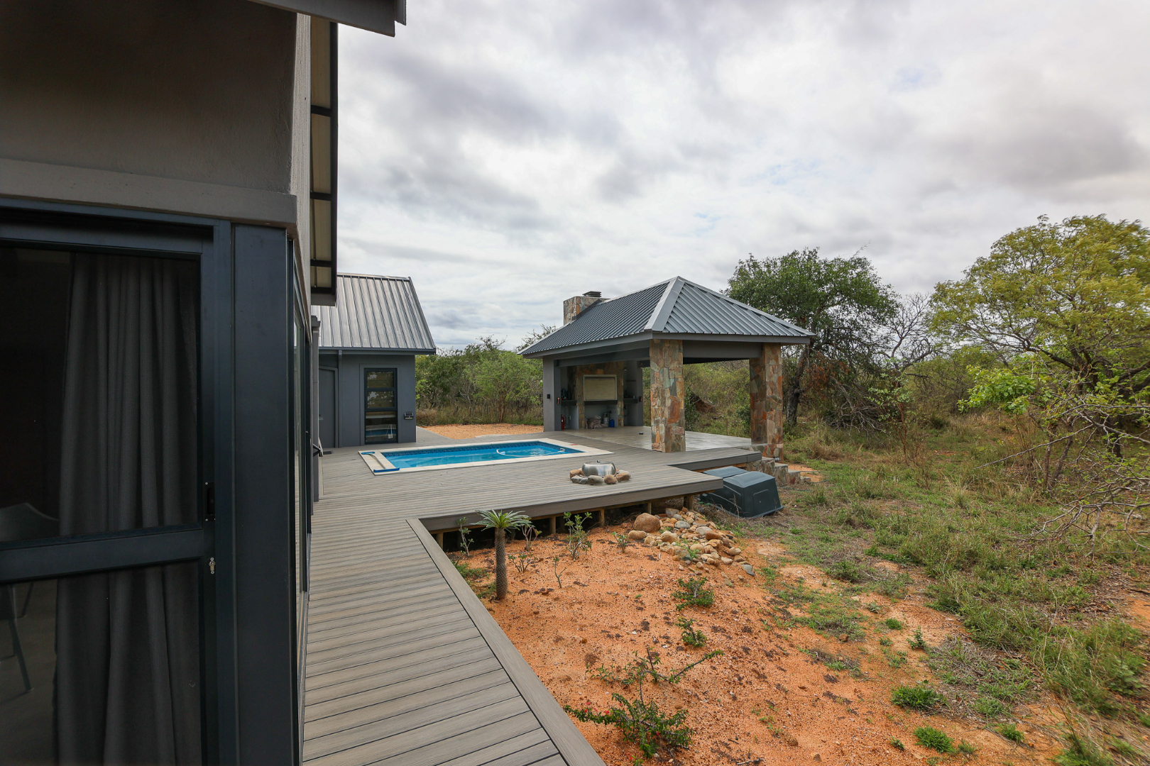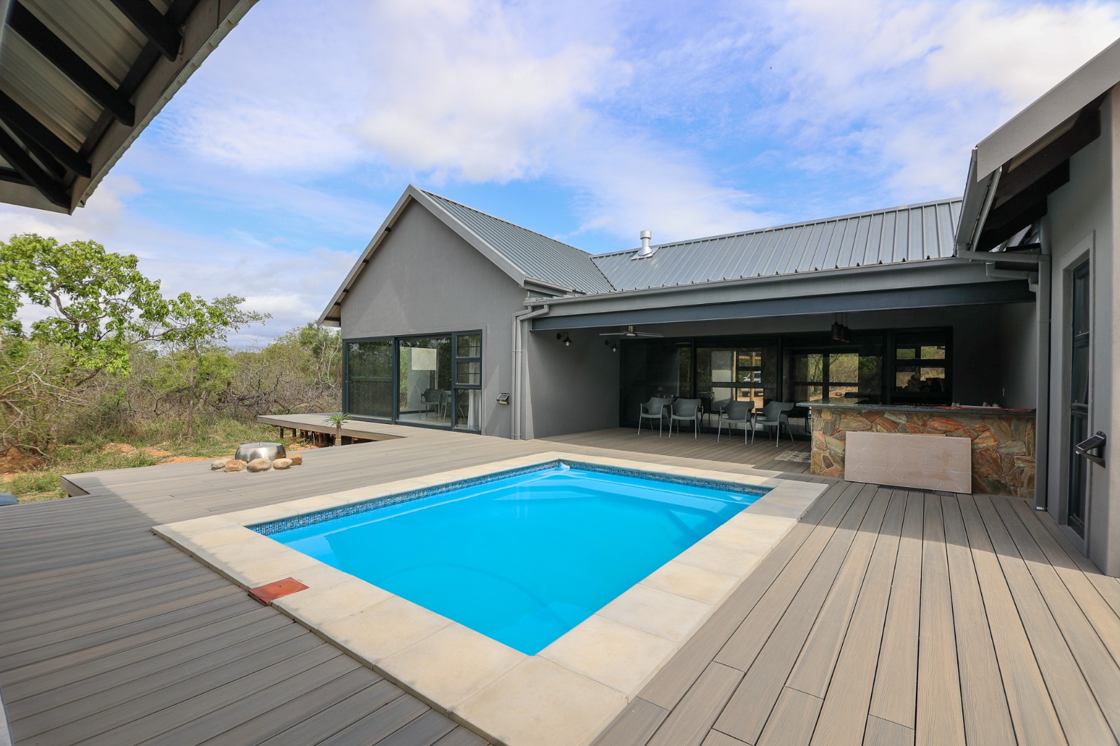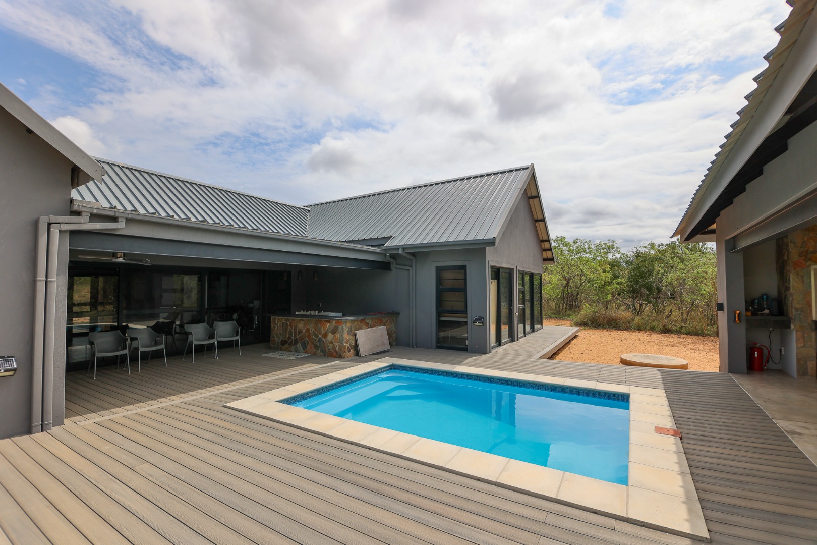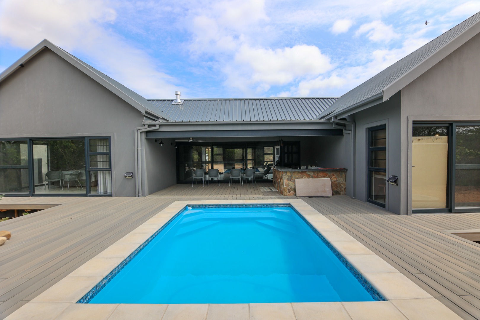 Step outside to a magnificent composite deck, featuring a private plunge pool and a covered lapa with a built-in braai and bar area, ideal for entertaining. An outdoor fire pit and patio further enhance the al fresco experience, all set within a private garden. Additional practicalities include a dedicated study, laundry facilities, and ample storage. The property is equipped with air conditioning for year-round comfort and a gas geyser for efficiency.
