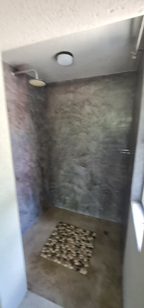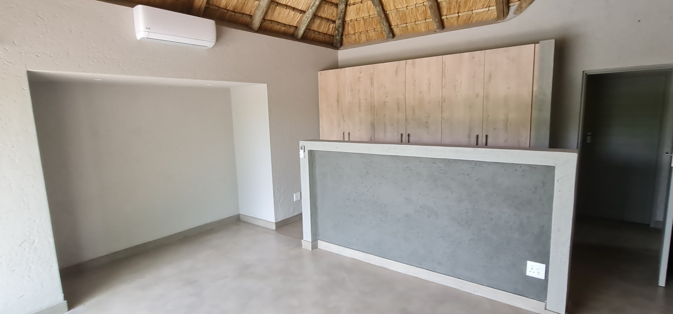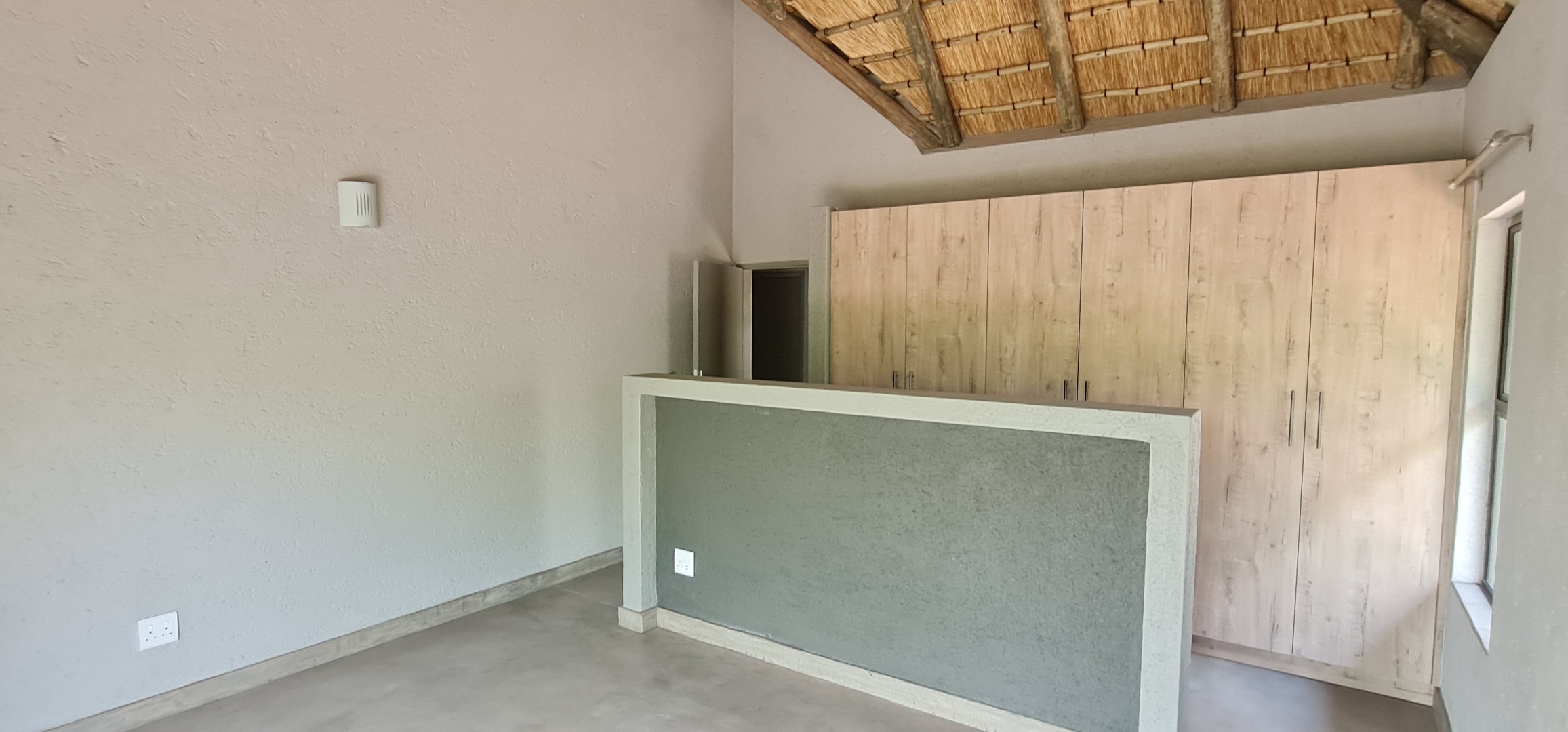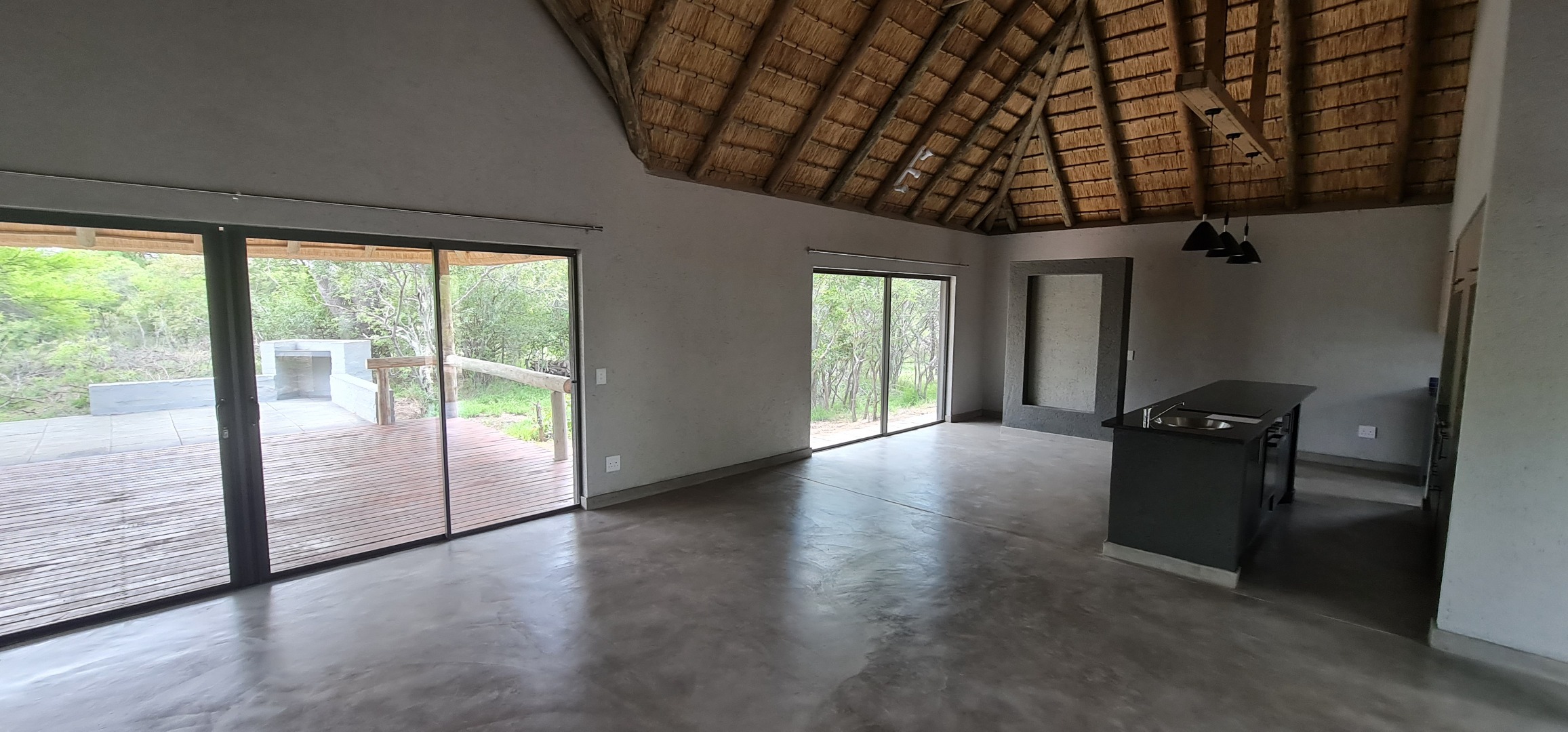 Discover this modern residential rental property nestled within the prestigious Moditlo Nature Reserve in Hoedspruit, South Africa. This distinctive home features a unique thatched roof and a contemporary dark grey exterior, blending seamlessly with its natural surroundings. Inside, the open-plan layout is enhanced by high vaulted ceilings and polished concrete flooring, creating a spacious and stylish ambiance. The property offers three comfortable bedrooms and two bathrooms, including one en-suite, ensuring privacy and convenience. The modern kitchen boasts new light wood and dark grey cabinetry, dark countertops, and a functional island with an integrated sink. Large sliding glass doors throughout the living areas invite abundant natural light and provide seamless indoor-outdoor flow.