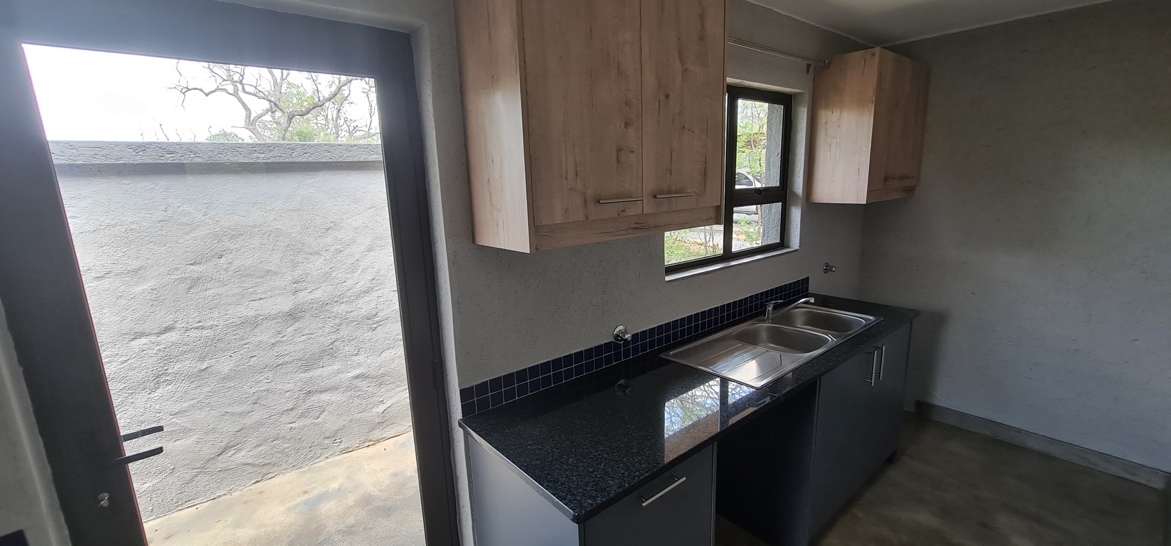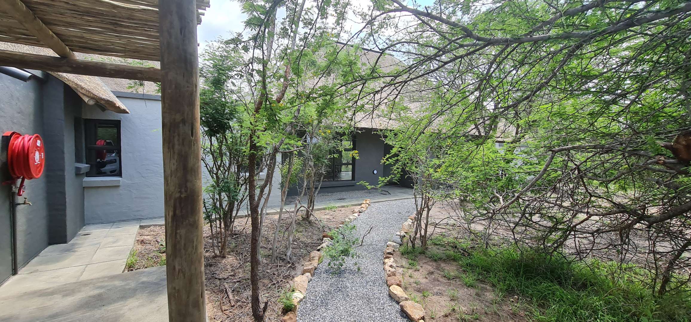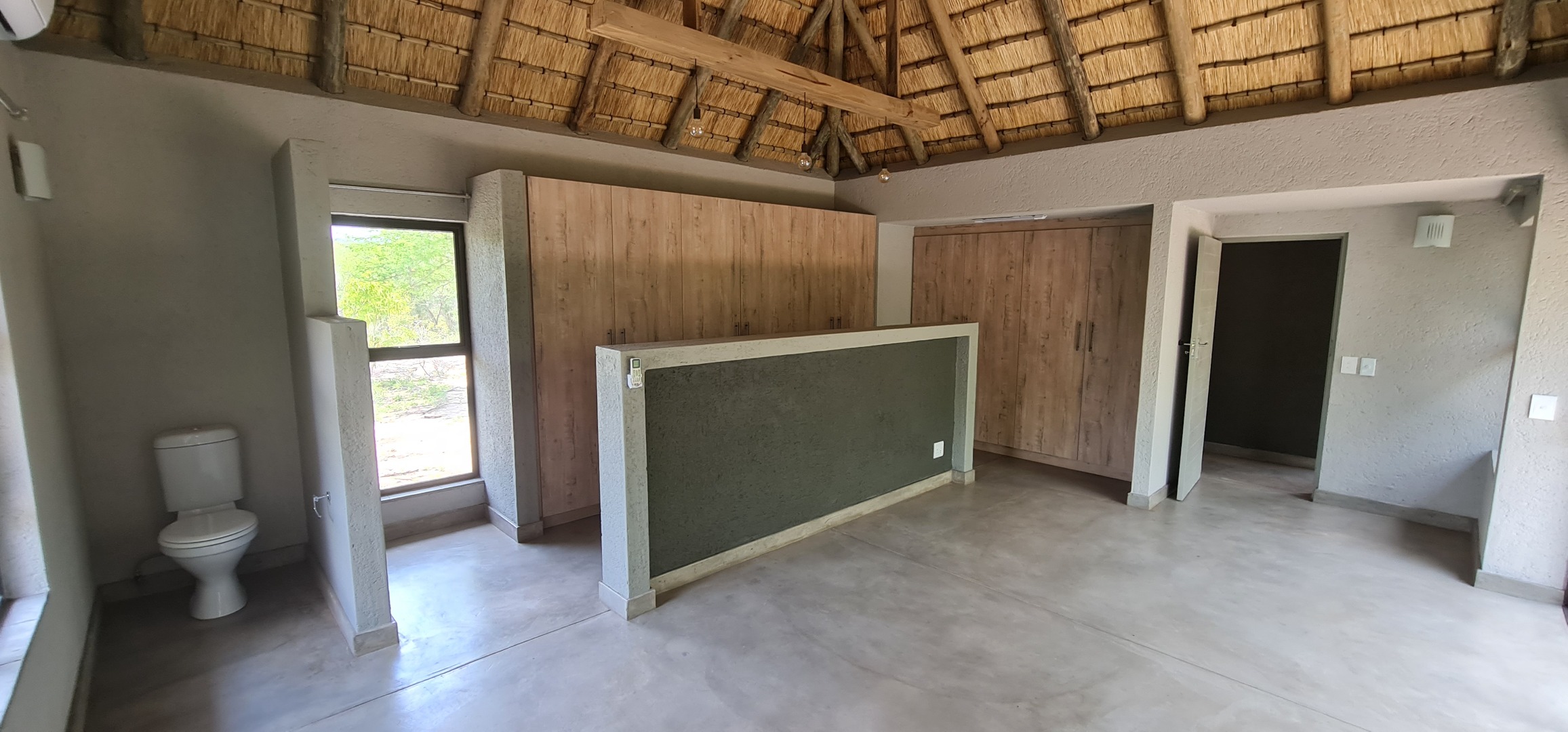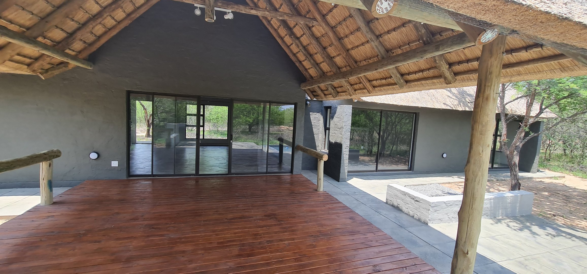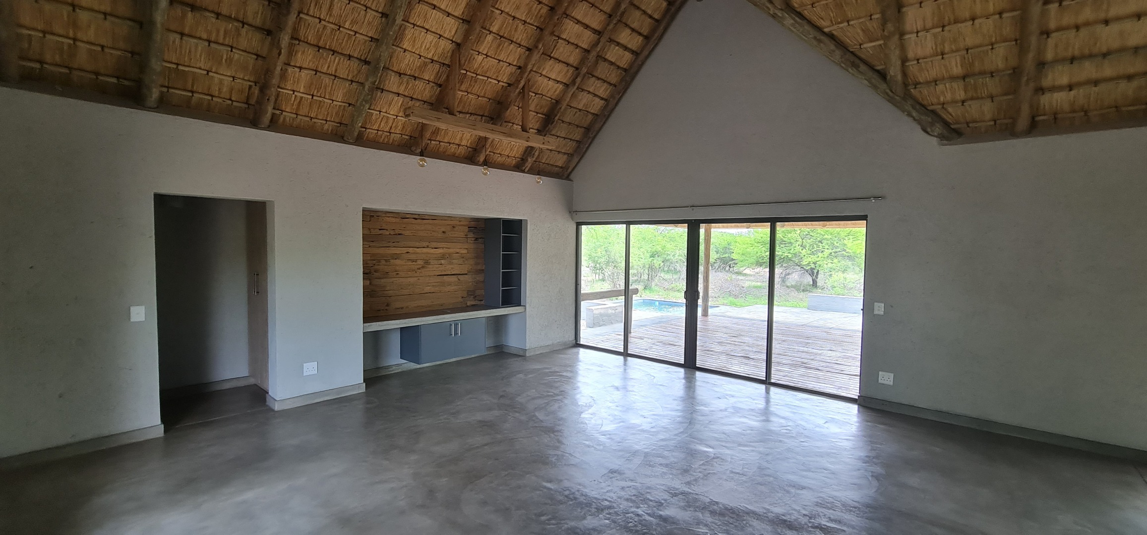 Discover this modern residential rental property nestled within the prestigious Moditlo Nature Reserve in Hoedspruit, South Africa. This distinctive home features a unique thatched roof and a contemporary dark grey exterior, blending seamlessly with its natural surroundings. Inside, the open-plan layout is enhanced by high vaulted ceilings and polished concrete flooring, creating a spacious and stylish ambiance. The property offers three comfortable bedrooms and two bathrooms, including one en-suite, ensuring privacy and convenience. The modern kitchen boasts new light wood and dark grey cabinetry, dark countertops, and a functional island with an integrated sink. Large sliding glass doors throughout the living areas invite abundant natural light and provide seamless indoor-outdoor flow.