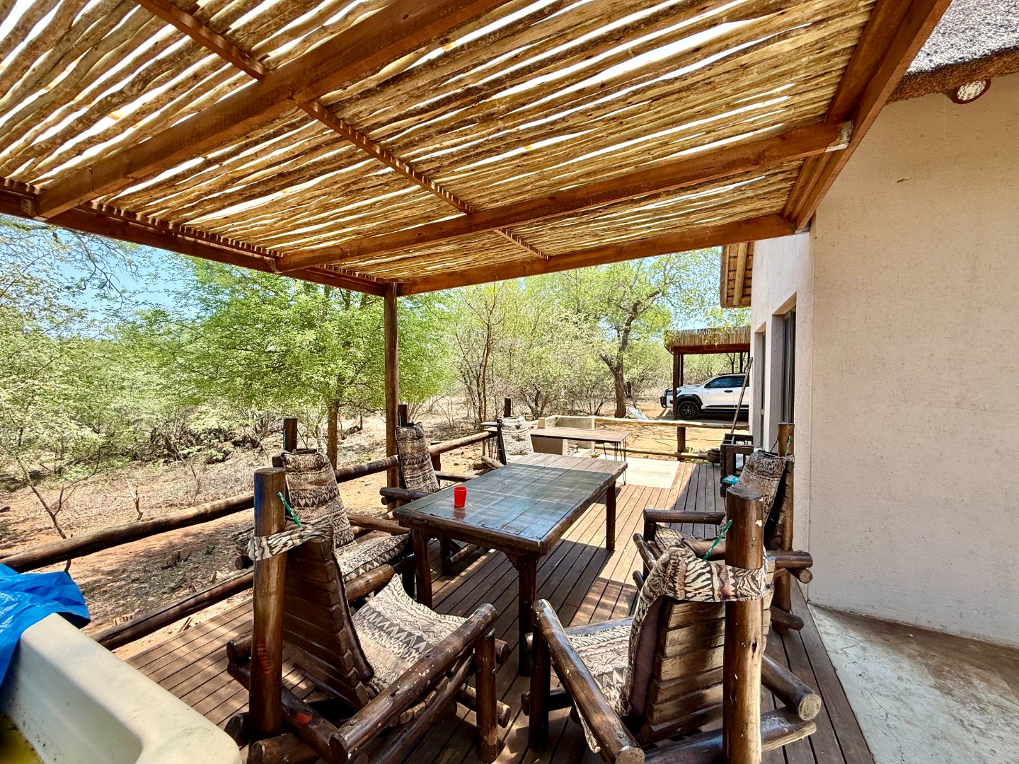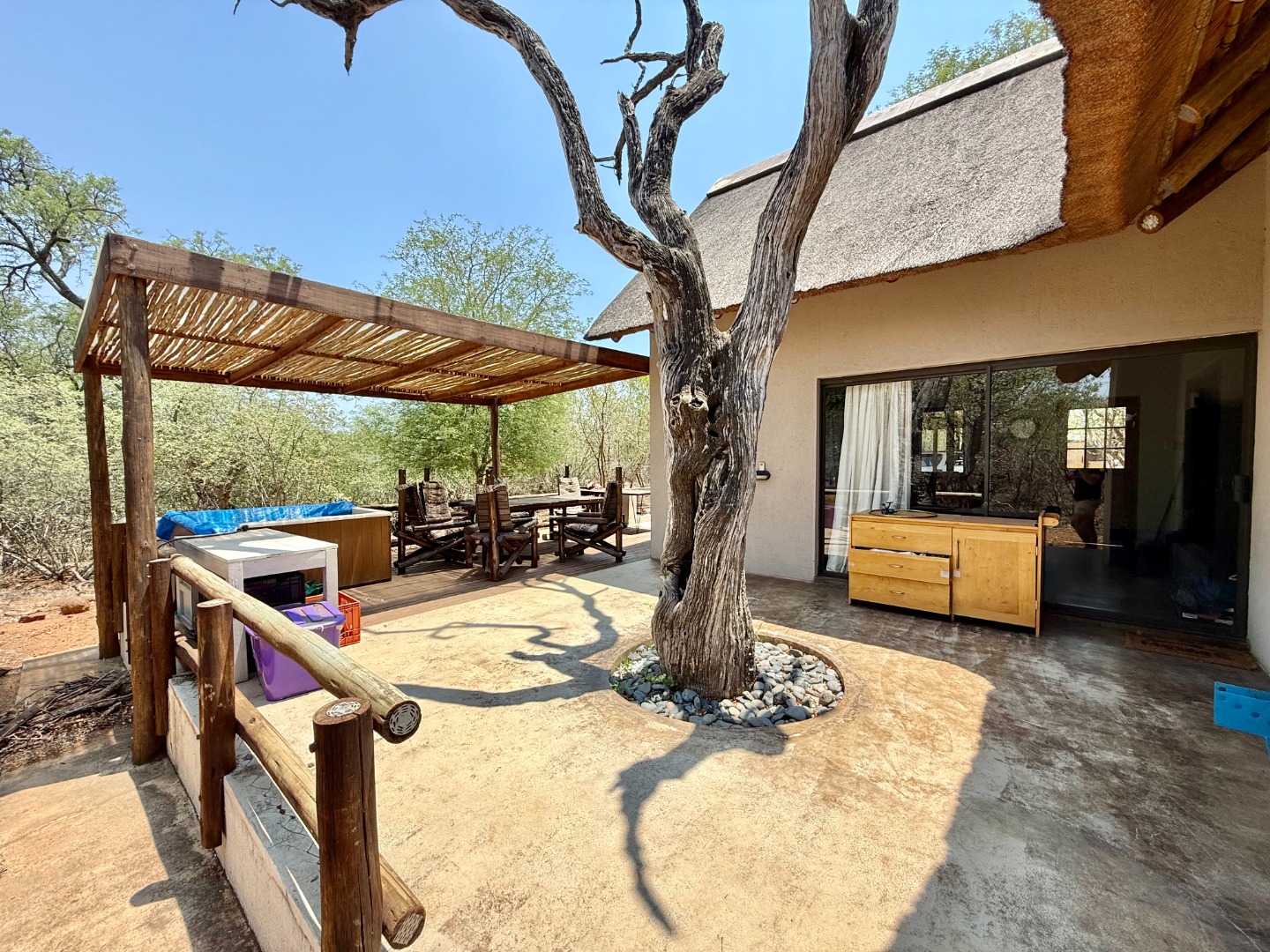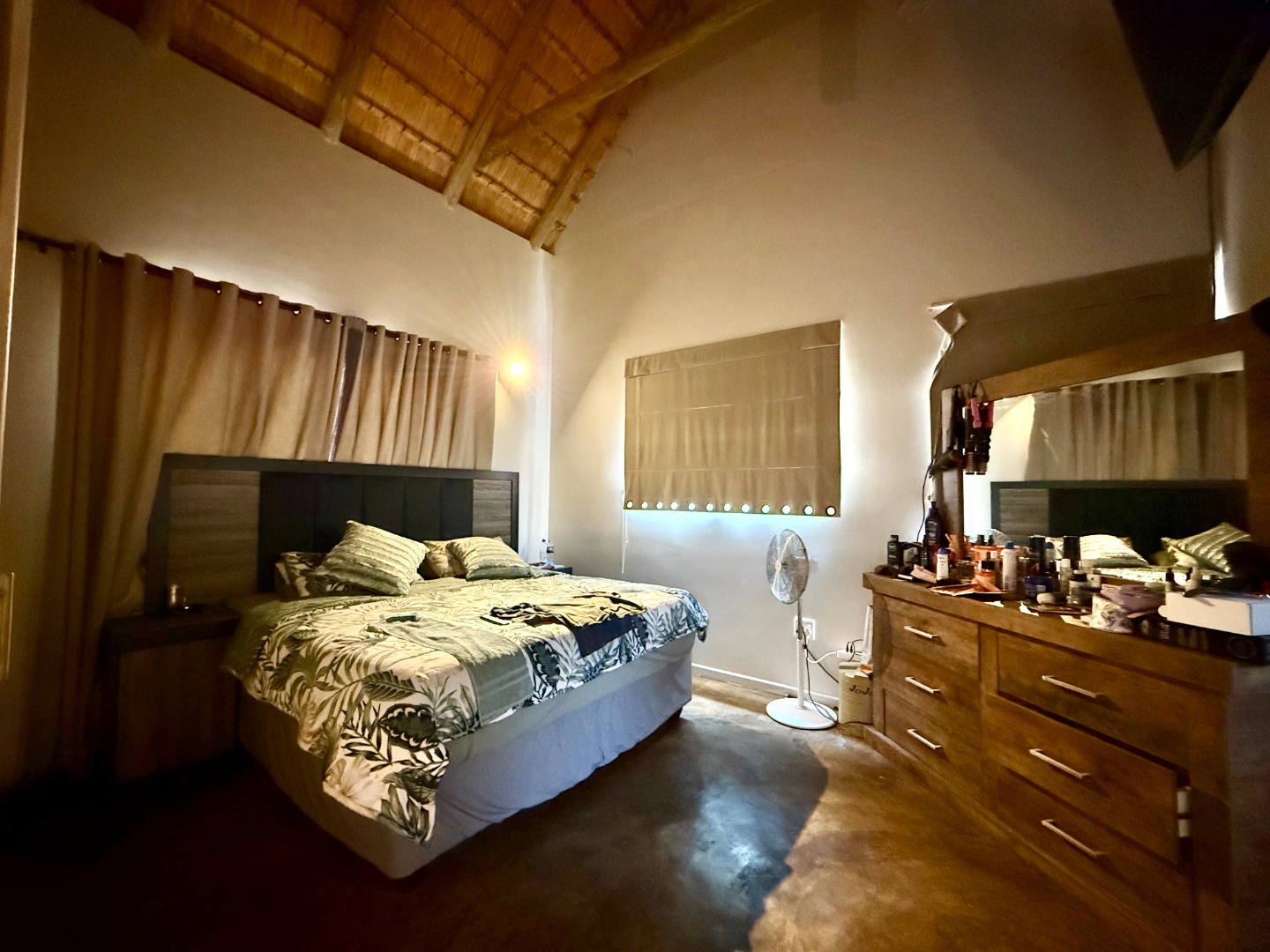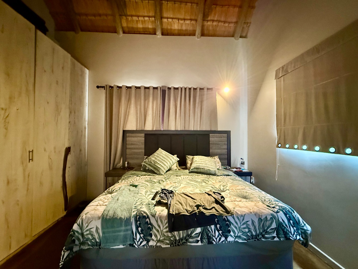 Discover an exceptional rental opportunity within the prestigious Raptors View Wildlife Estate in Hoedspruit, South Africa. This charming 3-bedroom, 2-bathroom home offers a unique bushveld living experience, blending rustic elegance with modern comfort. The residence features a spacious open-plan layout, seamlessly connecting the lounge, dining area, and a well-appointed kitchen with a pantry. Striking vaulted thatched ceilings and pressed ceilings add character, while sliding doors invite natural light and scenic views. One bathroom is en-suite, providing privacy.