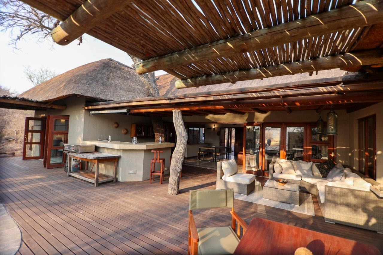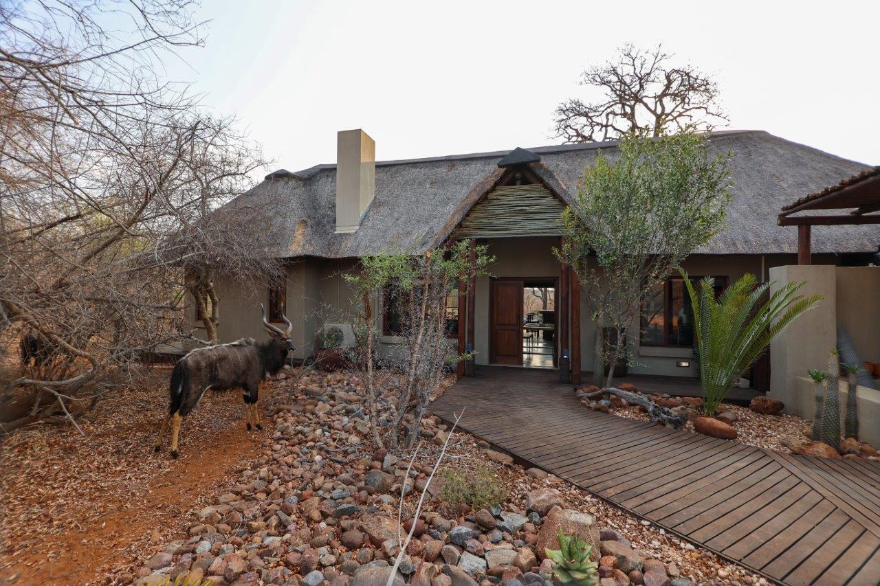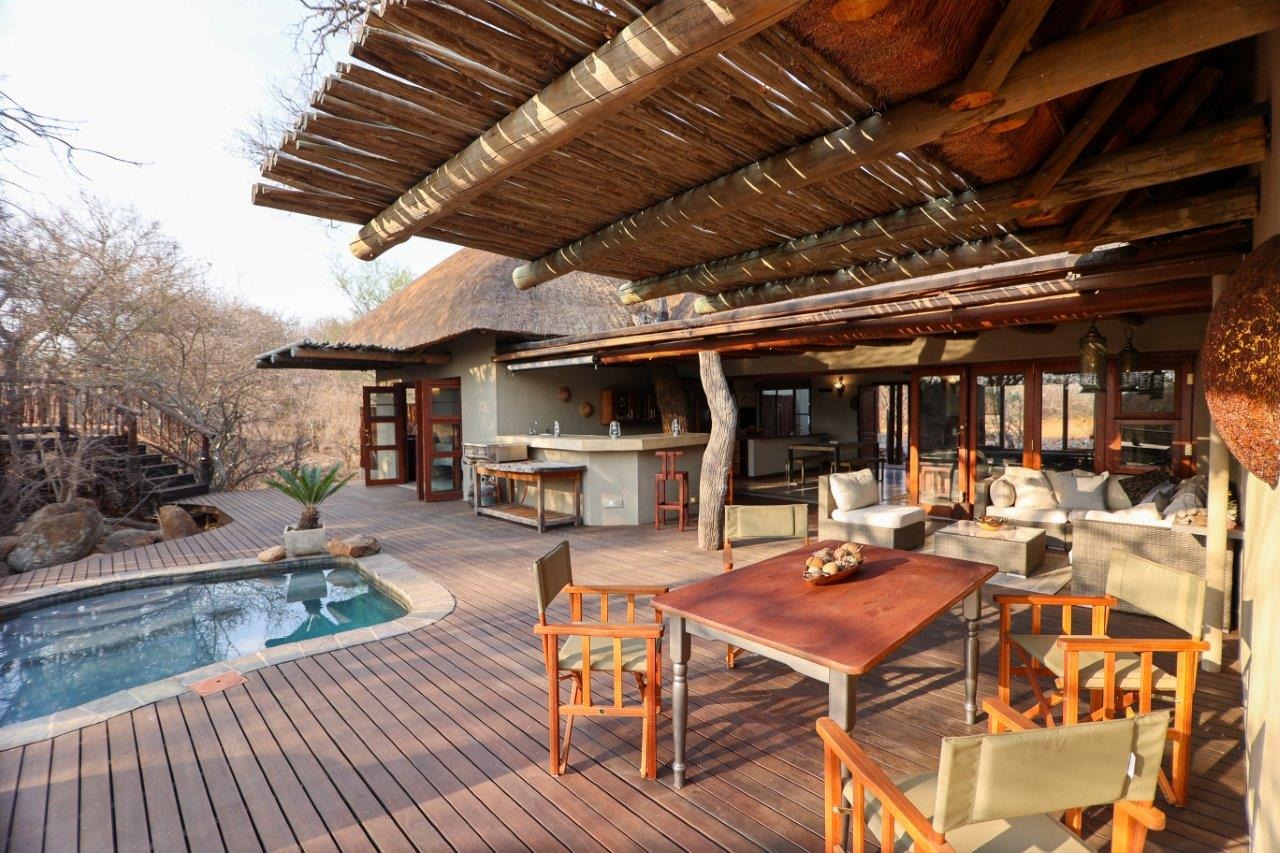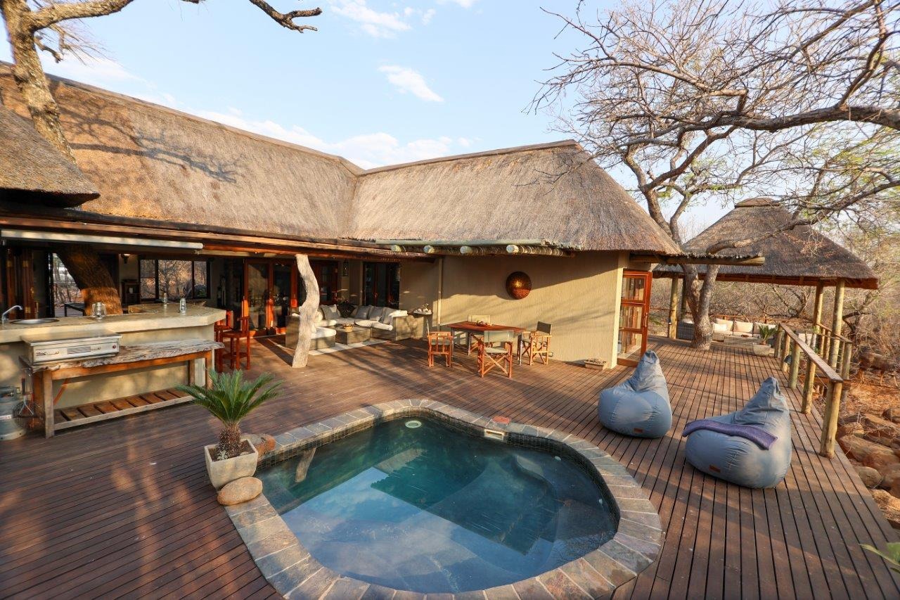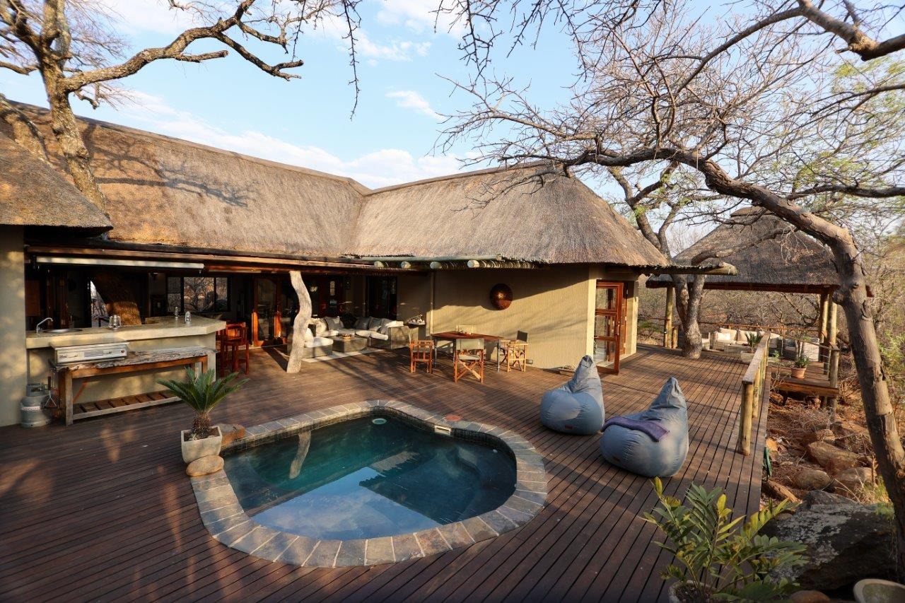 The outside entertainment area is a serene oasis, with two outdoor lounges, sparkling pool, built-in bar and braai, and a raised boma area offering a magnificent mountain view, perfect for evening gatherings watching the sun go down. The house itself is meticulously maintained, with modern fittings and comfortable, air conditioned, living spaces. It is fully furnished, including TV, oven/hob, fridge freezer, washing machine, dish washer etc, with bedding and towels included, and is also equipped with battery power backup. There are three double bedrooms, with their own en-suite bathrooms, each with bifold doors opening up onto the bushveld, with two luxurious outdoor showers completing the immersive experience and providing that unique connection to nature.