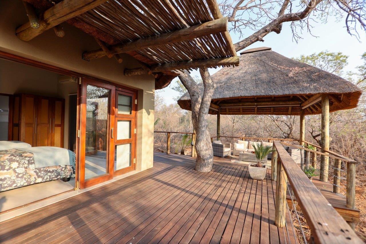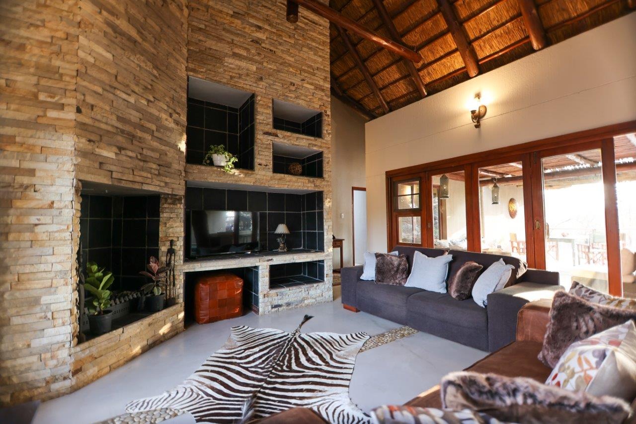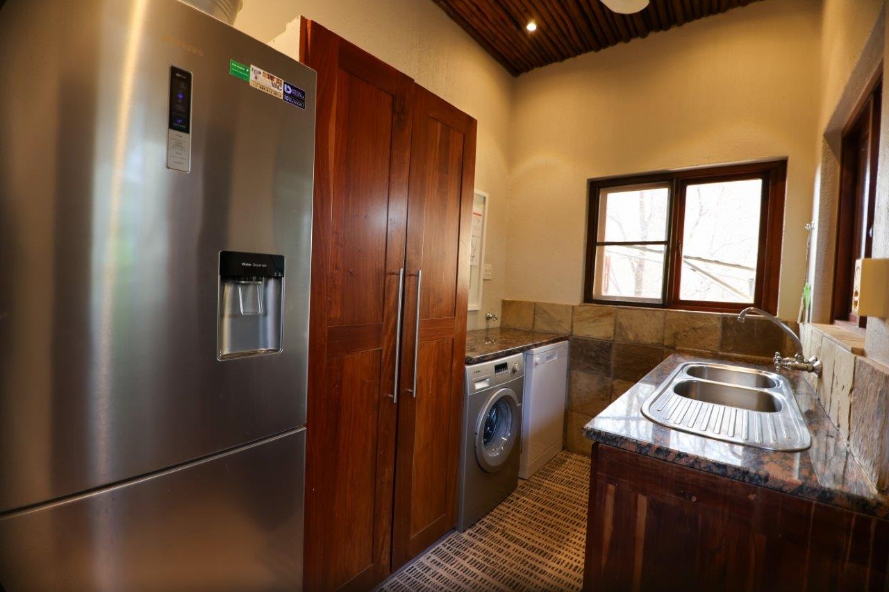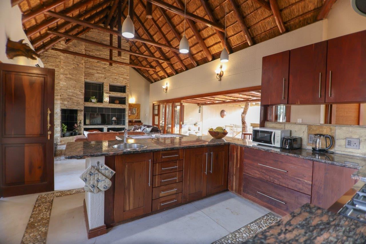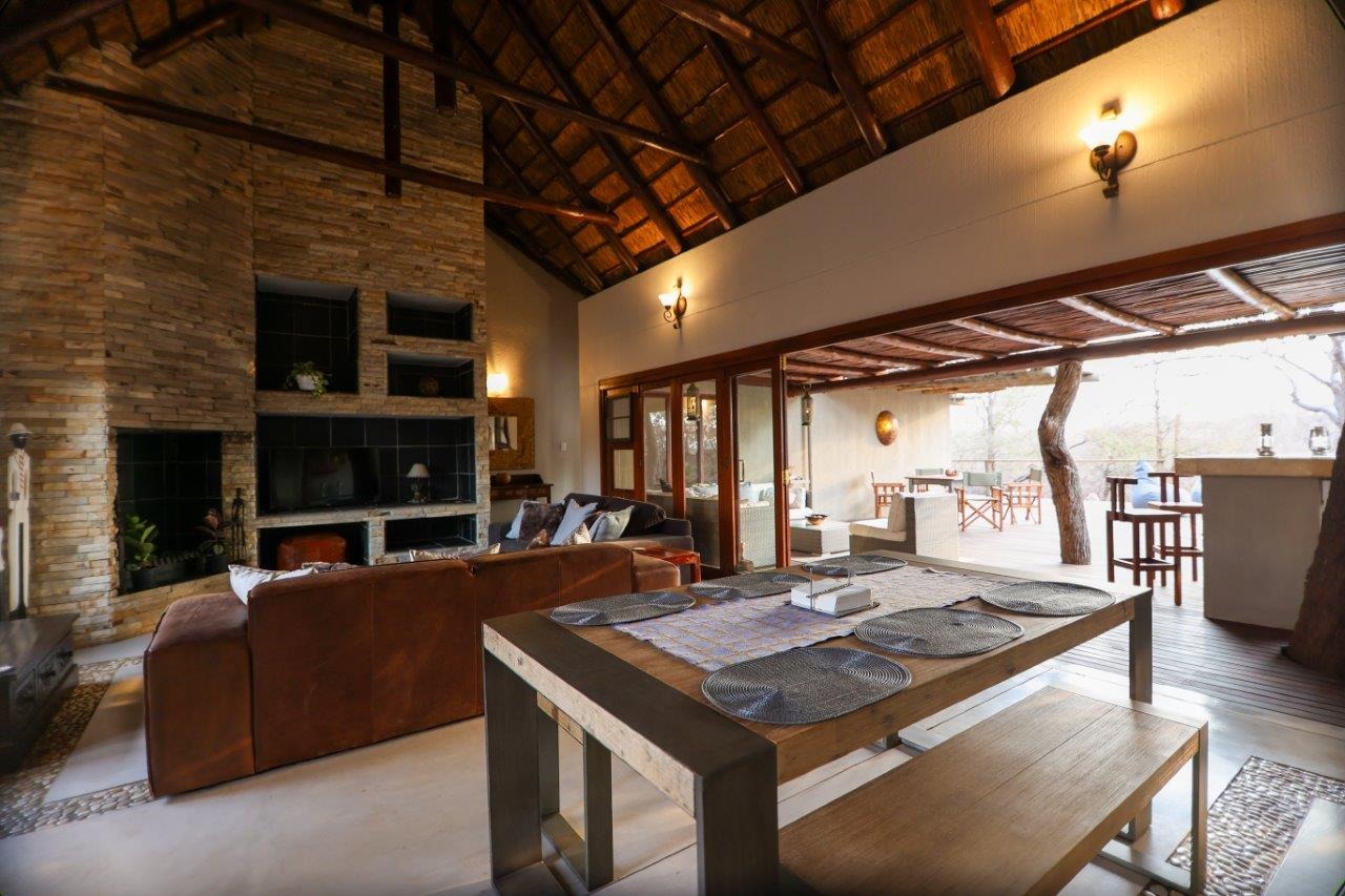 The outside entertainment area is a serene oasis, with two outdoor lounges, sparkling pool, built-in bar and braai, and a raised boma area offering a magnificent mountain view, perfect for evening gatherings watching the sun go down. The house itself is meticulously maintained, with modern fittings and comfortable, air conditioned, living spaces. It is fully furnished, including TV, oven/hob, fridge freezer, washing machine, dish washer etc, with bedding and towels included, and is also equipped with battery power backup. There are three double bedrooms, with their own en-suite bathrooms, each with bifold doors opening up onto the bushveld, with two luxurious outdoor showers completing the immersive experience and providing that unique connection to nature.