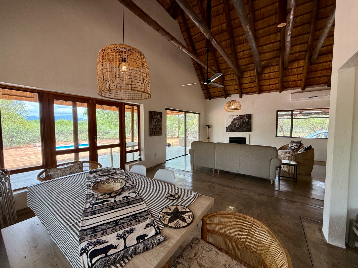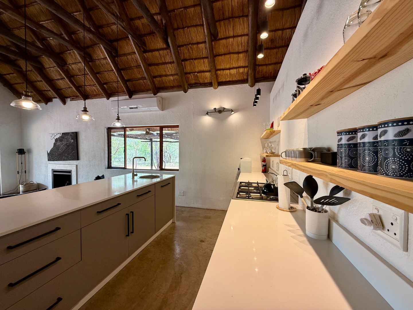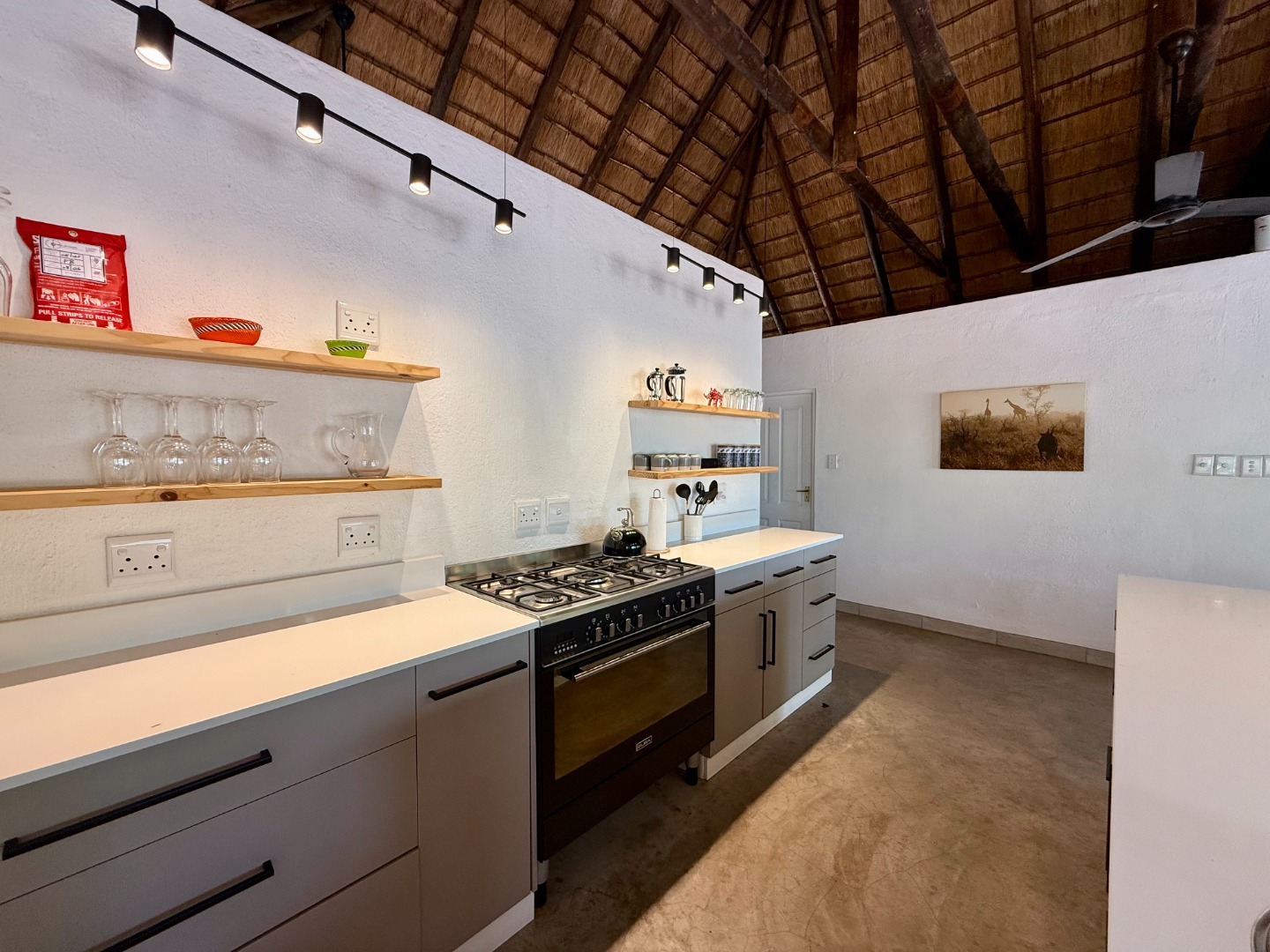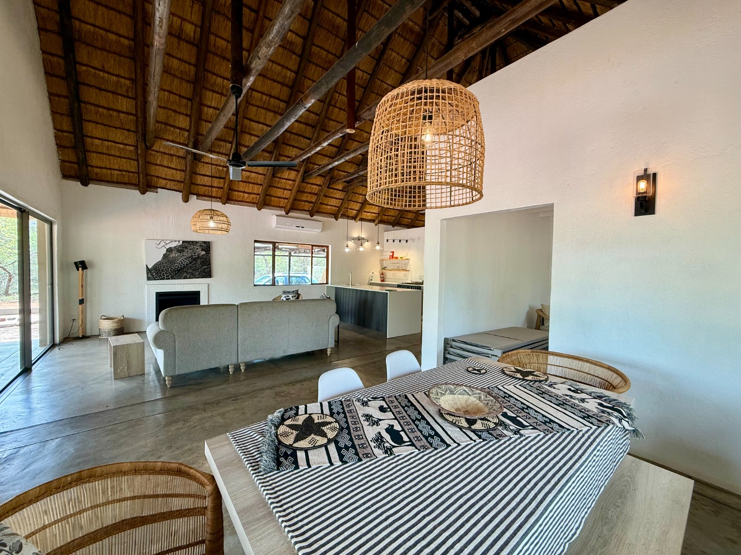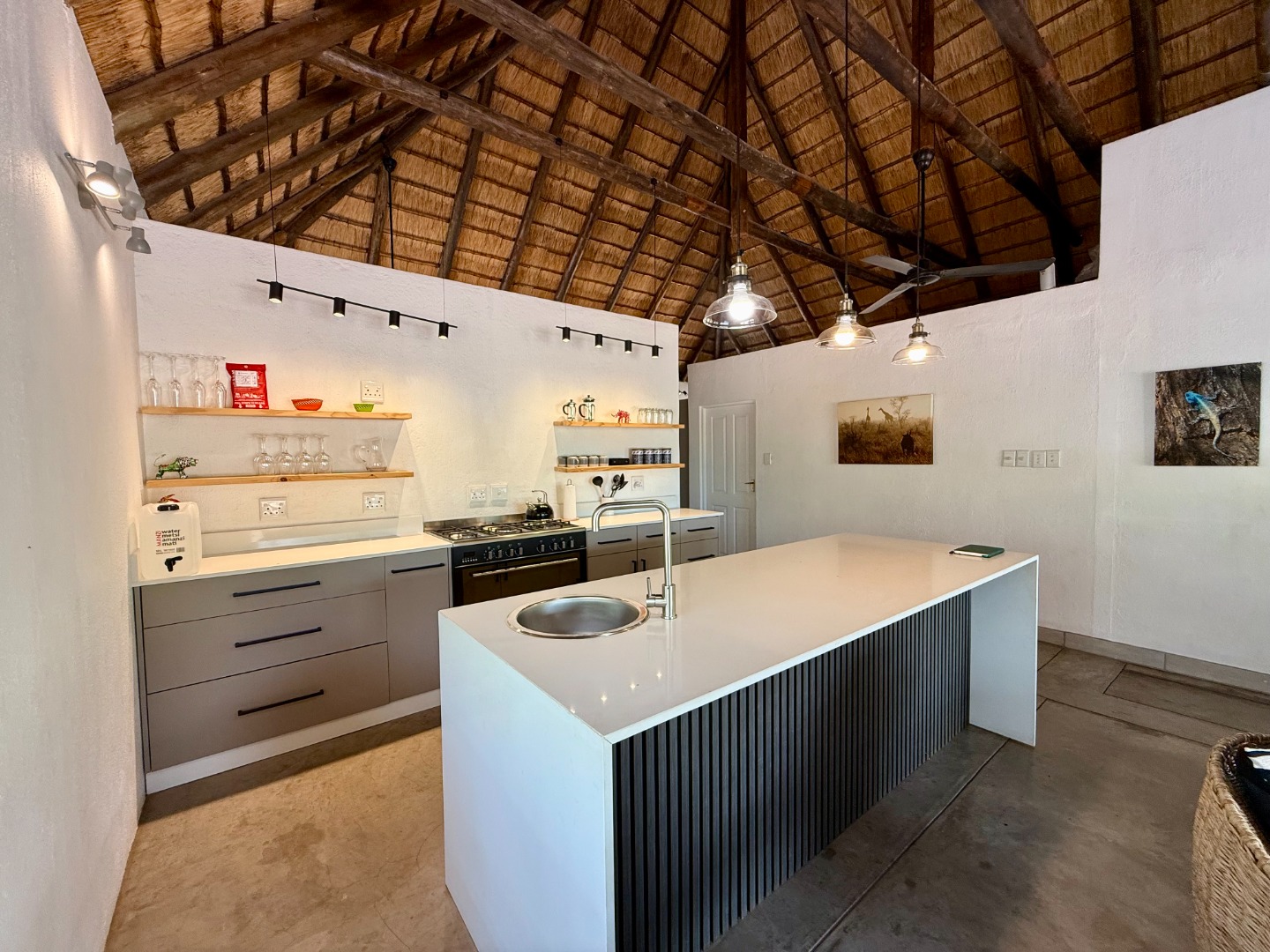 Discover an exceptional rental opportunity within the prestigious Raptors View Wildlife Estate in Hoedspruit. This fully furnished property offers four spacious bedrooms and two and a half bathrooms, including a convenient guest toilet and one en-suite. The interior boasts a contemporary open-plan design, seamlessly integrating the lounge, dining area, and a modern kitchen. Characterised by a striking vaulted thatched roof with exposed wooden beams and polished concrete floors, the home exudes a unique rustic-modern aesthetic. The kitchen is well-appointed with sleek cabinetry, a large island featuring an integrated sink, a gas hob, and a dedicated pantry.