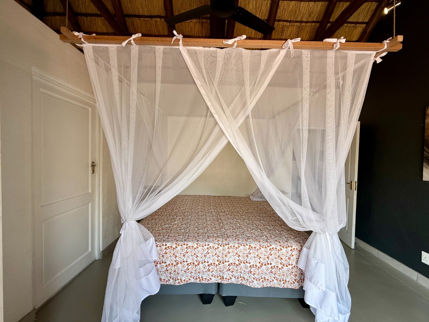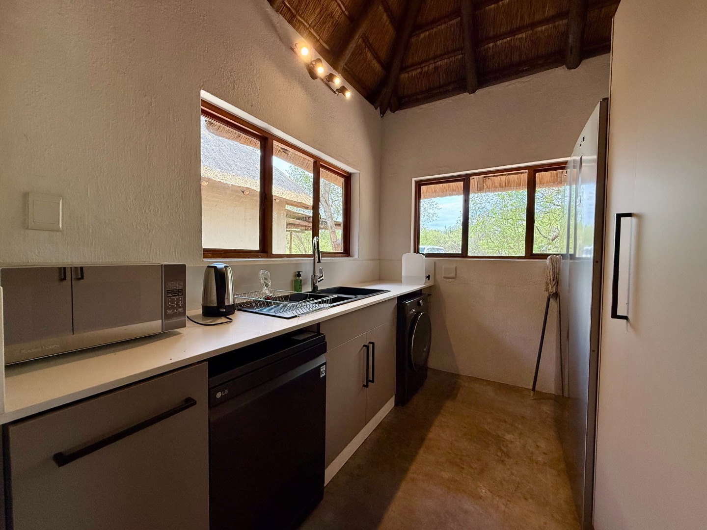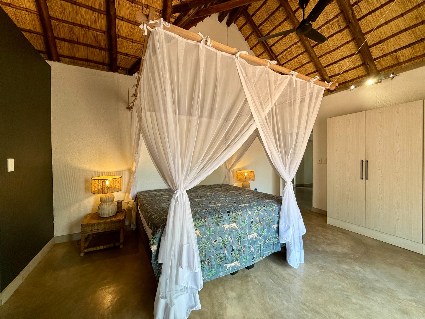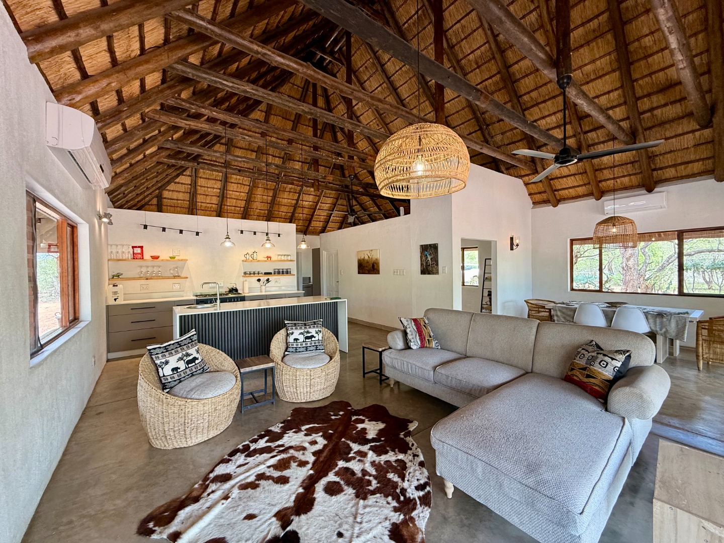 Discover an exceptional rental opportunity within the prestigious Raptors View Wildlife Estate in Hoedspruit. This fully furnished property offers four spacious bedrooms and two and a half bathrooms, including a convenient guest toilet and one en-suite. The interior boasts a contemporary open-plan design, seamlessly integrating the lounge, dining area, and a modern kitchen. Characterised by a striking vaulted thatched roof with exposed wooden beams and polished concrete floors, the home exudes a unique rustic-modern aesthetic. The kitchen is well-appointed with sleek cabinetry, a large island featuring an integrated sink, a gas hob, and a dedicated pantry.