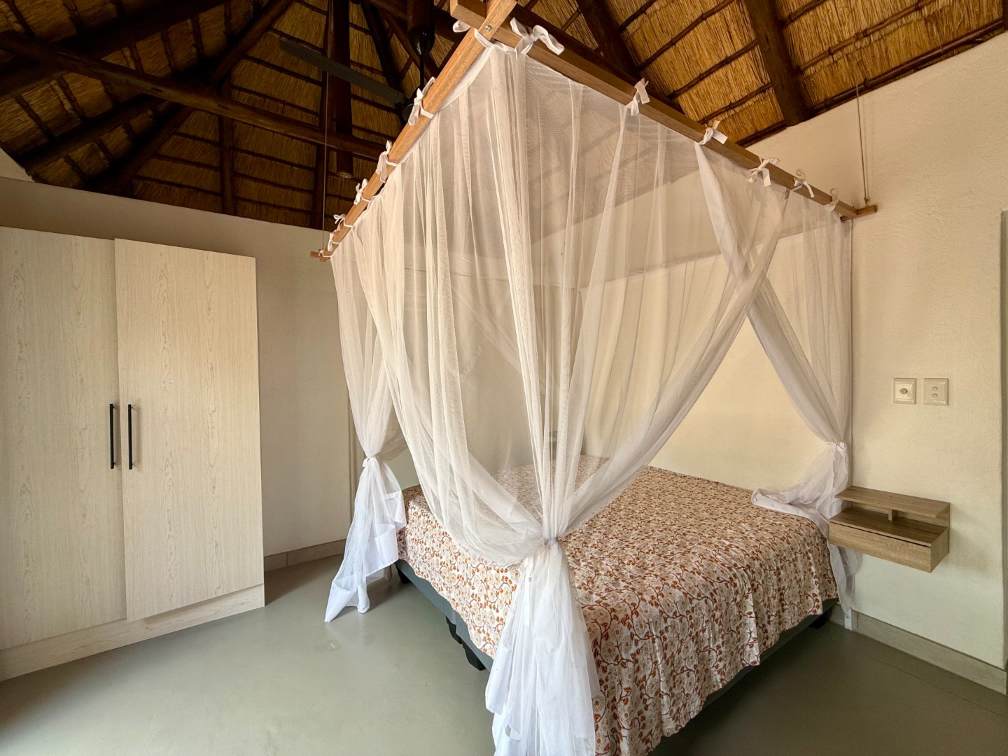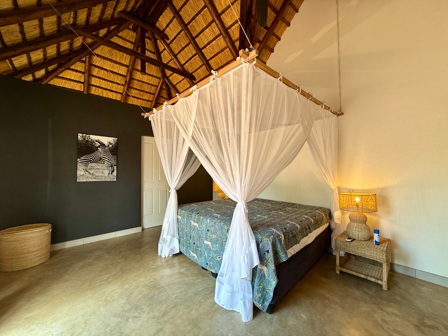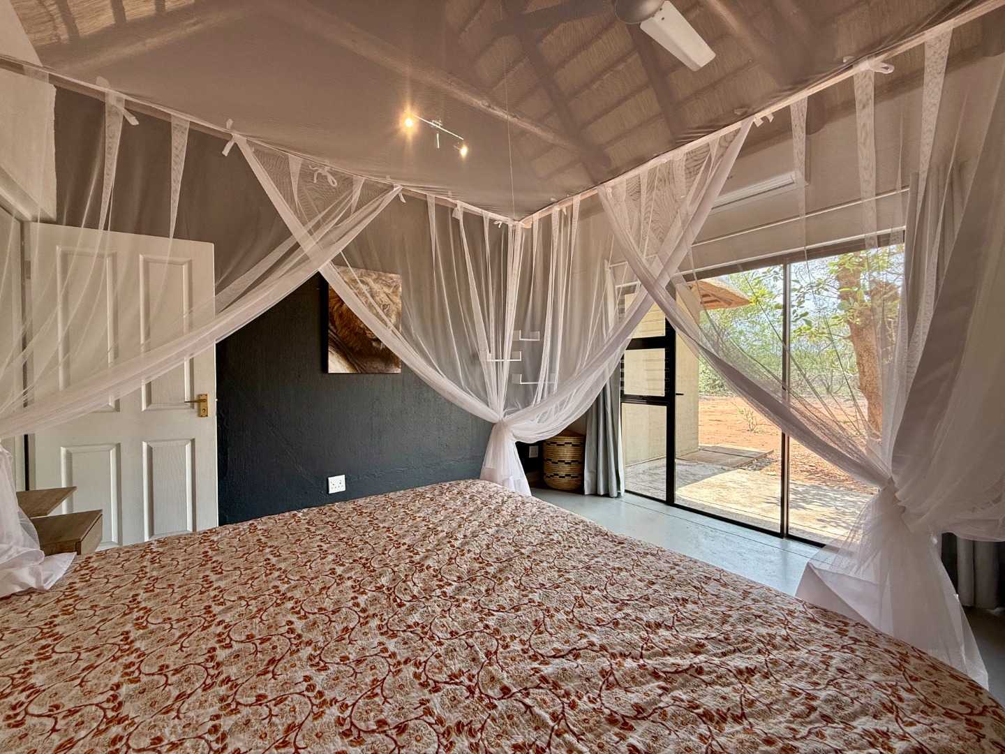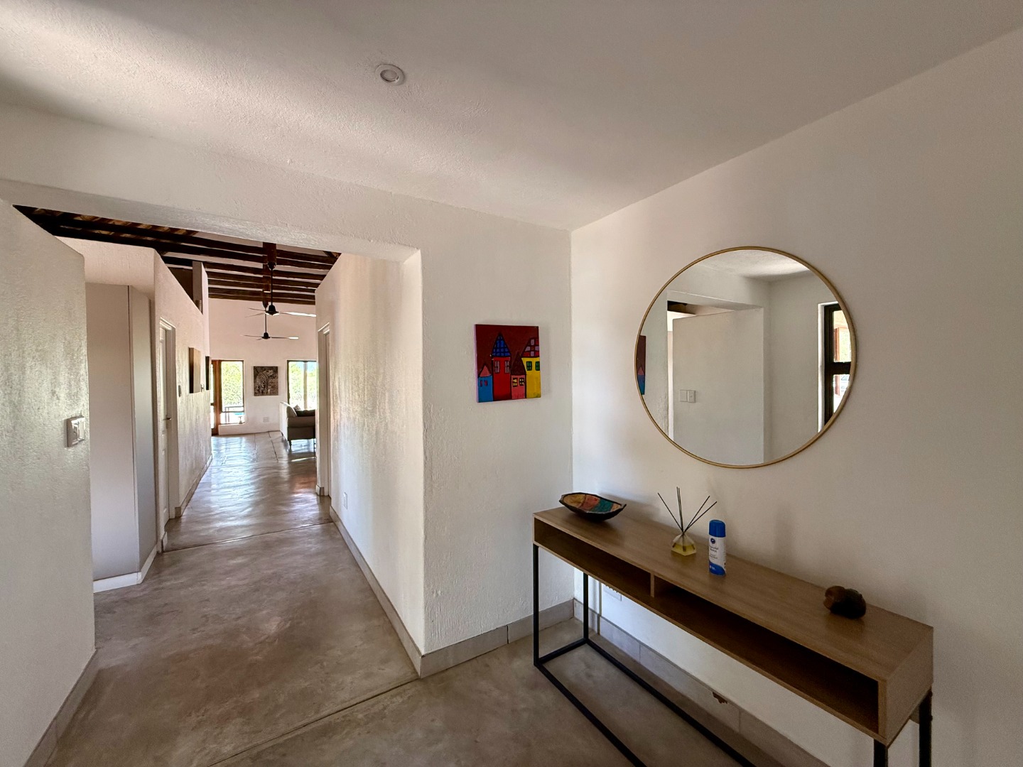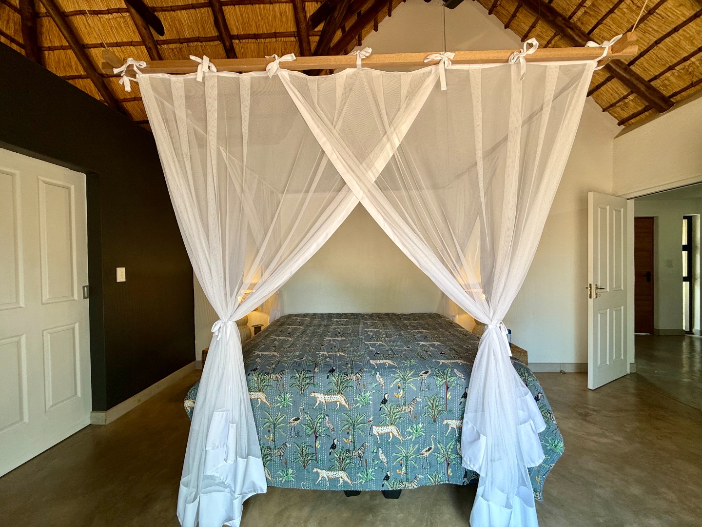 Discover an exceptional rental opportunity within the prestigious Raptors View Wildlife Estate in Hoedspruit. This fully furnished property offers four spacious bedrooms and two and a half bathrooms, including a convenient guest toilet and one en-suite. The interior boasts a contemporary open-plan design, seamlessly integrating the lounge, dining area, and a modern kitchen. Characterised by a striking vaulted thatched roof with exposed wooden beams and polished concrete floors, the home exudes a unique rustic-modern aesthetic. The kitchen is well-appointed with sleek cabinetry, a large island featuring an integrated sink, a gas hob, and a dedicated pantry.