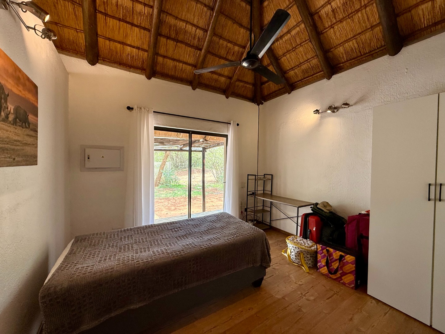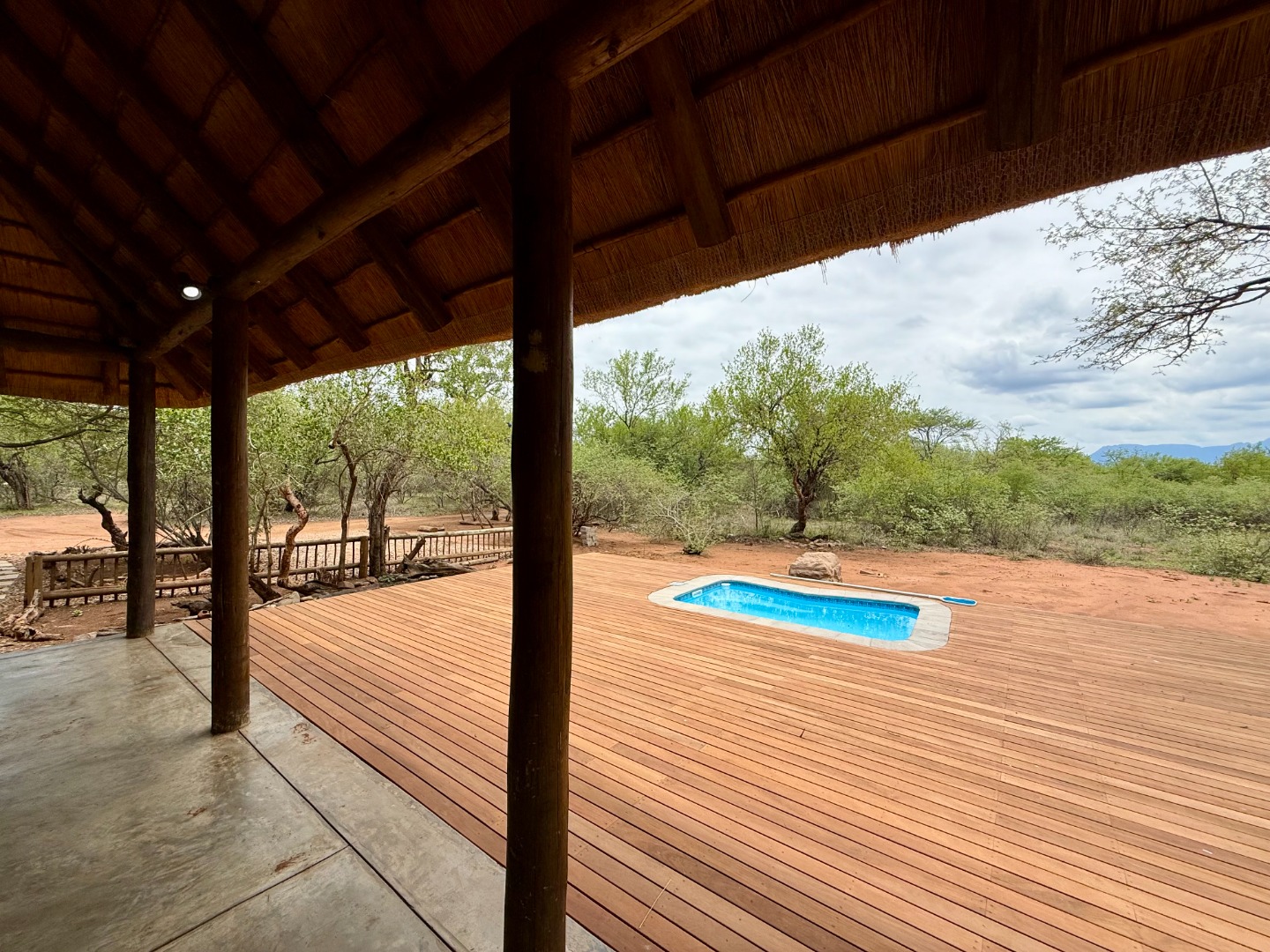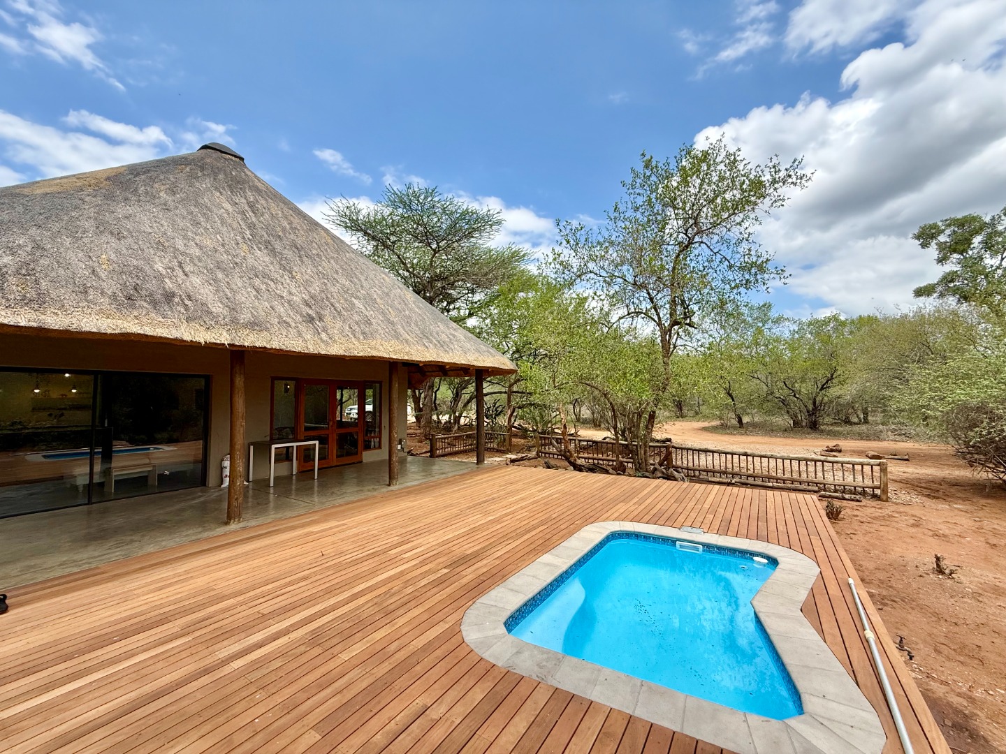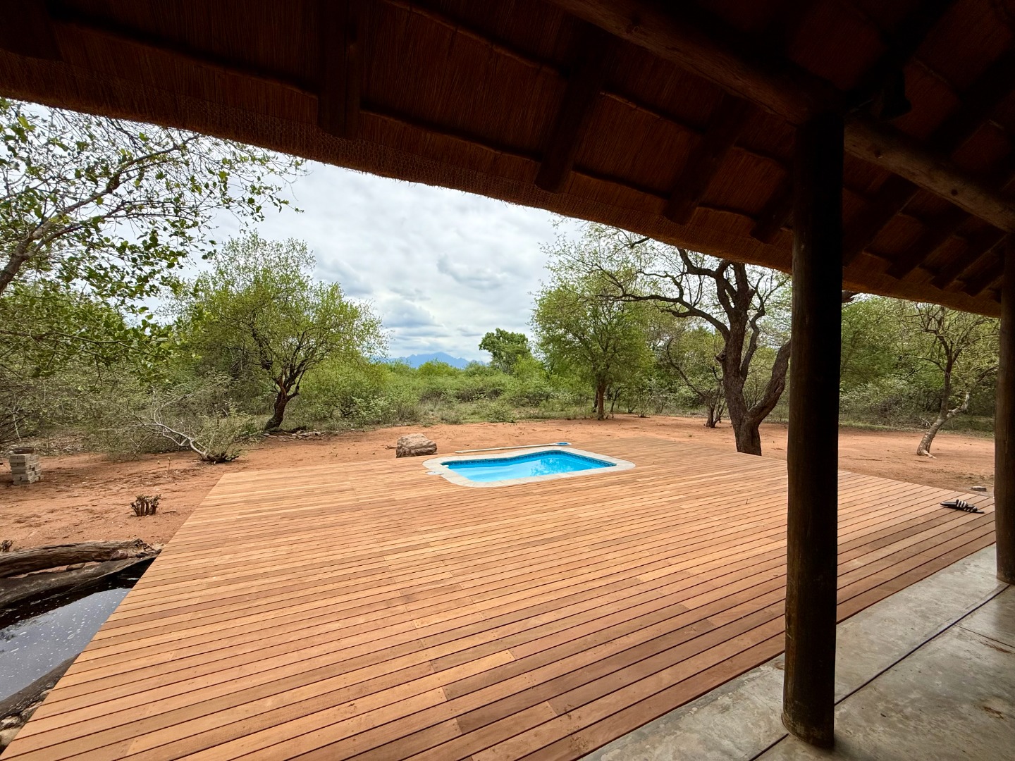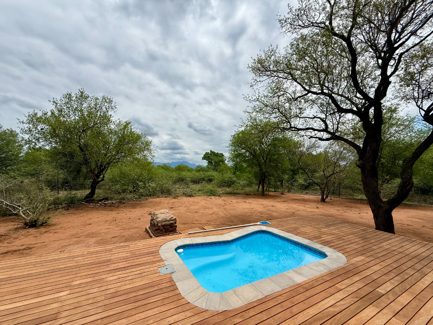 Step outside to embrace the quintessential bushveld lifestyle. The property features an expansive wooden deck, perfect for relaxation and entertaining, complemented by a refreshing plunge pool. A covered patio, lapa, and built-in braai area provide ideal settings for outdoor dining and social gatherings, all set within a private garden with scenic views. Comfort is assured with air conditioning throughout and a cosy fireplace for cooler evenings. Additional practicalities include a laundry area and ample storage.